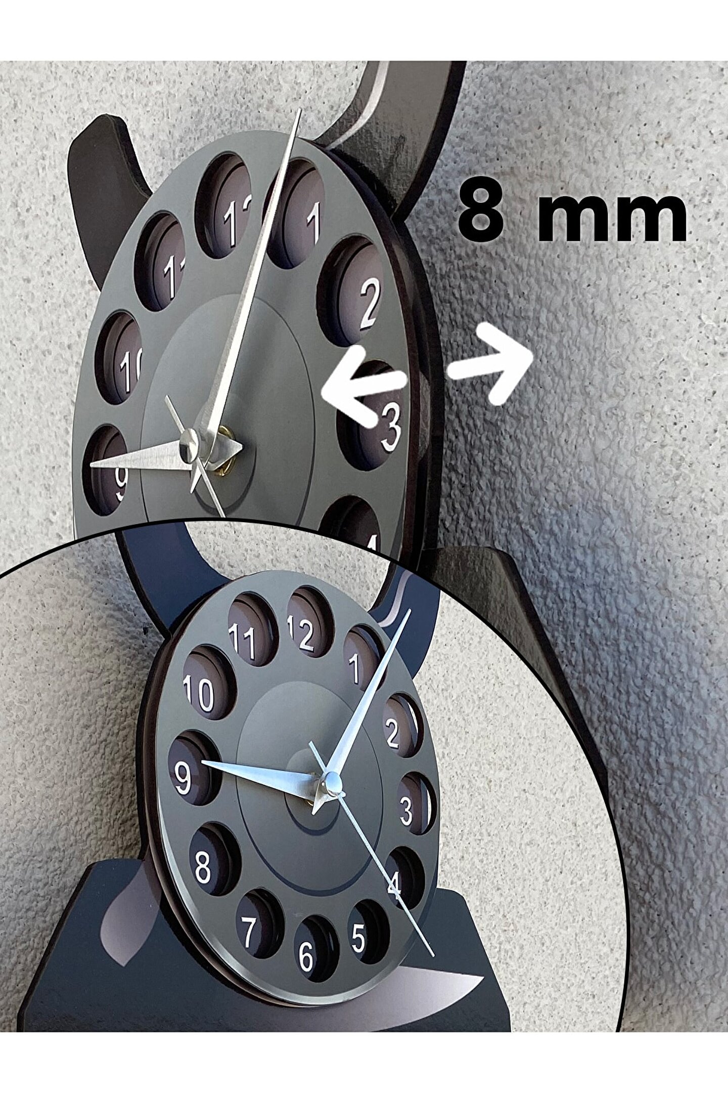 Goodtime Nostaljik Telefon Dekoratif Sarkaçlı Duvar Saati ; Lütfen taklitlerden kaçınınız. Saatin markası "goodtime" dır. ; Ürün özellikleri: ; - 1. Kalite Ahşap Mdf Malzemeden üretilmiştir. ; - Ürün tamamen el yapımı (hand made) olup,yüksek kaliteli baskı ile üretilmektedir. ; - 2 adet AA pil ile çalışır. ; - 1 adet pil, saati çalıştırır; diğer pil sarkacıhareket ettirir. ; - Her saniyede “Telefon Ahizesi” sağa solahareket eder. ; - Mekanizması yüksek kaliteli sessiz (quartz)çalışan akar saattir. ; - Saat üzerindeki akrep, yelkovan ve saniyemetal malzemedir. ; - Montaj şekli: Duvar çivisi ; - Montaja hazır özel askı aparatı ile bir çiviveya vidayla duvara kolayca sabitleyebilirsiniz. ; -Mutfak, oturma odası,çocuk odası,salon ve özel günlerinizde hediye olarak tercih edebileceğiniz dekoratif duvar saatidir. ; Ürün ebatları: ; Sarkaç Dahil Yükseklik: 50 cm ; Genişlik : 24 cm ; Derinlik : 4 cm ;