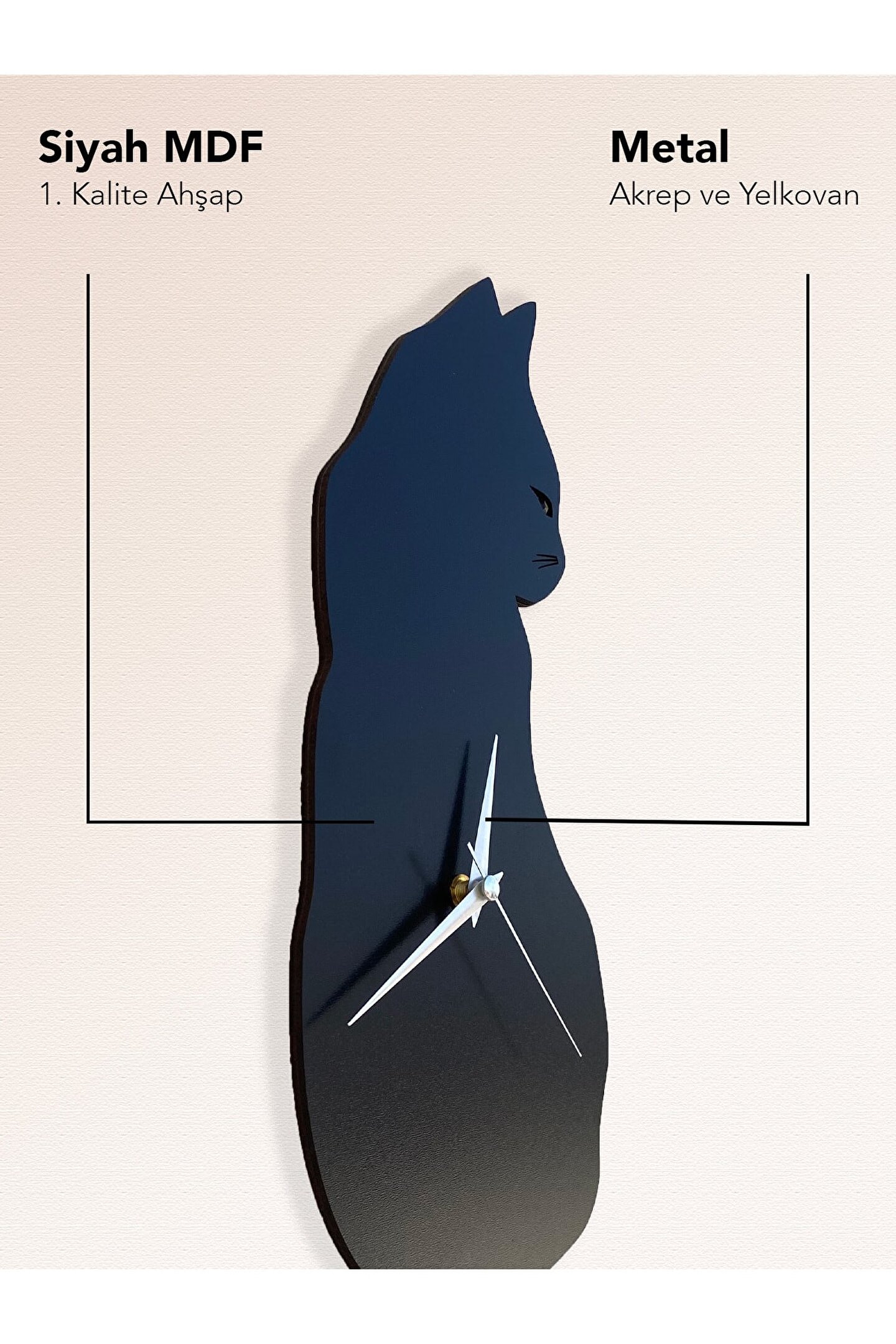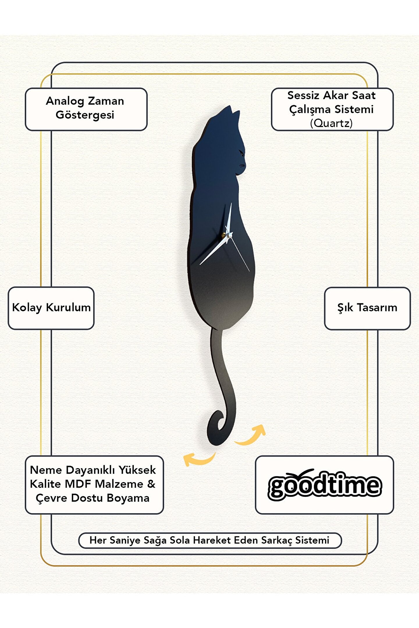 Goodtime Siyah Kedi Dekoratif Sarkaçlı Duvar Saati ; Lütfen taklitlerden kaçınınız. Saatin markası "goodtime" dır. ; Ürün özellikleri: ; - 1. Kalite Ahşap Mdf Malzemeden üretilmiştir. ; - Ürün tamamen el yapımıdır. (hand made) ; - 2 adet AA pil ile çalışır. ; - 1 adet pil, saati çalıştırır; diğer pil sarkacı hareketettirir. ; - Her saniyede “kuyruk” sağa sola hareketeder. ; - Kadranlı ve kadransız olmak üzere 2 çeşidi mevcuttur. ; - Mekanizması yüksek kaliteli sessiz (quartz) çalışanakar saattir. ; - Saat üzerindeki akrep, yelkovan ve saniye metalmalzemedir. ; - Montaj şekli: Duvar çivisi ; - Montaja hazır özel askı aparatı ile bir çivi veyavidayla duvara kolayca sabitleyebilirsiniz. ; -Mutfak, oturma odası,çocuk odası,salon ve özel günlerinizde hediye olarak tercih edebileceğiniz dekoratif duvar saatidir. ; Ürün ebatları: ; Sarkaç Dahil Yükseklik: 53 cm ; Genişlik : 16 cm ; Derinlik : 4 cm ; ;