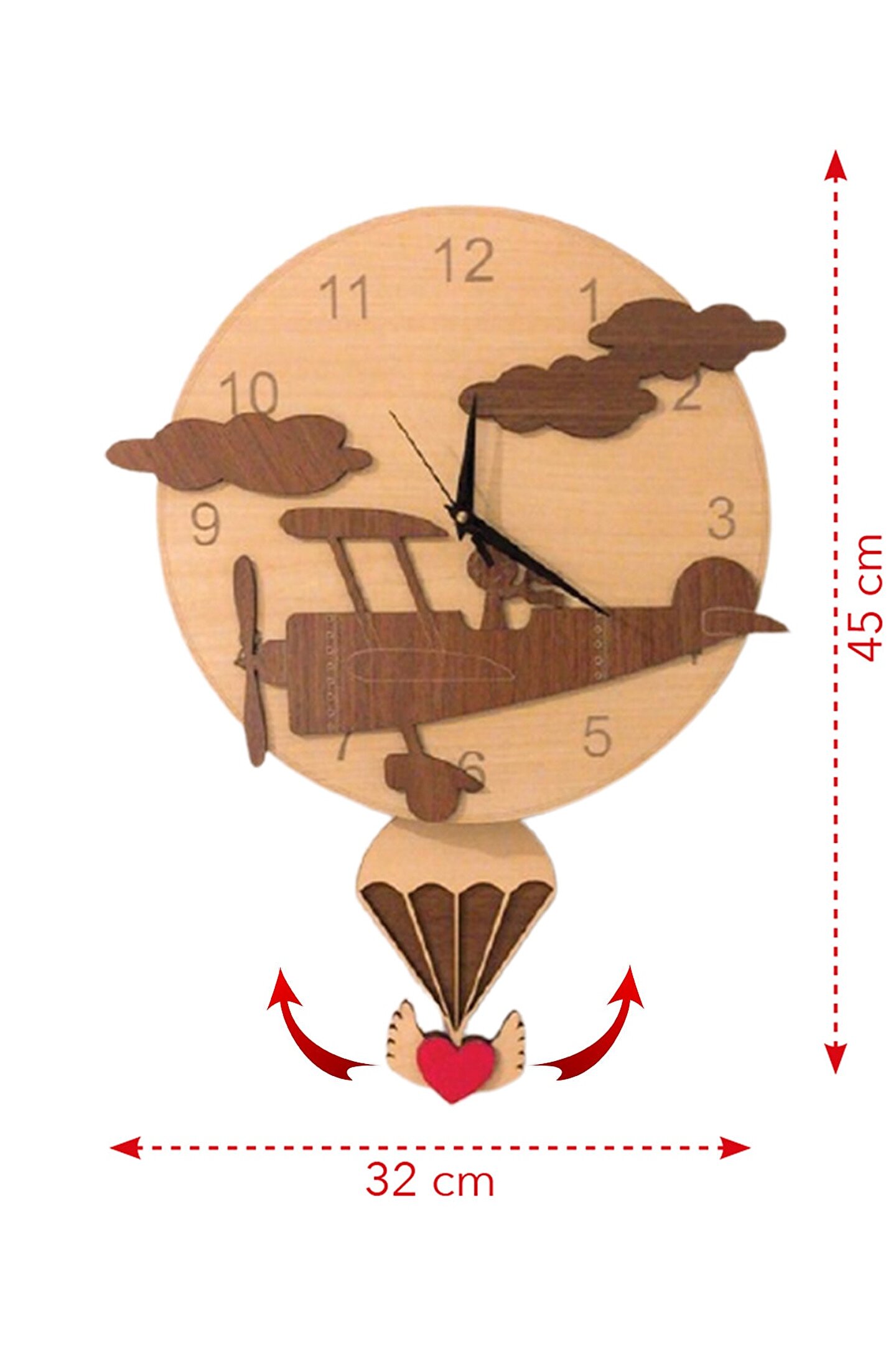 Goodtime Uçak Dekoratif Sarkaçlı Duvar Saati ; Lütfen taklitlerden kaçınınız. Saatin markası "goodtime" dır. ; Ürün özellikleri: ; - 1. Kalite Ahşap Mdf Malzemeden üretilmiştir. ; - Ürün tamamen el yapımıdır. (hand made) ; - 2 adet AA pil ile çalışır. ; - 1 adet pil, saati çalıştırır; diğer pil sarkacıhareket ettirir. ; - Her saniyede “Paraşüt” sağa sola hareketeder. ; - Mekanizması yüksek kaliteli sessiz (quartz)çalışan akar saattir. ; - Saat üzerindeki akrep, yelkovan ve saniyemetal malzemedir. ; - Montaj şekli: Duvar çivisi ; - Montaja hazır özel askı aparatı ile bir çiviveya vidayla duvara kolayca sabitleyebilirsiniz. ; -Mutfak, oturma odası,çocuk odası,salon ve özel günlerinizde hediye olarak tercih edebileceğiniz dekoratif duvar saatidir. ; Ürün ebatları: ; Sarkaç Dahil Yükseklik: 45 cm ; Genişlik : 32 cm ; Derinlik : 4 cm ; Mdf Kalınlığı: 4 mm ;