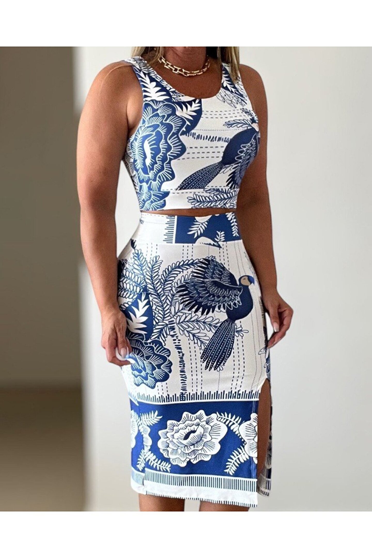 EQURİ Kadın Sıfır Kollu Yuvarlak Yaka çiçekli Desenli Süprem Crop Ve Yırtmaçlı Etek Ikili Takım