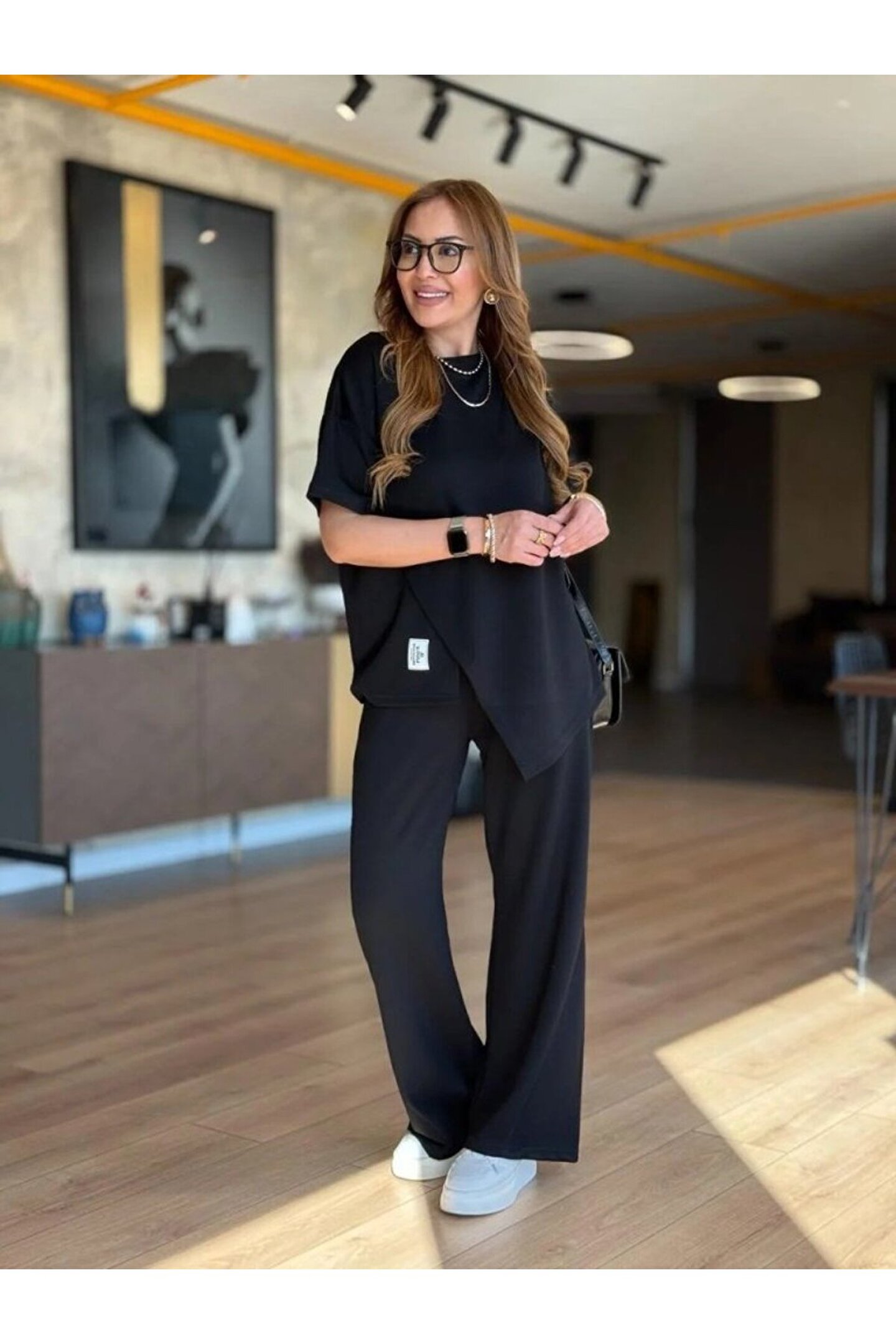 Kadın Kısa Kollu Bisiklet Yaka Asimetrik Viskon Iki Iplik Bluz Ve Pantolon Ikili Takım