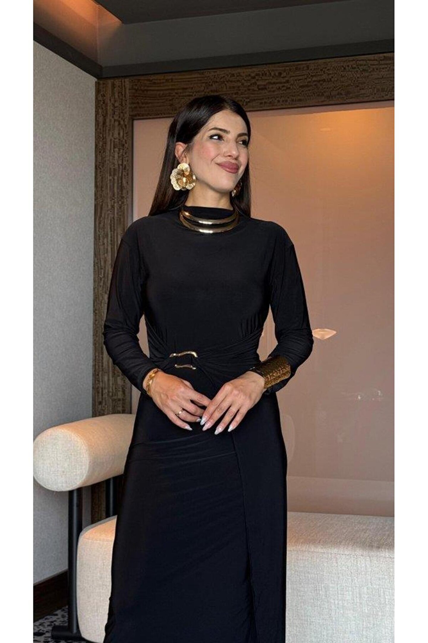 goopall Kadın Balıkçı Yaka Toka Detay Sandy Kumaş Midi Boy Elbise