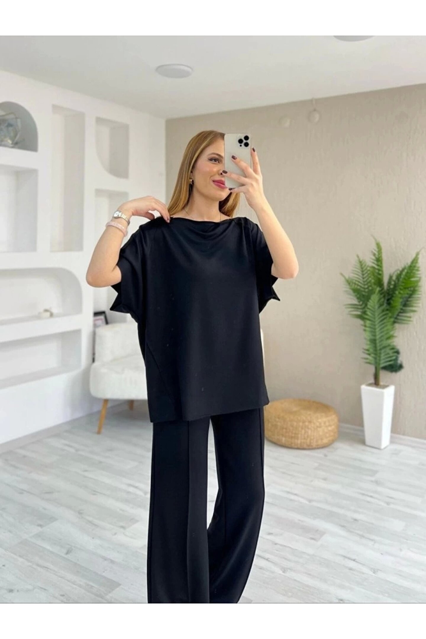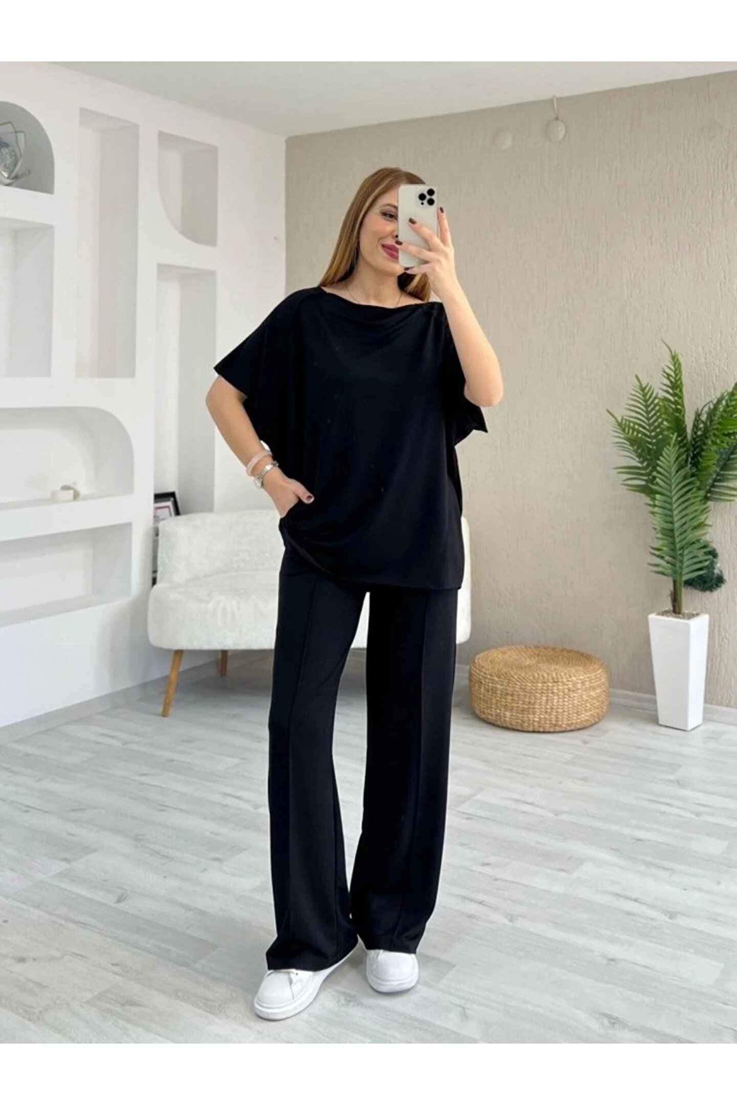 goopall Kadın Kısa Kollu Kayık Yakalı Dikiş Izi Detaylı Viskon Iki Iplik Bluz Ve Pantolon Ikili Takım