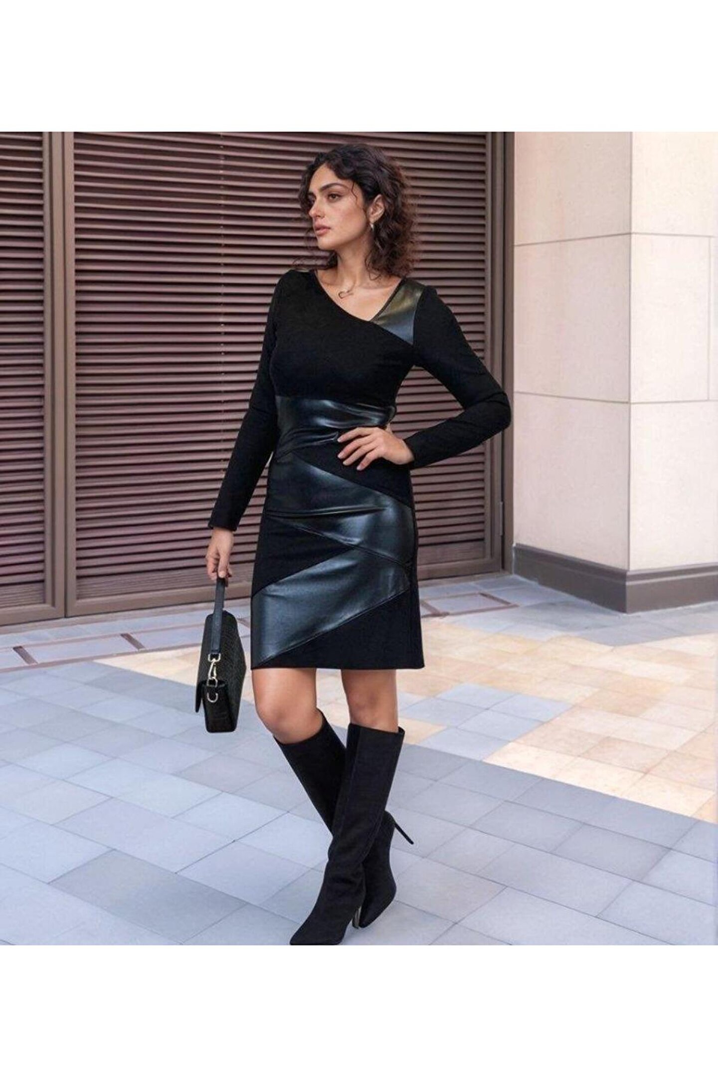 goopall Kadın Uzun Kollu Asimetrik Yaka Süet Ve Deri Mini Boy Elbise