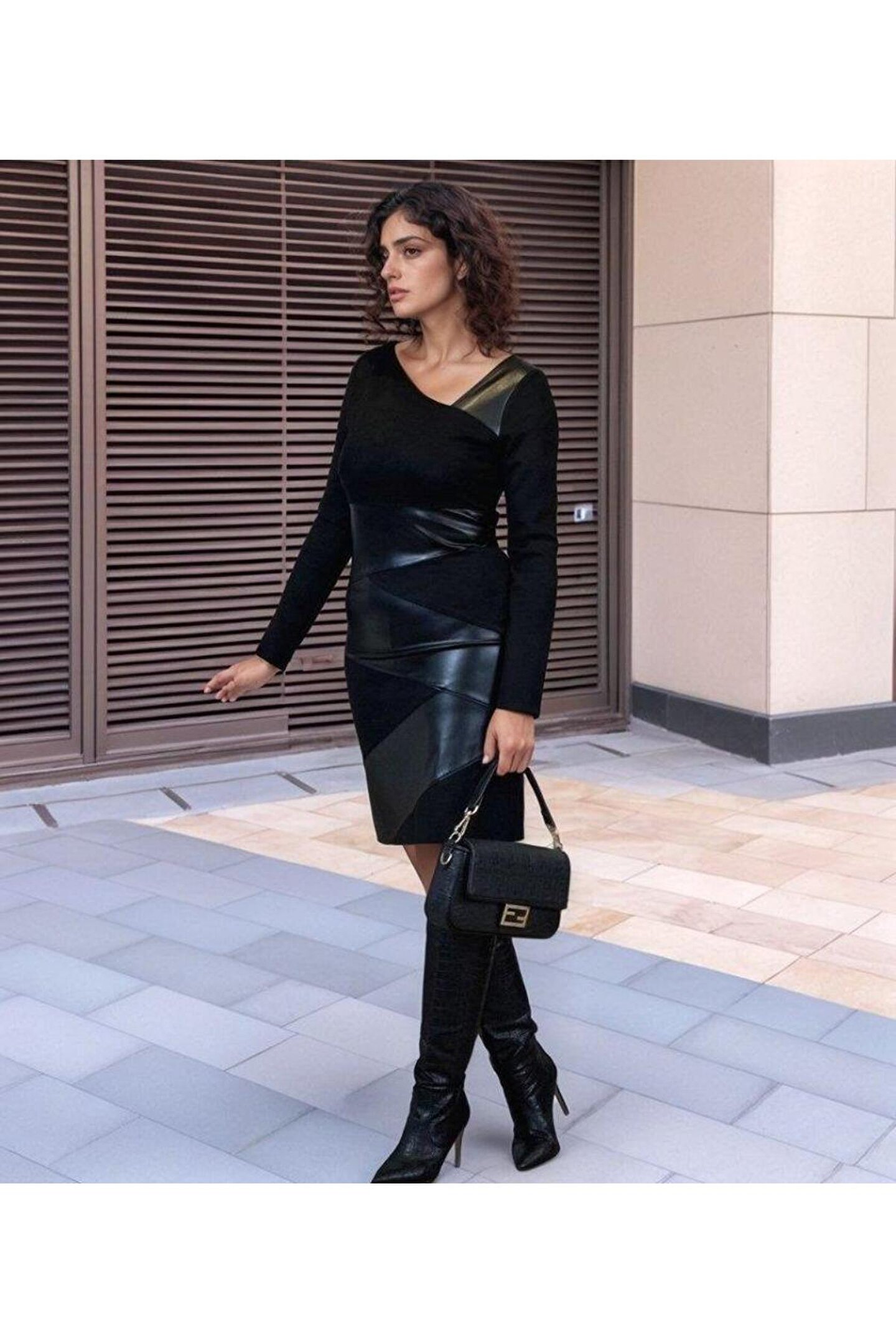 Kadın Uzun Kollu Asimetrik Yaka Süet Ve Deri Mini Boy Elbise