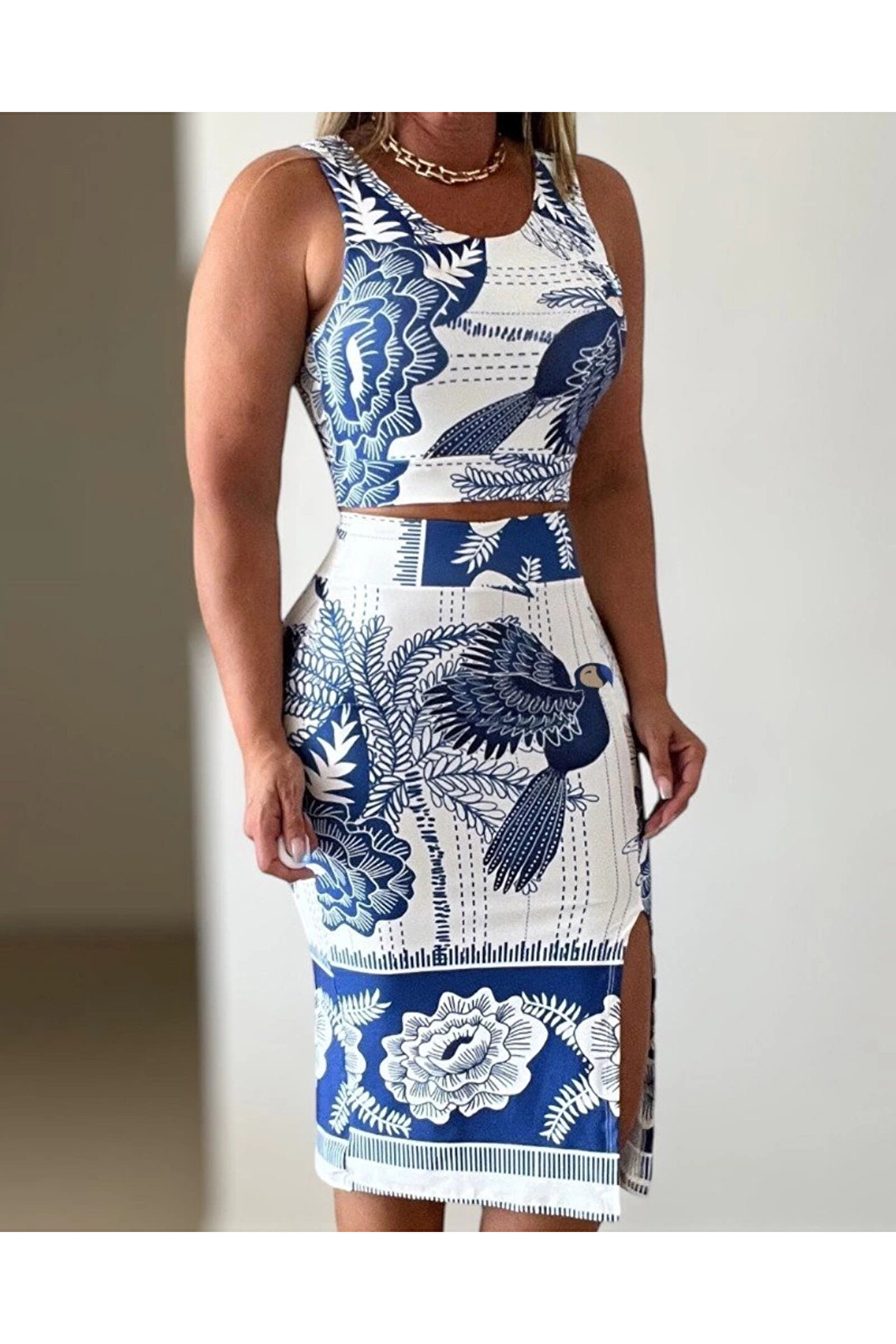 goopall MDB Kadın Sıfır Kollu Yuvarlak Yaka çiçekli Desenli Süprem Crop Ve Yırtmaçlı Etek Ikili Takım