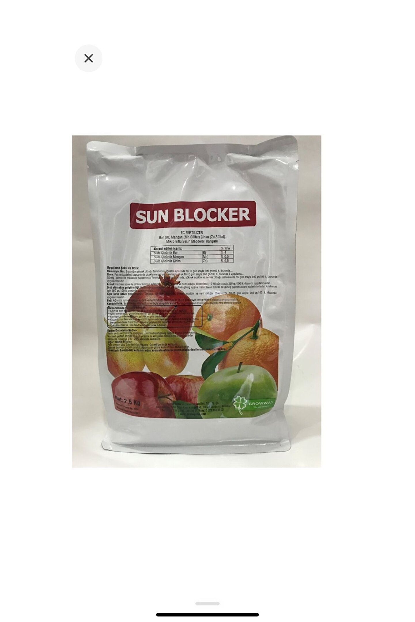 SUN BLOCKER SUN BLOCKER kozmetik bir fonksiyona sahiptir. ; Bu özelliğinden dolayı daha kaliteli, albenisi yüksek, pazarlama kolaylığı olan ürünler elde edilebilir. ; Sun Blocker meyve yüzeyini şeffaf bir film tabakası ile kaplayarak güneşin zararlı ve yakıcı etkisine karşı koruma sağlar. ; Ayrıca içeriğinde bulunan iz elementler sayesinde besleme özelliği olan özel bir karışımdır. ; Özellikle narenciye, elma, armut ve nar için geliştirilmiş spesifik bir ürün olup, meyvelerin kabukların da, genellikle aşırı nemden ve aşırı güneşten meydana gelen lekelenmeleri önler. ; UYGULAMA ŞEKLİ VE DOZU Narenciye, Nar: Sıcaklığın yüksek olduğu Temmuz ve Ağustos aylarında 10-15 arayla 500 gr./100 lt. ; dozunda… Elma: Pas mücadelesi kapsamında çiçeklenme periyodu ile başlayarak 10-15 gün arayla 250 gr./100 lt. ; dozunda 3 uygulama yapılmalı. ; Güneş yanığı ile mücadele kapsamında Temmuz ve Ağustos aylarında, yüksek sıcaklık ve nemin olduğu dönemlerde 15 gün arayla 500 gr./100 lt. ; dozunda uygulanmalıdır… Armut: Haziran sonu ile birlikte Temmuz aylarında, yüksek sıcaklık ve nem o olduğu dönemlerde 10-15 gün arayla 250 gr./100 lt. ; dozunda uygulanmalıdır… Örtü altı sebze yetiştiriciliği: Havalandırma pencerelerine yakın direk güneş ışığına maruz kalan bitkiler de güneş ışığının zararlı etkilerini ortadan kaldırmak için 250 gr./100 lt. ; dozunda uygulanmalıdır… Açık tarla sebze yetiştiriciliği:Temmuz, ağustos aylarında, yüksek sıcaklık ve nem o olduğu dönemlerde 10-15 gün arayla 250 gr./100 lt. ; dozunda uygulanmalıdır… Karışabilirlik: Bakır, kükürt ve alkali reaksiyon gösteren ürünler haricinde bilinen tüm tarım ilaçları ve gübreler ile karışabilir ancak uygulamadan önce küçük dozlar da ön karışım testi yapmanız önerilir. ; Ambalaj: 2,5 kg. ; , 5 kg. ; İçerik Suda Çözünür Bor (B) % 4 Suda Çözünür Manganez (Mn) % 0,5 Suda Çözünür Çinko (Zn) % 0,5 Yoğunluk pH 6-7;