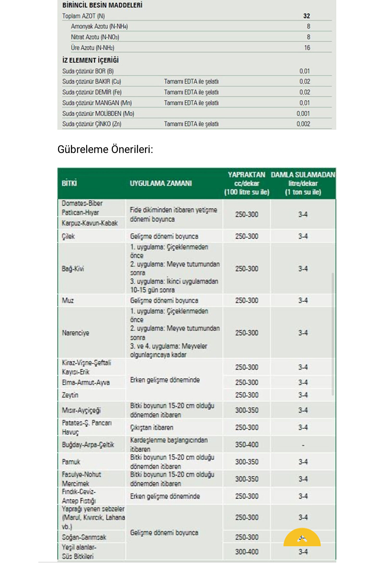 Güçlü Azot, Hızlı Gelişim! UAN-32, bitkilerin ihtiyacı olan yüksek oranda azotu üç formda (üre, amonyum ve nitrat) içeren güçlü bir sıvı gübredir.; Suda tamamen çözünür yapısıyla hem damlamadan hem yapraktan uygulanabilir.; Özellikle hızlı azot ihtiyacı olan dönemlerde etkili sonuç verir.; İçerik: •Toplam Azot (N): %32 •Üre Azotu (NH₂-N): %16 •Amonyum Azotu (NH₄-N): %8 •Nitrat Azotu (NO₃-N): %8 •Sıvı form – tamamen çözünür Ürün Özellikleri: •Bitkide anında alım, hızlı etki •Gelişme geriliği yaşayan bitkilerde toparlayıcı etki •Tüm tarla bitkileri, sebzeler, meyve ağaçları ve bağlarda kullanılabilir •Topraktan ve yapraktan uygulamaya uygundur •Diğer gübre ve pestisitlerle yüksek karışım uyumluluğu Uygulama Şekli: •Damlamadan: 2–4 lt/da •Yapraktan: 200–300 cc/100 lt su •Vegetatif gelişimin hızlı olduğu dönemlerde uygulanması önerilir.; Ambalaj: 20 LT sağlam plastik bidon – Tarla şartlarına dayanıklı, sızdırmaz, güneş ışığına karşı korumalı ambalaj