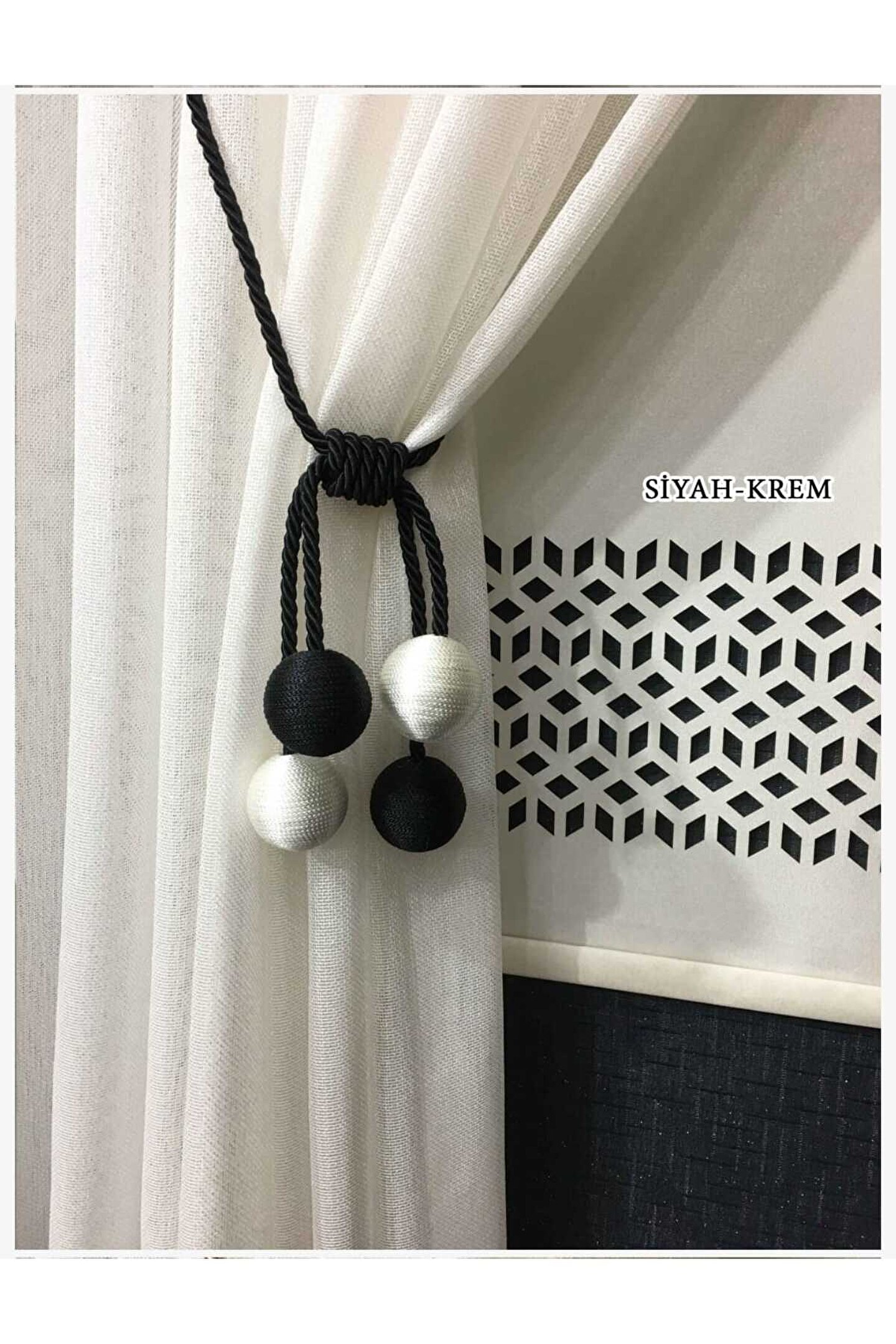 İki adet siyah ve krem renkli, şık ve modern tasarımıyla evinizin dekorasyonuna zarif bir dokunuş ekler; Polyester materyal kullanımı sayesinde uzun ömürlü ve dayanıklı bir kullanım sunar; Perde bağı olarak tasarlanmış olup, perdelerinizi kolayca açıp kapamanızı sağlar;
