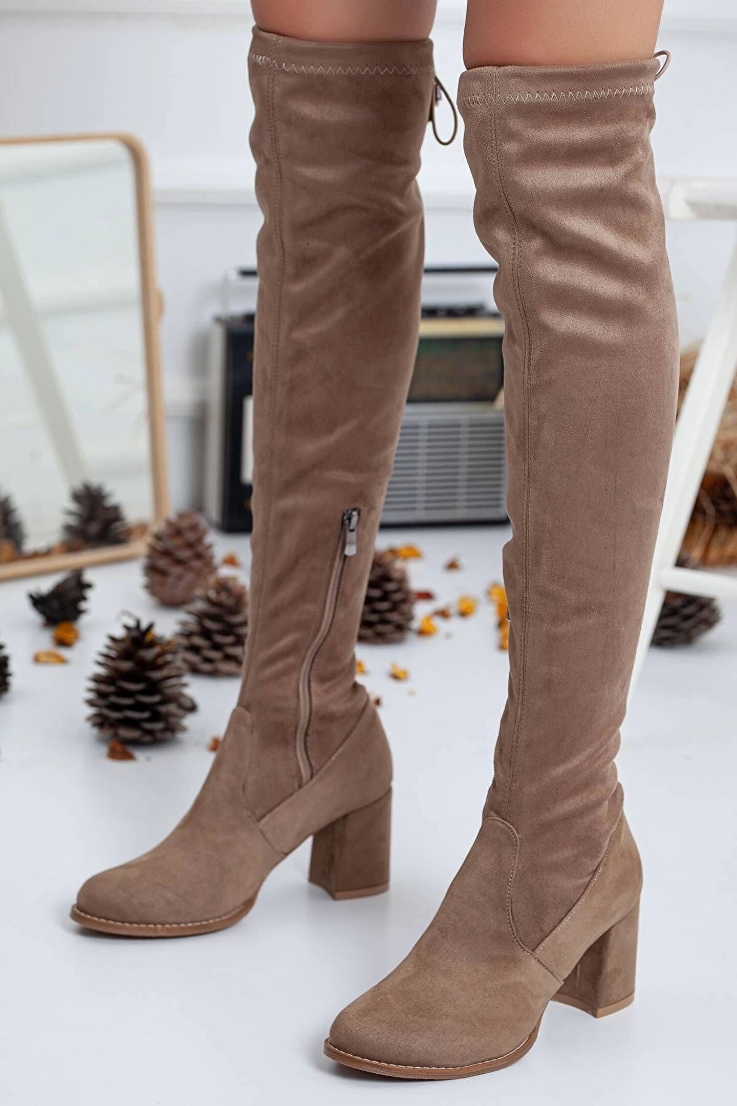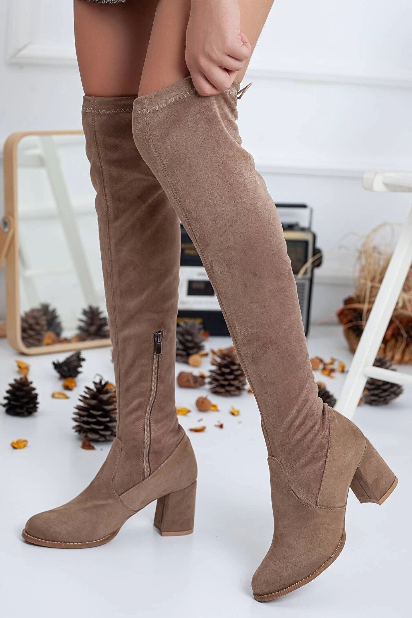 GULT Çorap Çizme, Diz Üstü Çizme Vizon Süet Topuklu Streç Ve Esnek Çizme.