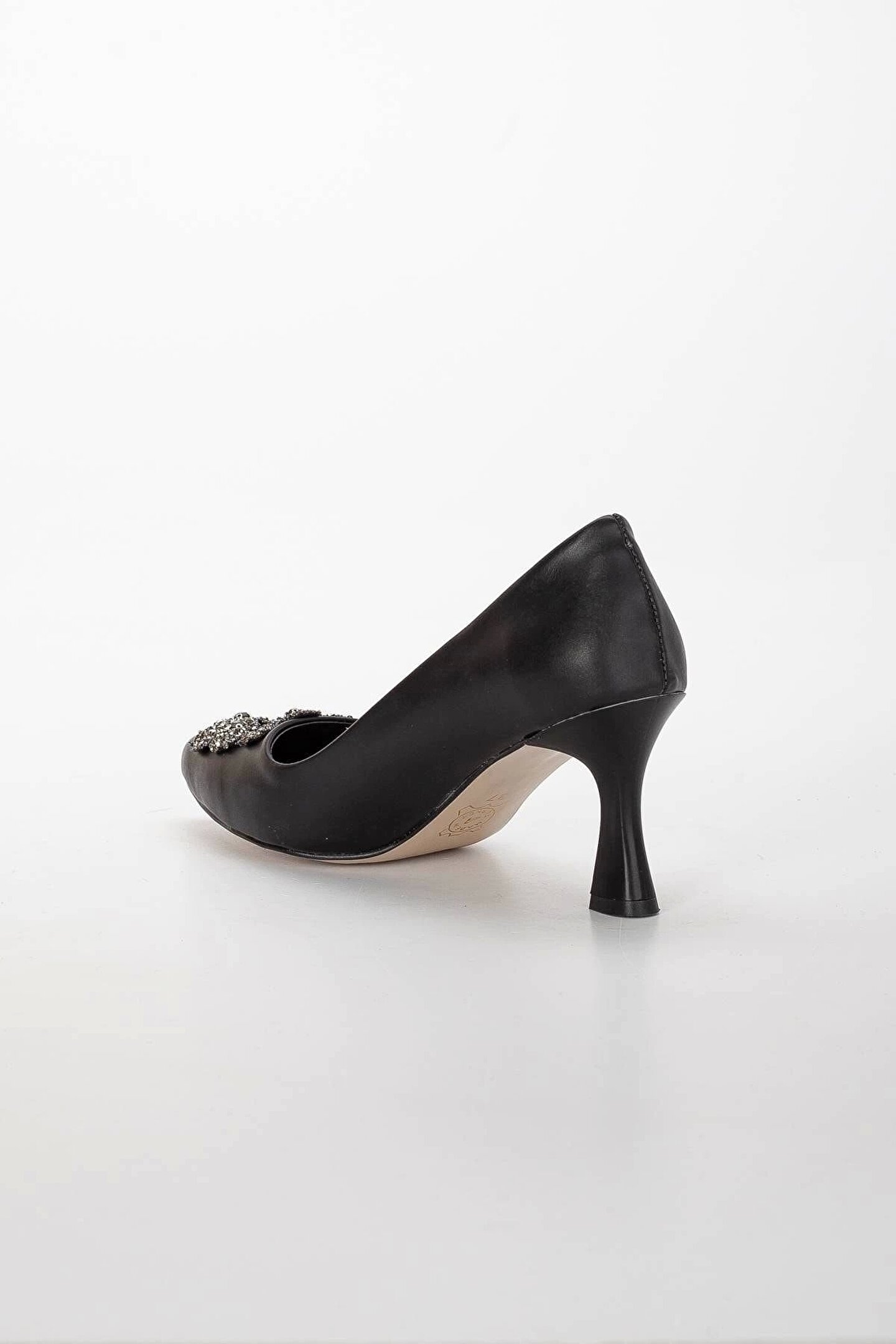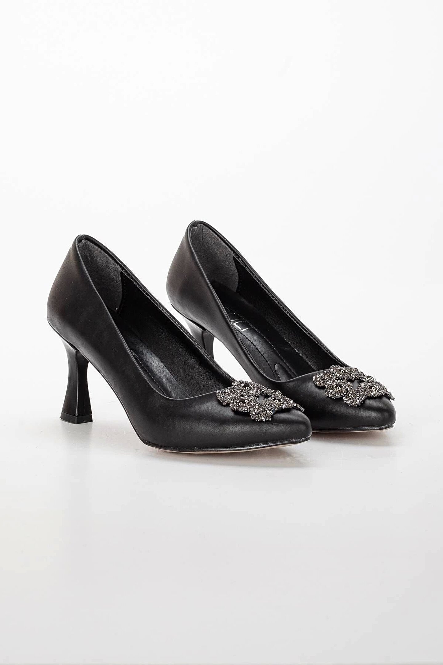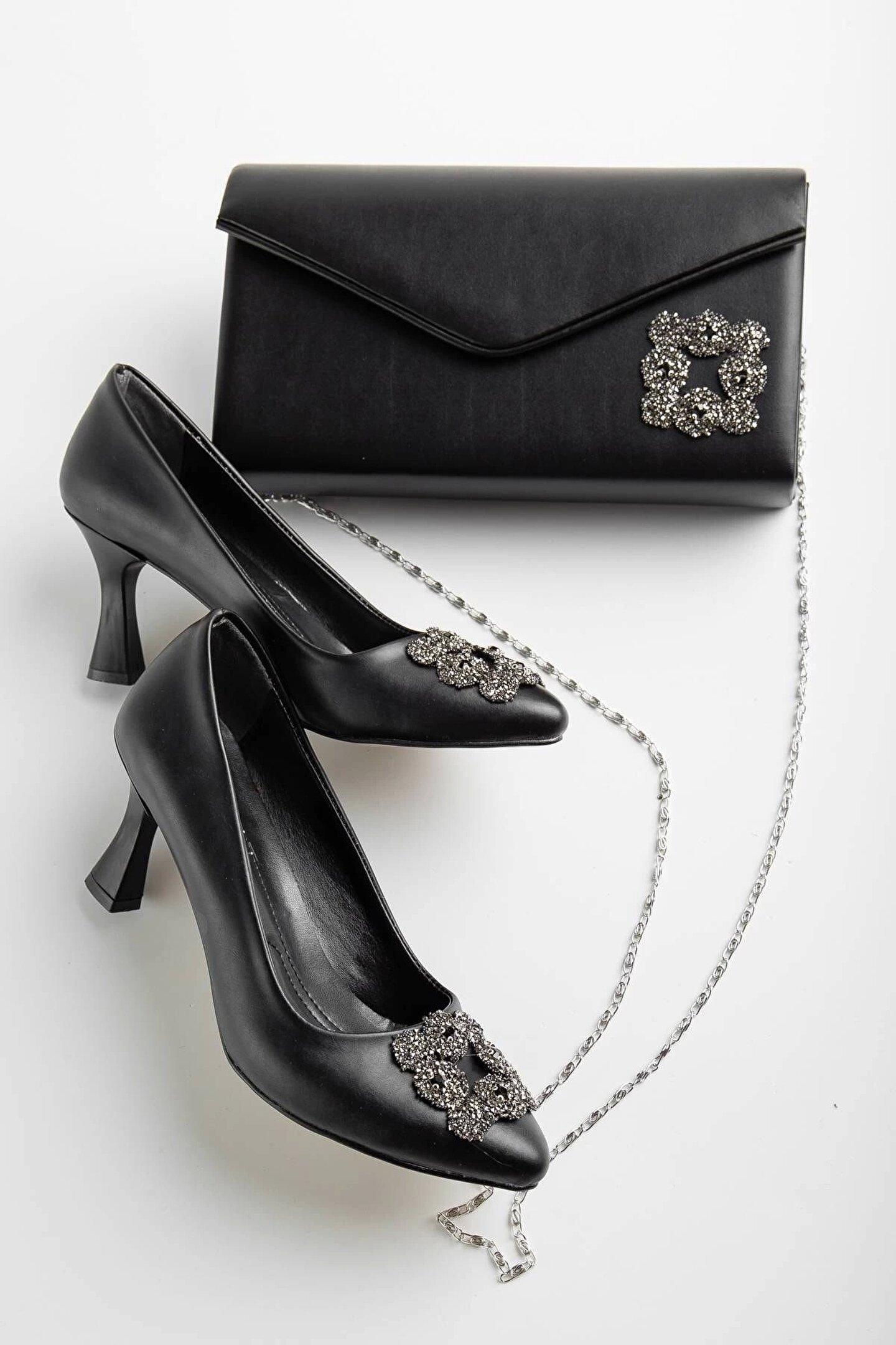 GULT Kadın 7 Cm Topuklu Siyah Cilt Taş Detaylı Çanta Kombinli Stiletto Takımı