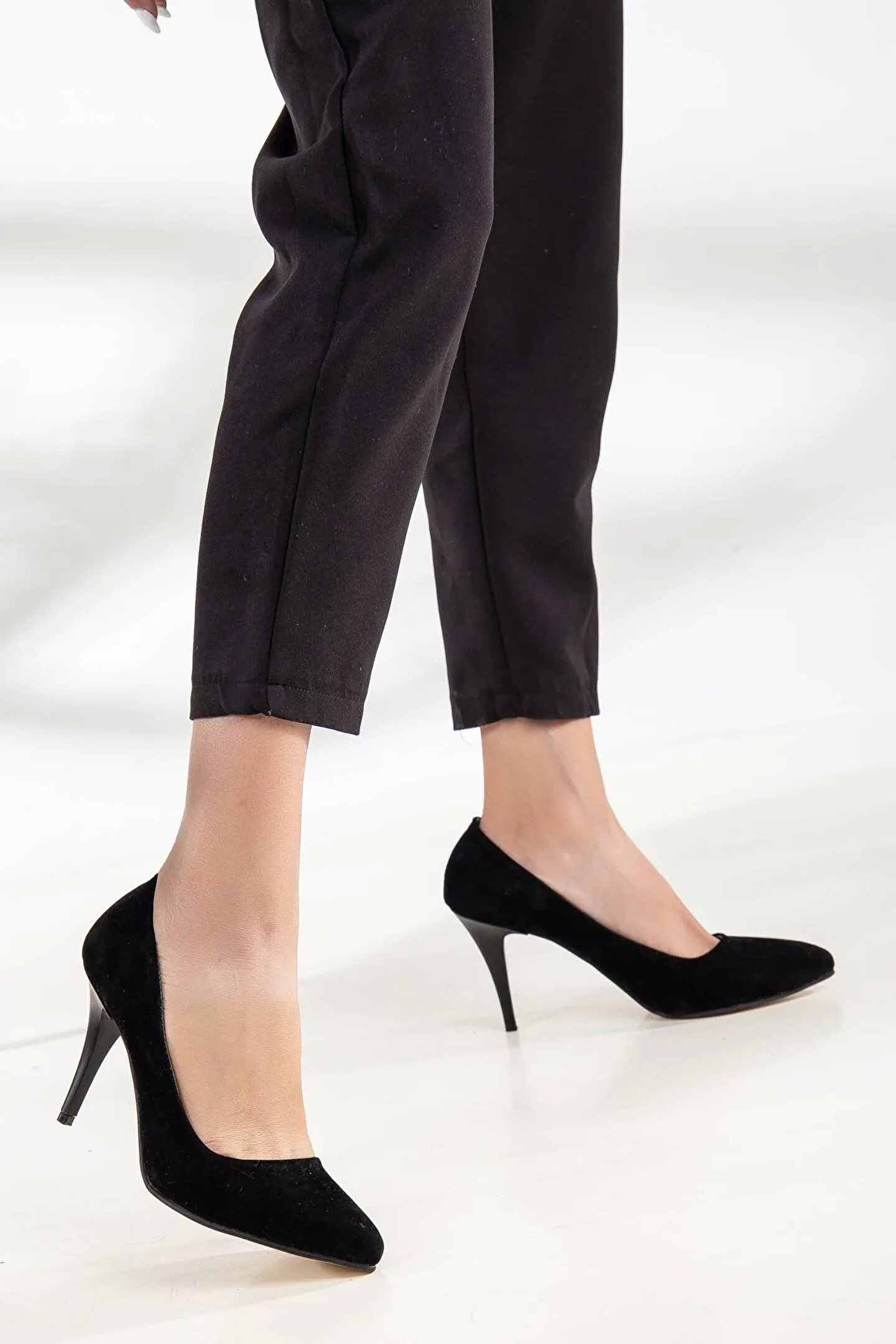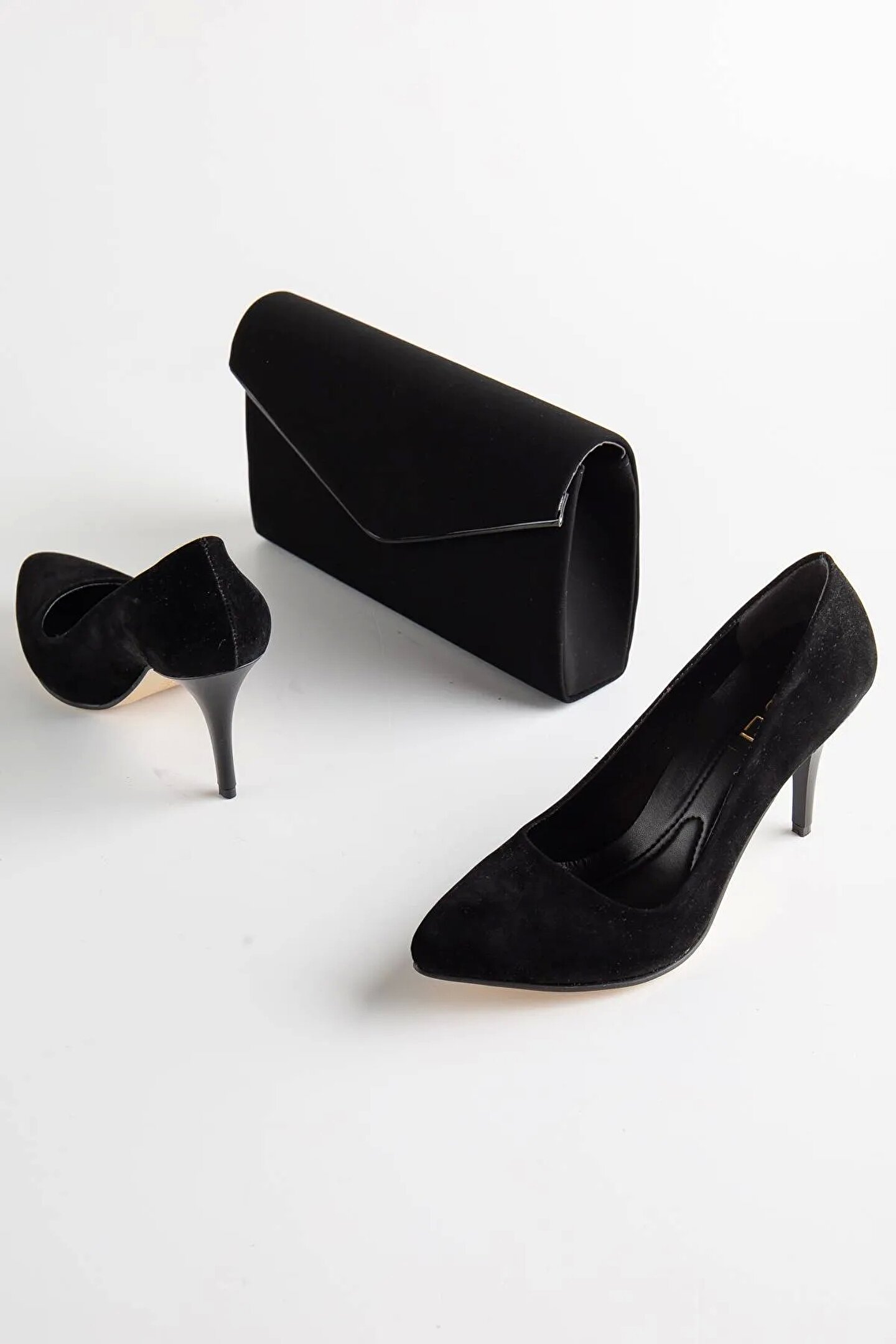 GULT Kadın 7 Cm Topuklu Siyah Süet Çanta Kombinli Stiletto Takımı
