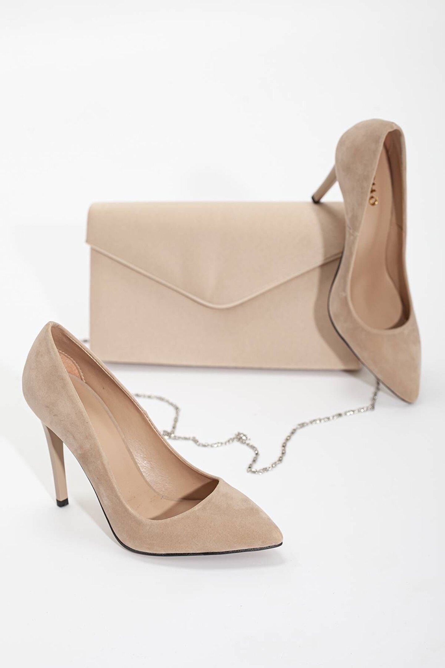 GULT Kadın Ince Yüksek Topuklu Stiletto Ve Çanta Takımı Ten Süet
