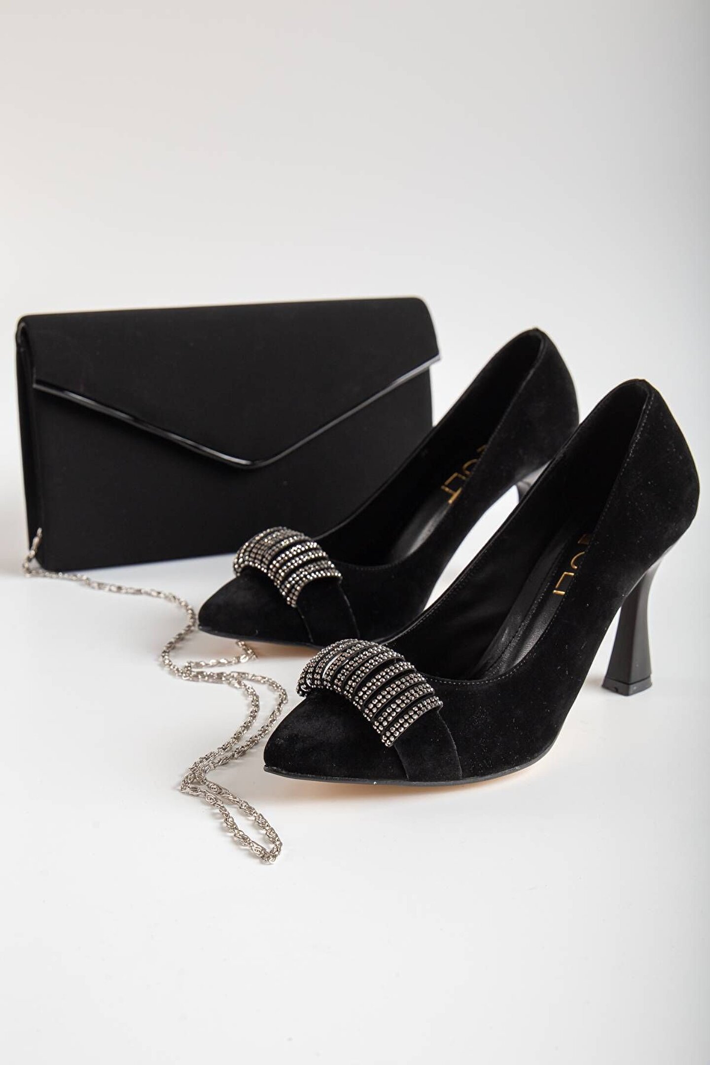 GULT Kadın 9 cm Topuklu Siyah Süet Çanta Kombinli Stiletto Takımı