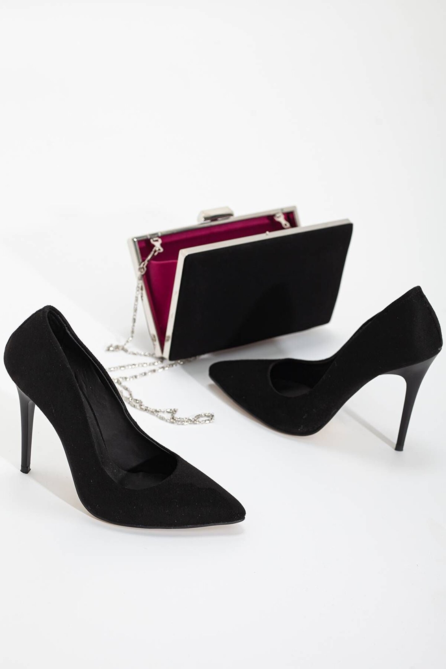 GULT Kadın Ince Yüksek Topuklu Stiletto Ve Çanta Takımı Siyah Süet