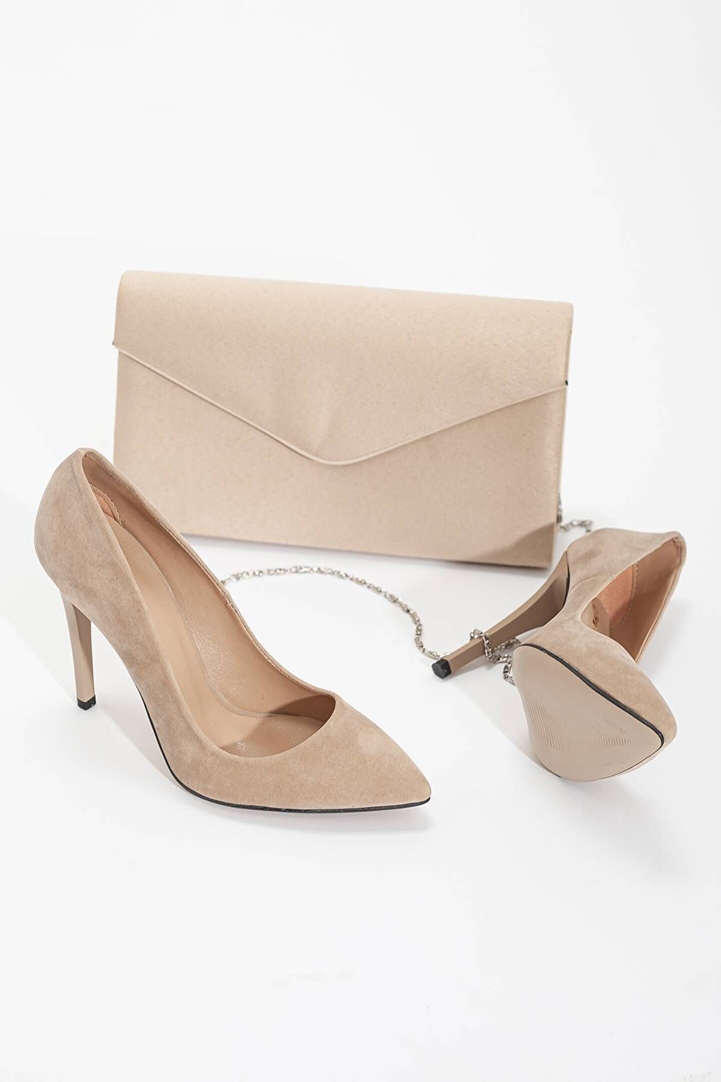 GULT Kadın Ince Yüksek Topuklu Stiletto Ve Çanta Takımı Ten Süet