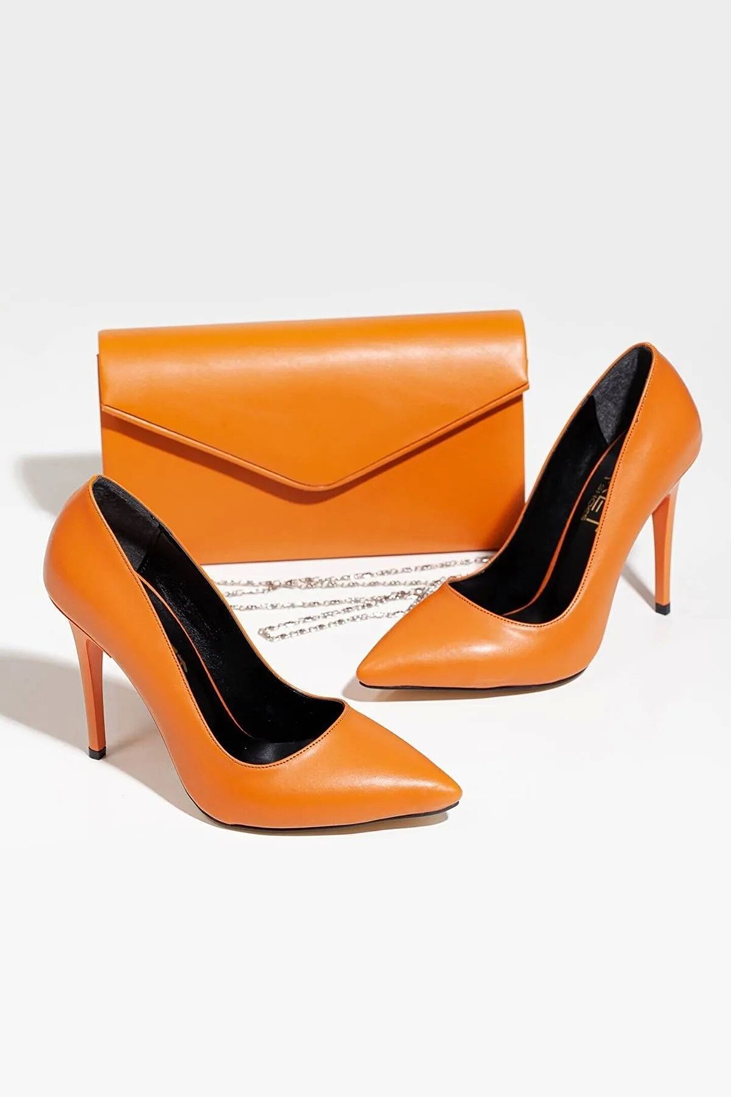 Kadın Ince Yüksek Topuklu Stiletto Ve Çanta Takımı Turuncu