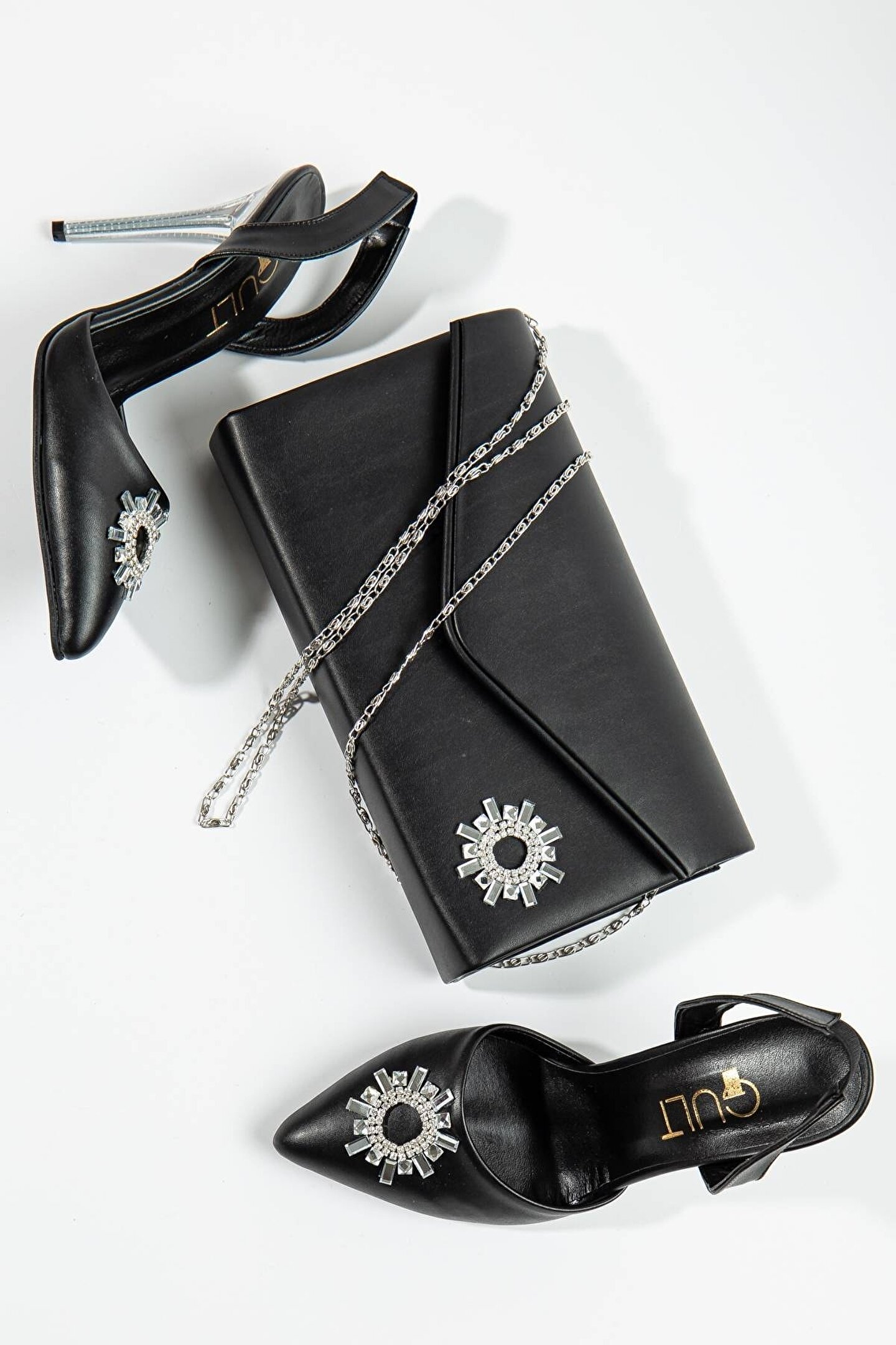 GULT Kadın Ince Yüksek Topuklu Taş Detaylı Dyakkabı Ve Çanta Takımı Siyah Cilt
