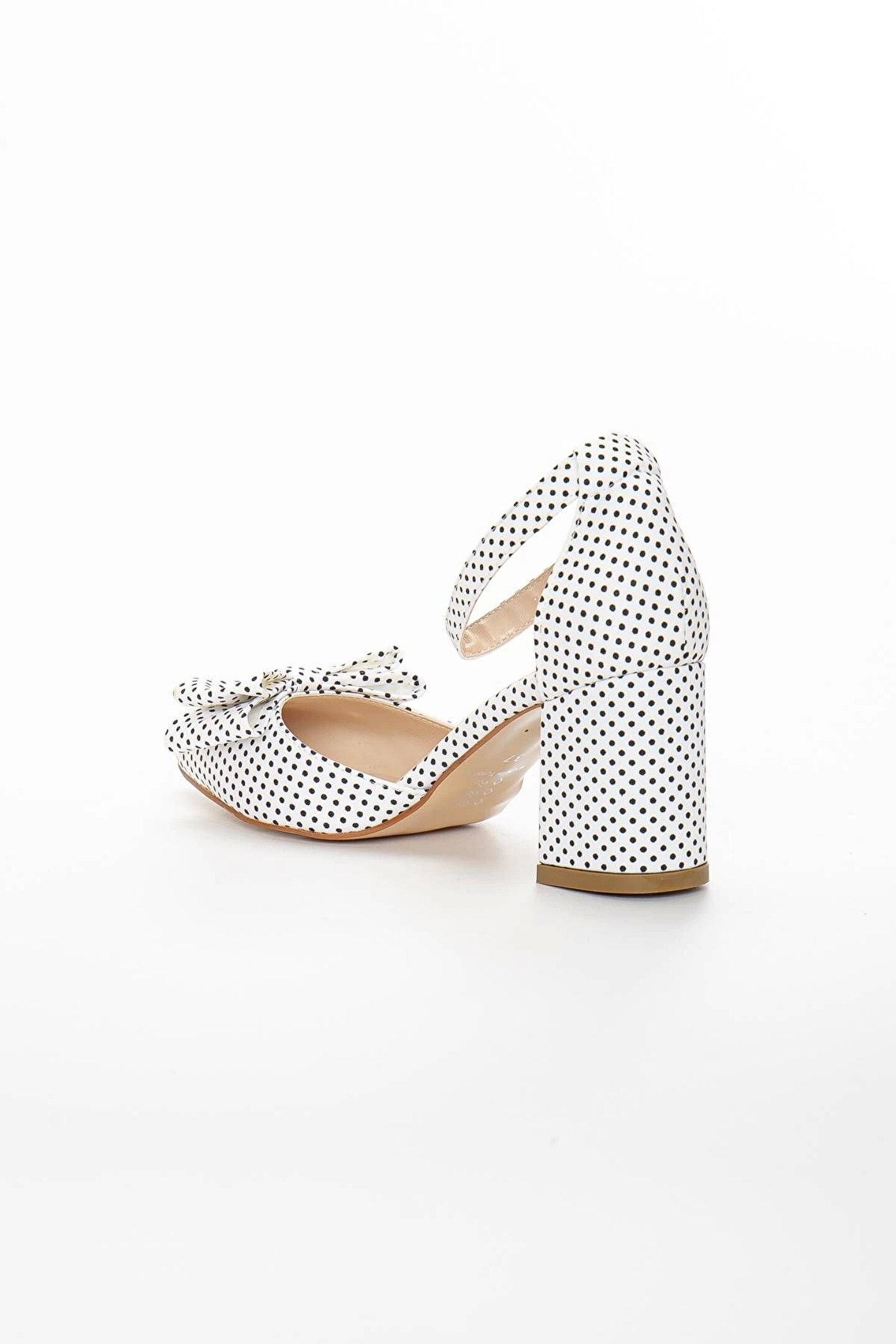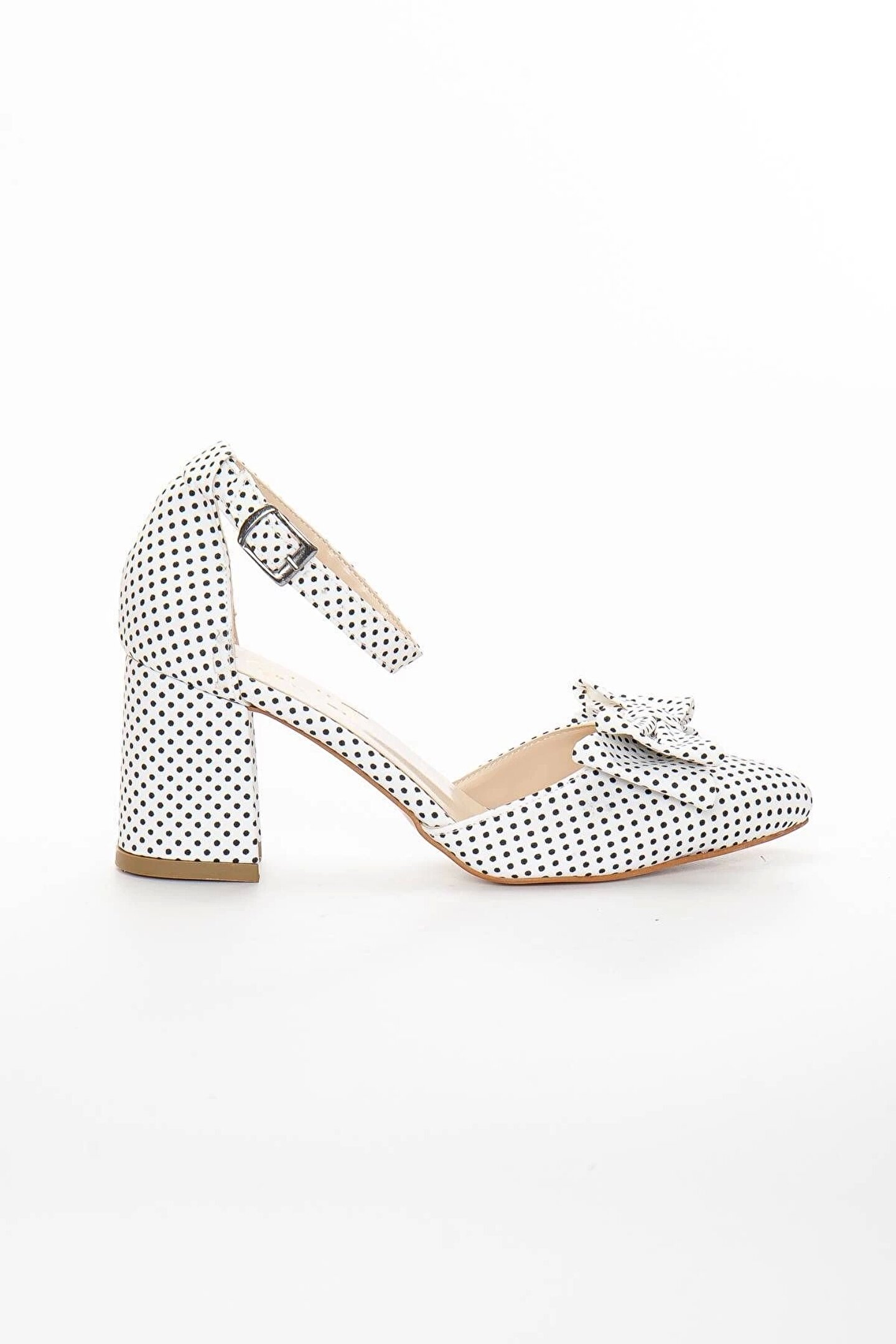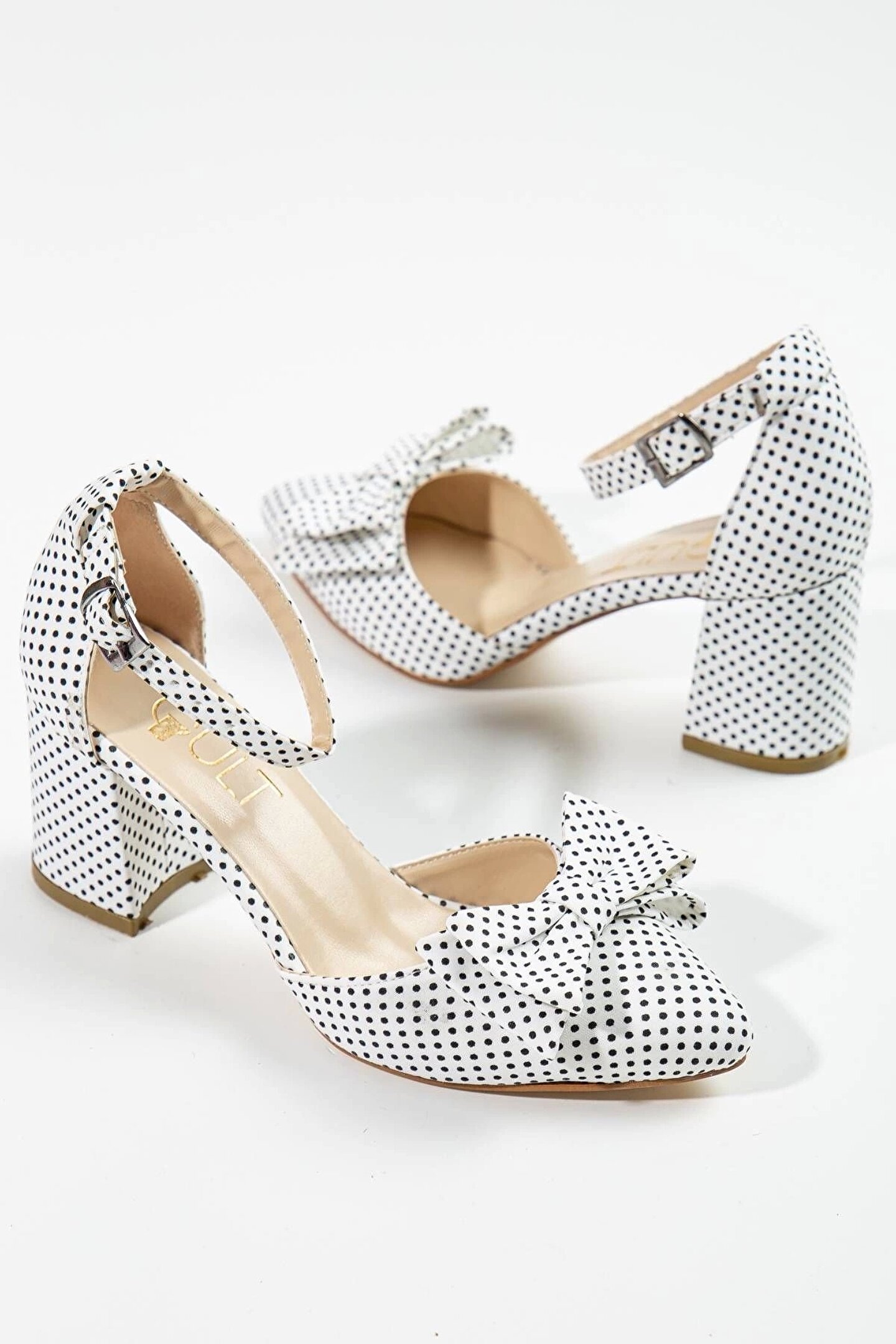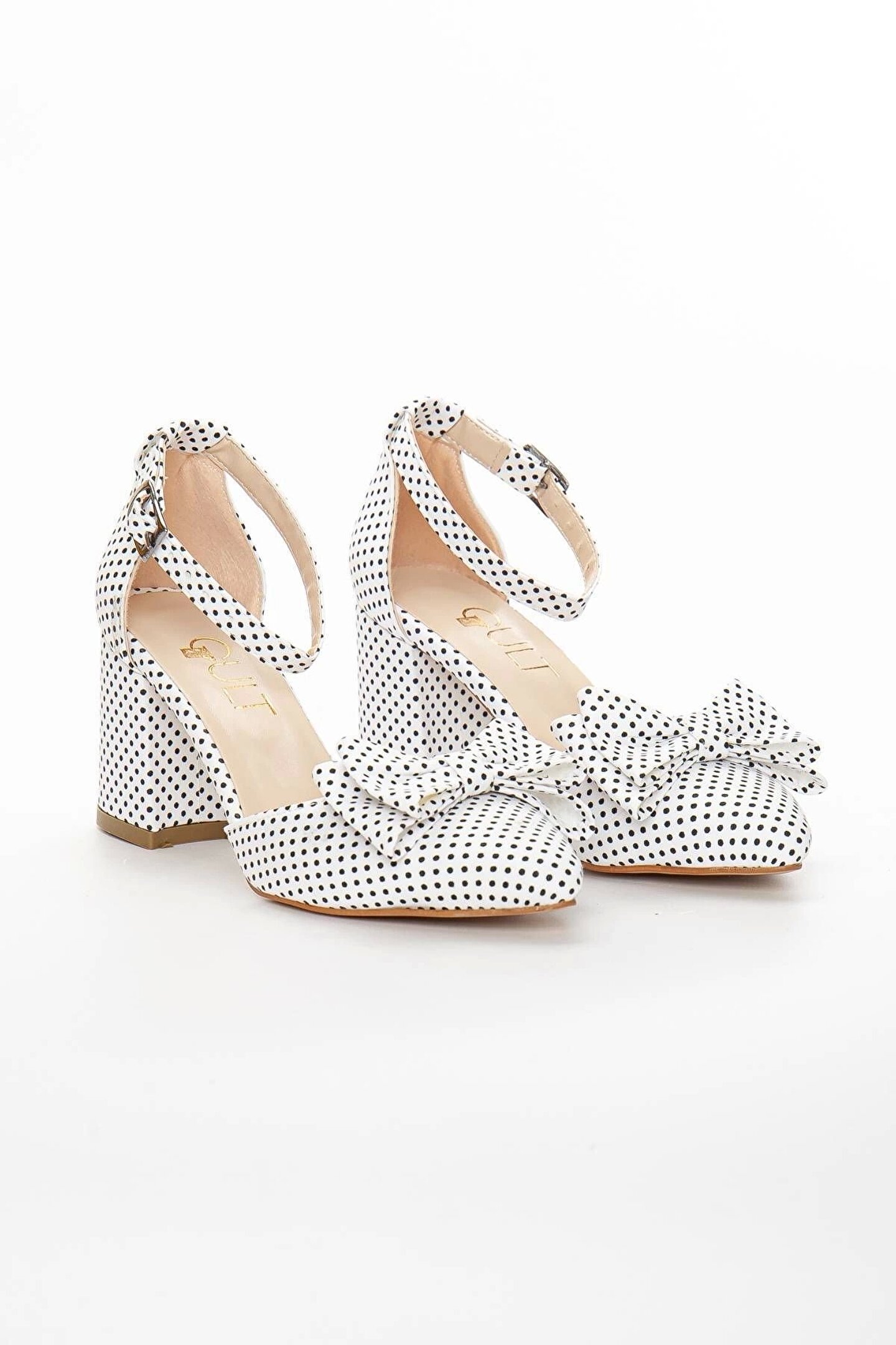 GULT Kadın Kalın Kısa Topuklu Papyonlu Yazlık Ayakkabı Beyaz Puantiyeli
