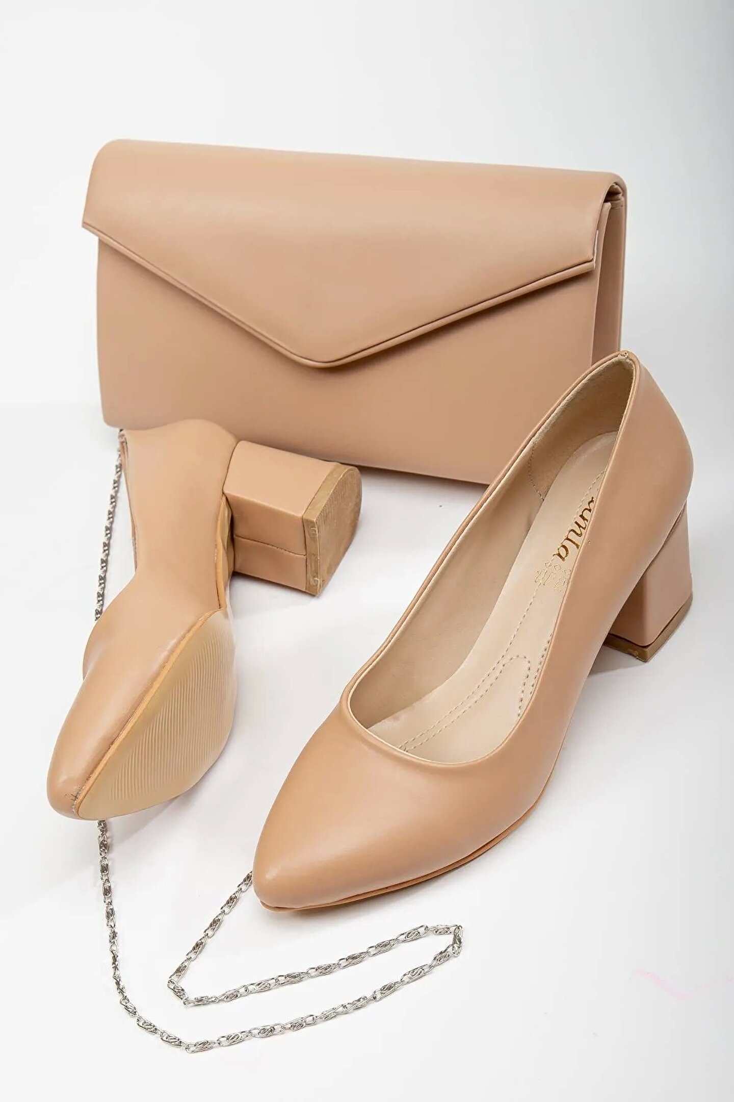 GULT Kadın Klasik Kısa Stiletto Ve Çanta Takımı Koyu Ten
