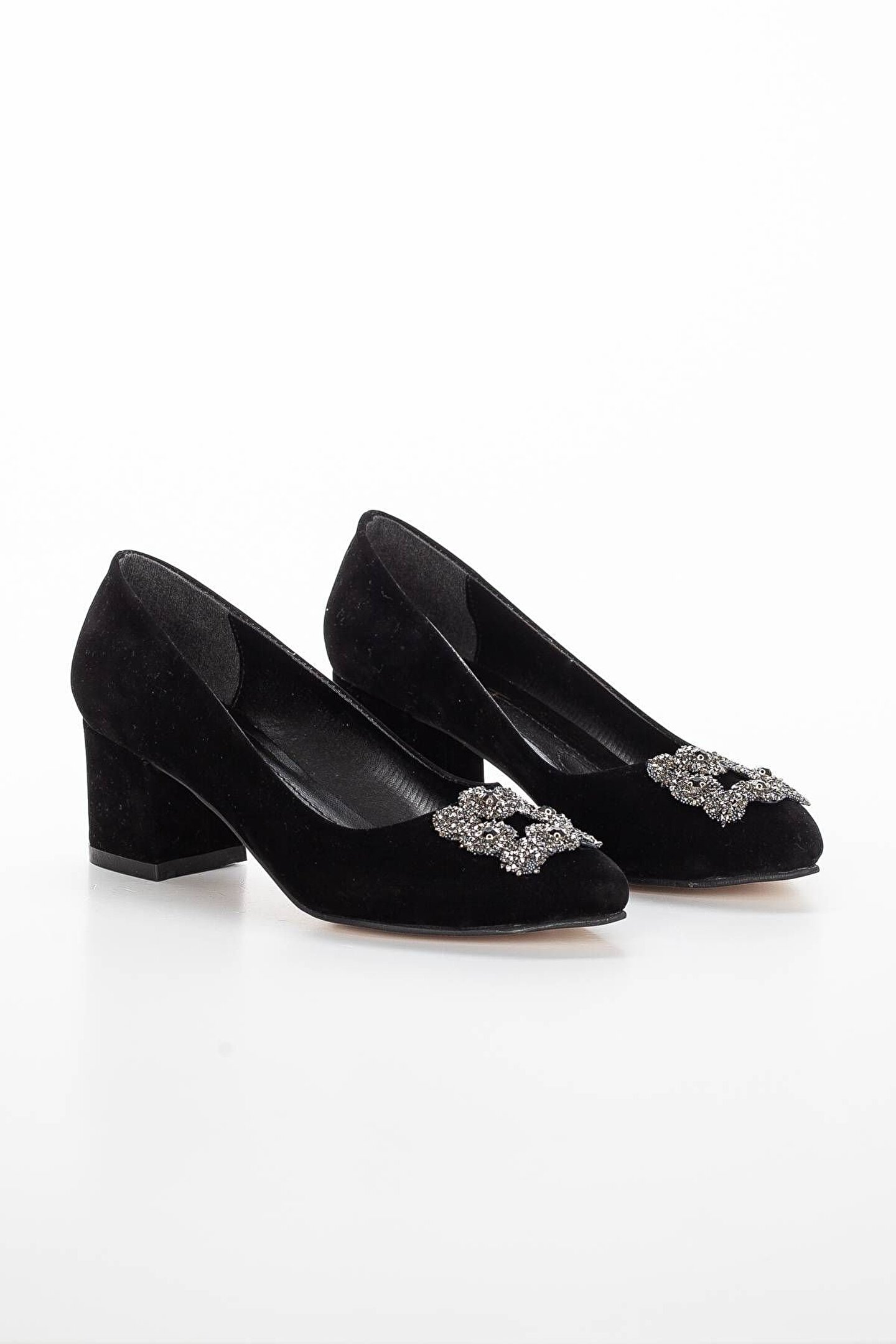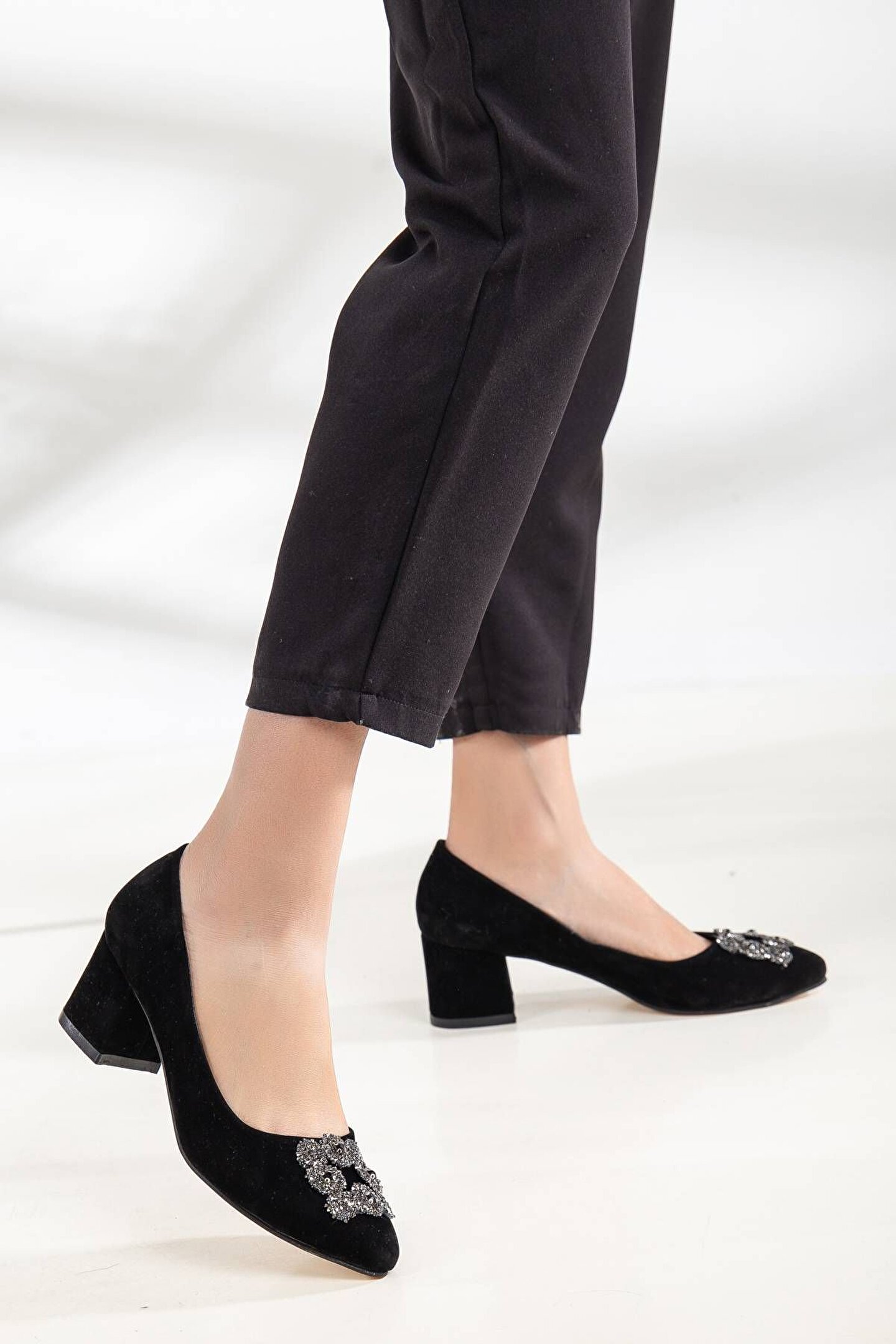 GULT Kadın Klasik Kalın Ökçeli Siyah Süet Taşli 5 Cm Stiletto