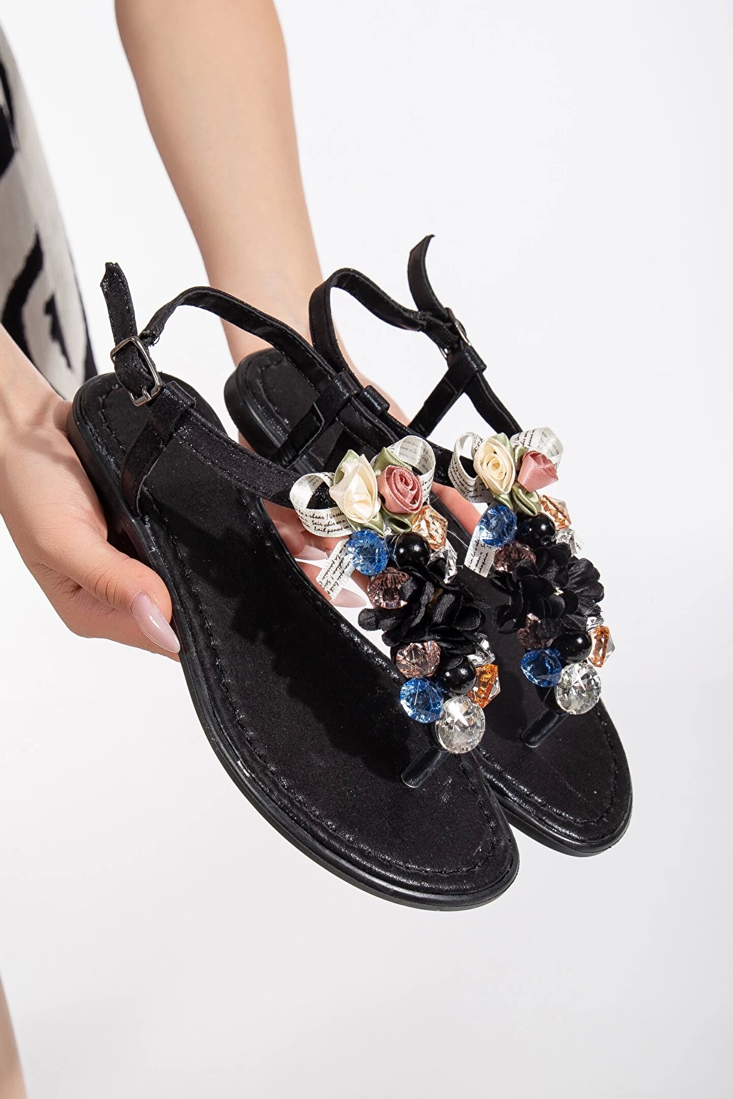 GULT Kadın Yazlık Parmak Arası Sandalet Siyah Süslü
