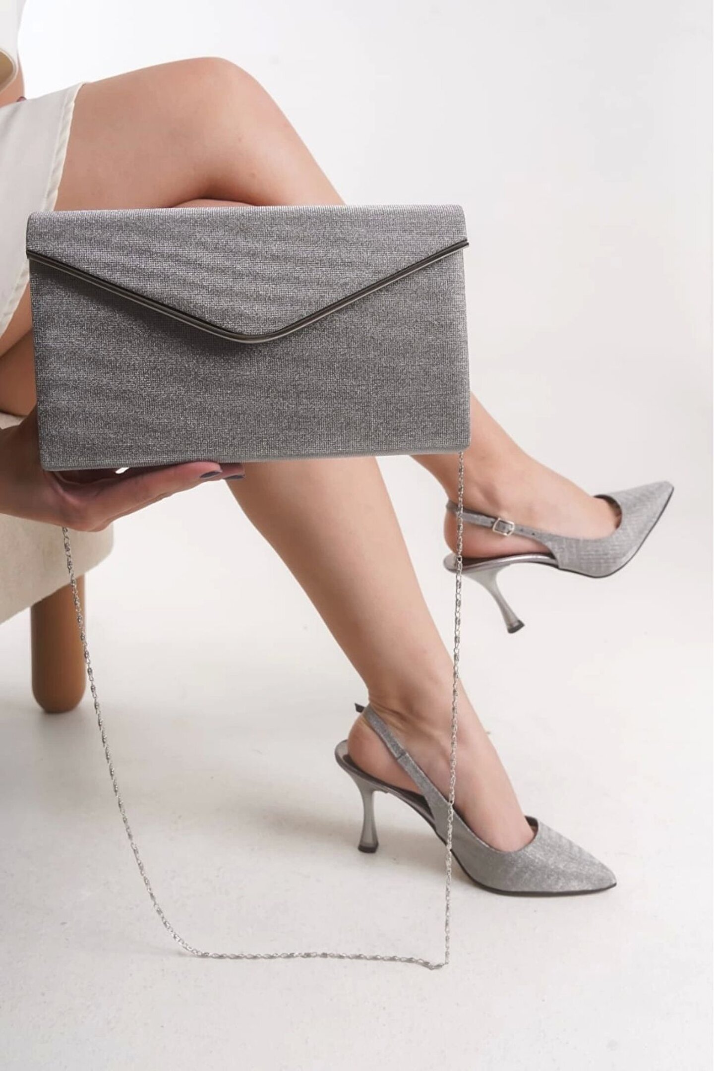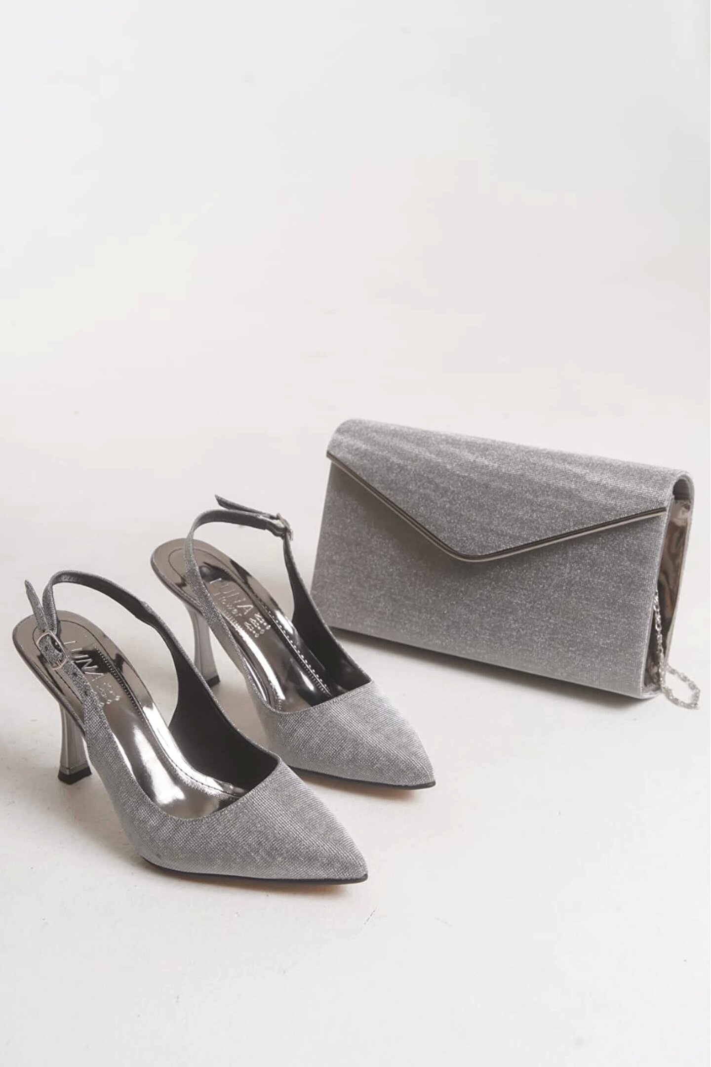 GULT Kadın Sivri Burun Parlak Gece Ayakkabısı Ve Çantası Platin