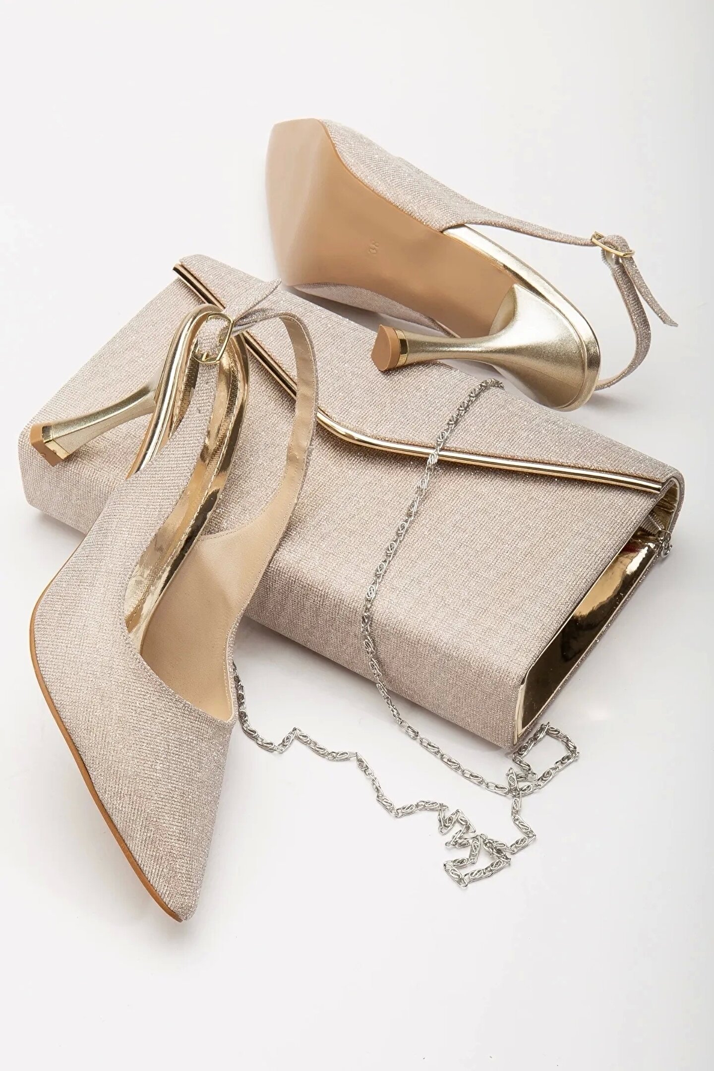 GULT Kadın Sivri Burun Parlak Gece Ayakkabısı Ve Çantası Altın