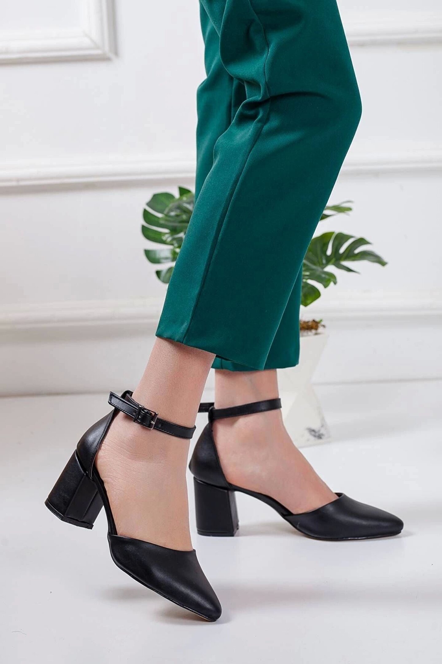 Kadın Siyah Cilt Kalın Topuklu Yazlık Ayakkabı Chn036