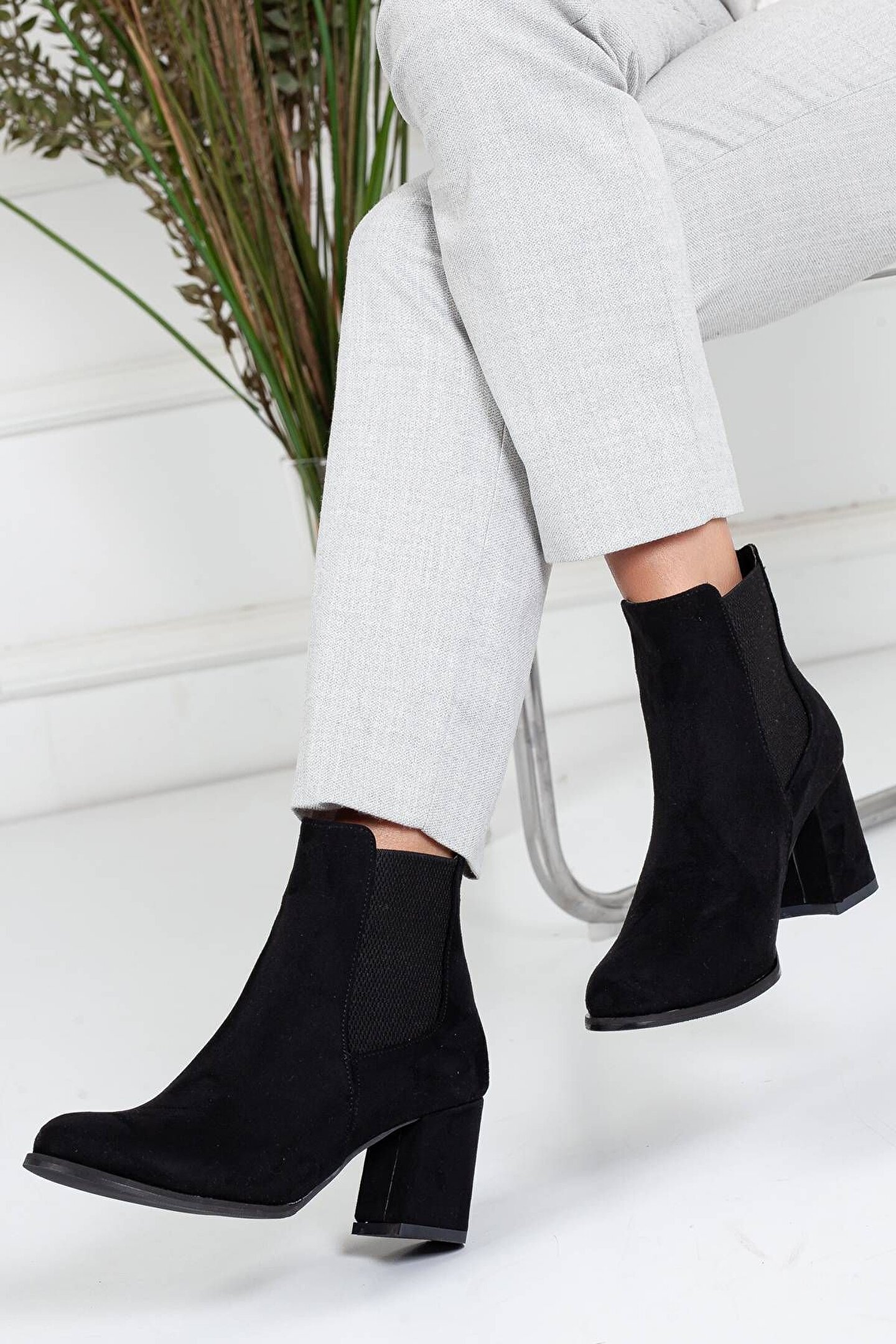 GULT Kadın Siyah Lastikli Bot, Kadın Çekme Süet Topuklu Bot & Bootie