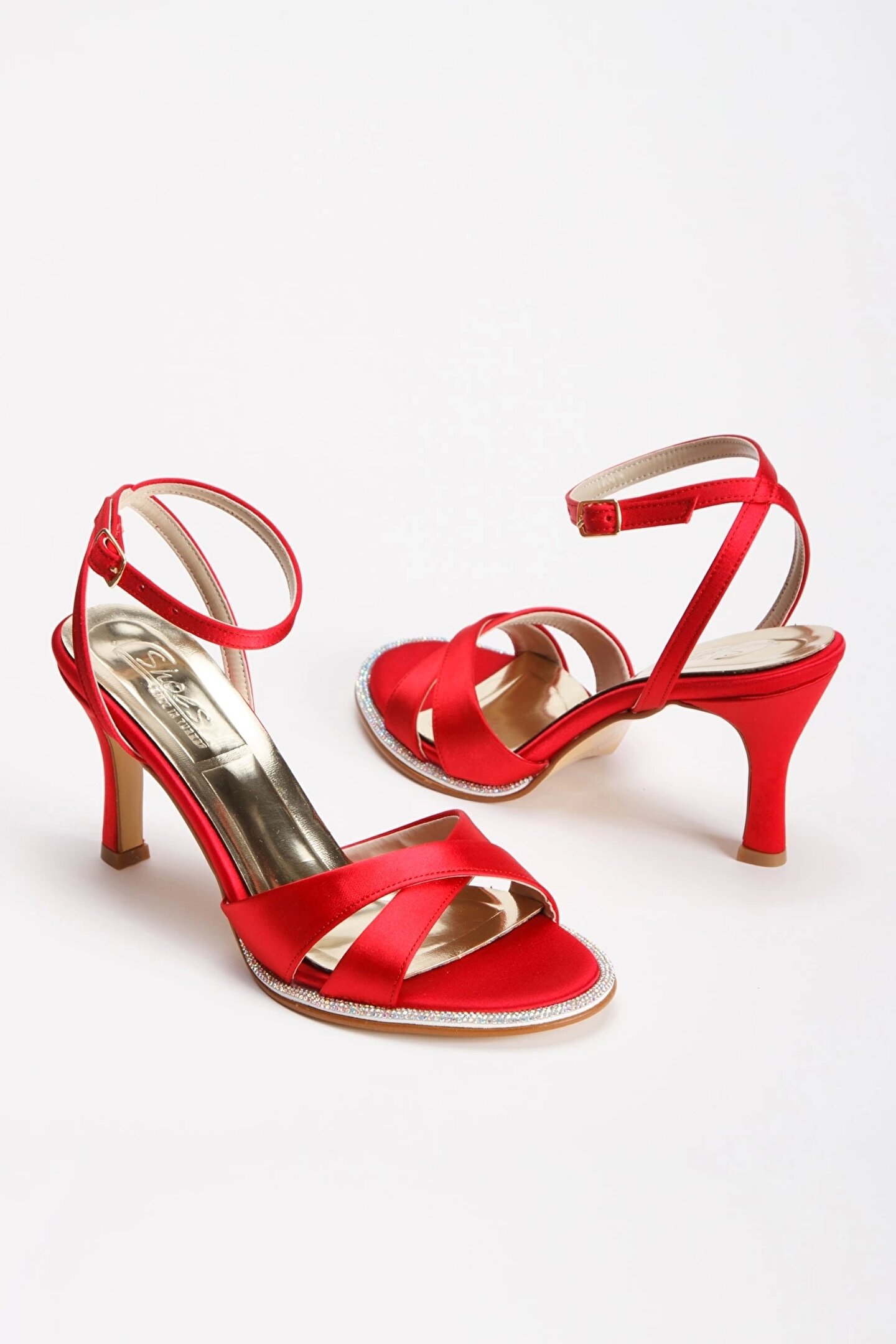 GULT Kadın Taşlı İnce Topuklu Abiye Ayakkabı Kırmızı Saten