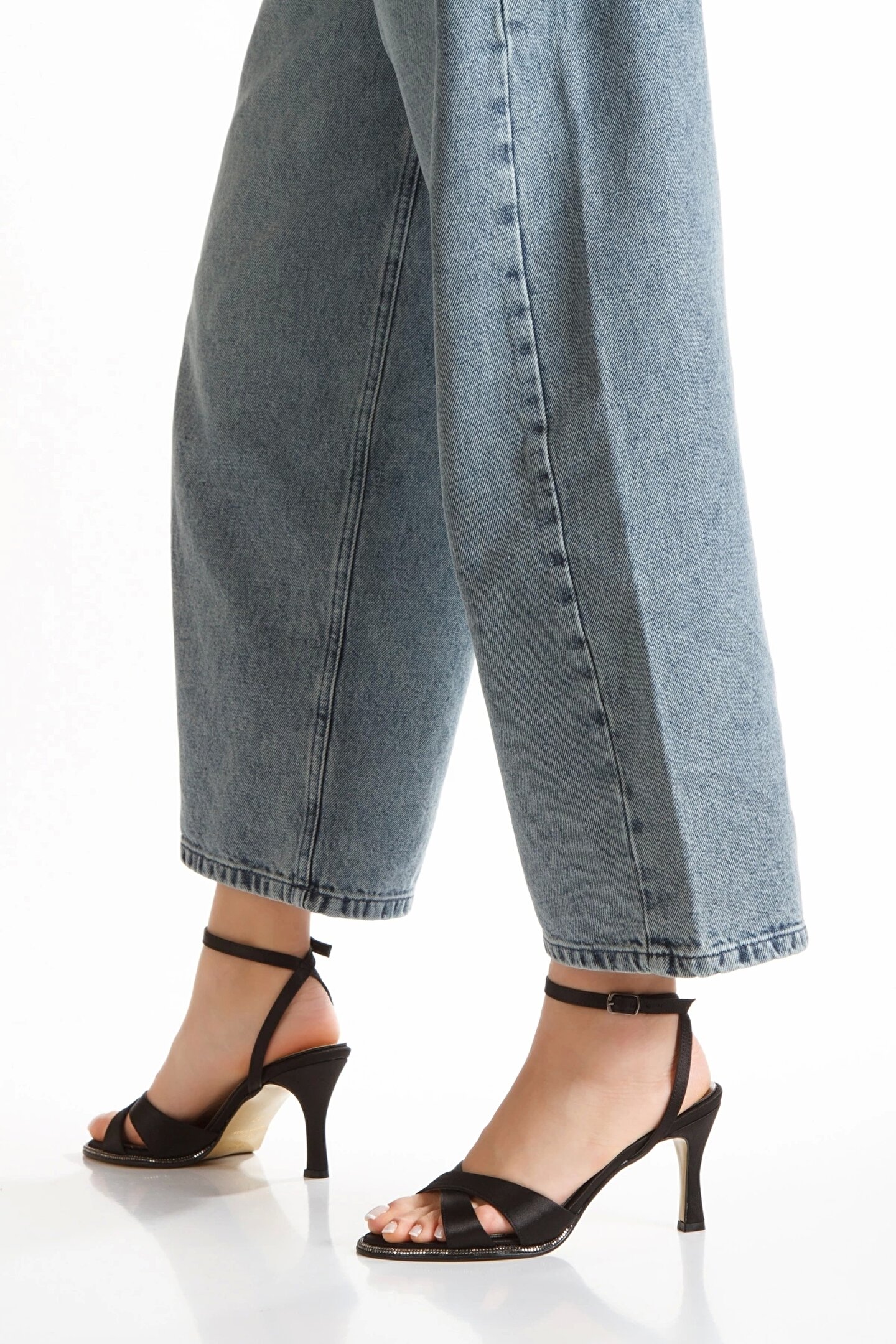 GULT Kadın Taşlı İnce Topuklu Abiye Ayakkabı Siyah Saten