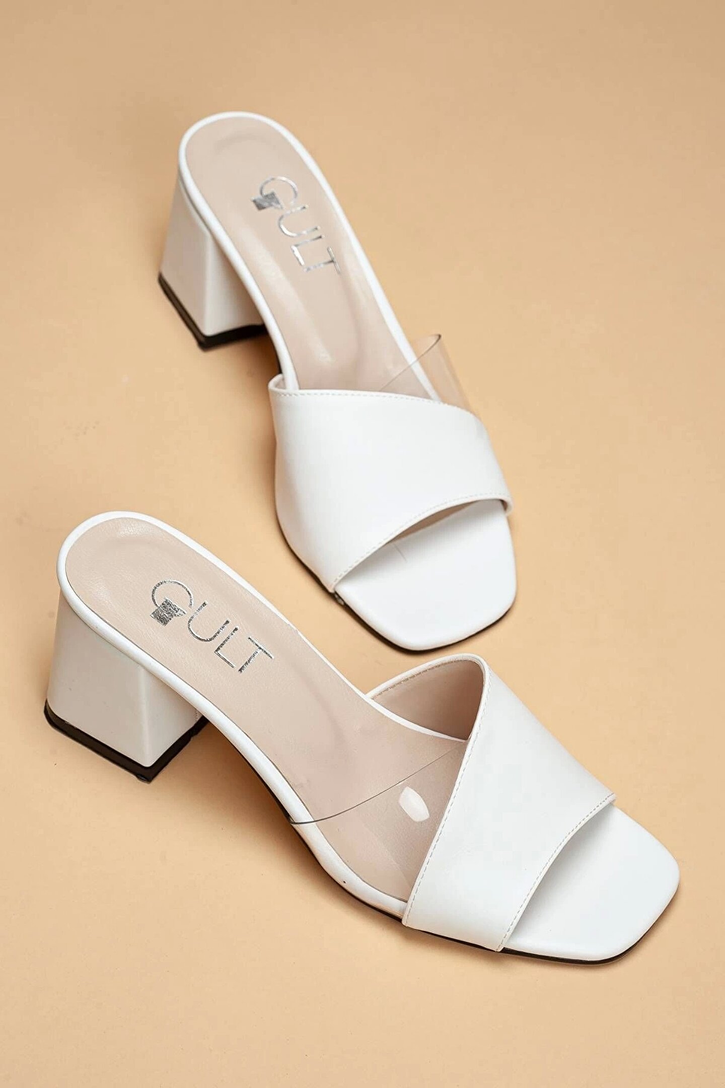 GULT Şeffaf Detaylı Kadın Yazlık Şık Terlik 5 Cm Beyaz
