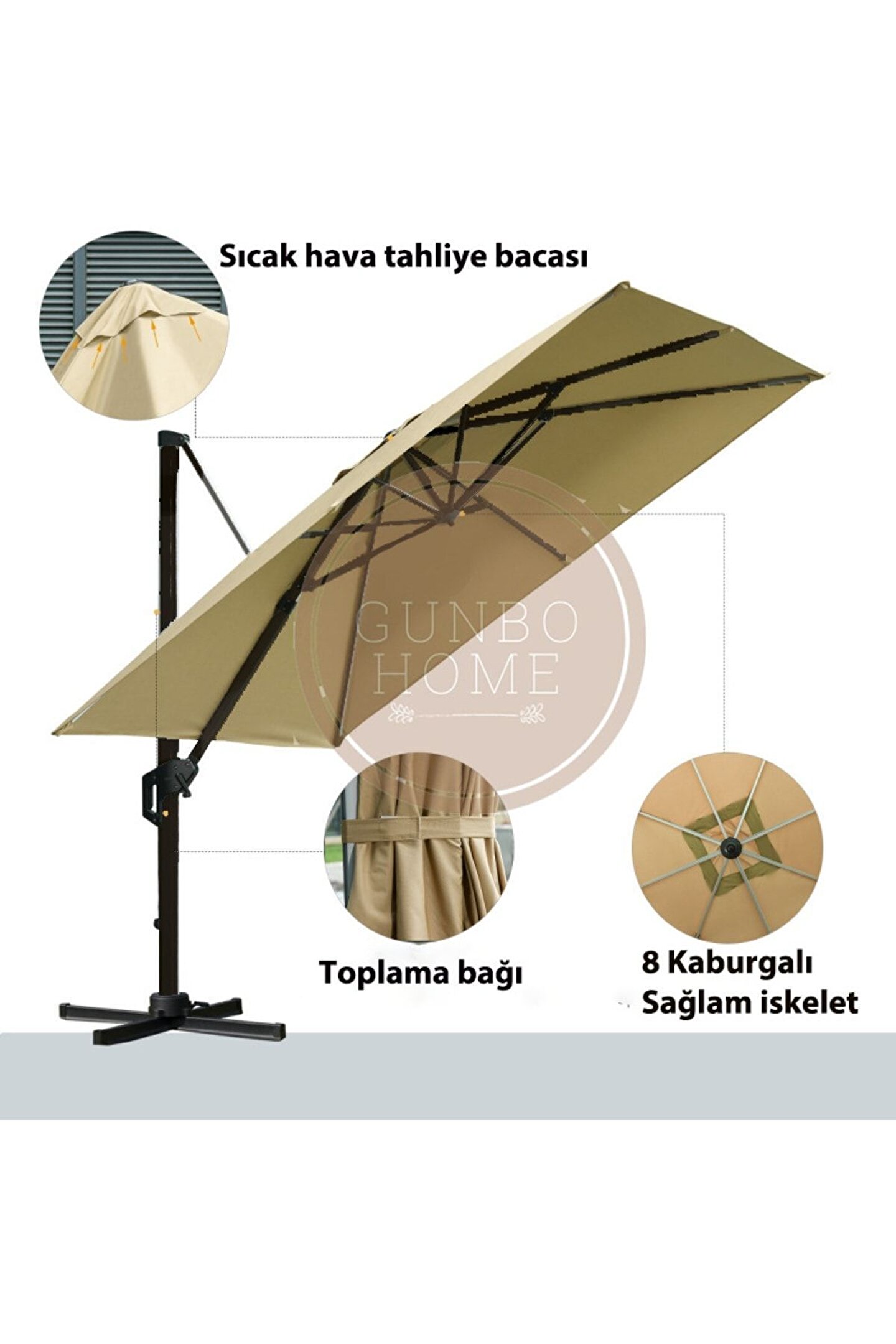 Genişlik 300 cm Yükseklik 260 cm Derinlik 300 cm Ağırlık 25 kg Malzeme Polyester Görselden daha açık bir renktedir(Ekru) ; GÜNEŞE GÖRE AÇI VERİLEBİLMEKTEDİR ; Dış mekanlarınızda size gölge ve serinlik sağlayacak yer tasarruflu birbirinden şık bu şemsiyeler Bej(EKRU) Renk Olarak Üretilmektedir. ; 8 Kol İskelet Vardır. ; ÇAP: 3X3 MT KARE Ebatında Paslanmaz Elektrostatik Özel Boya 300 G Suya Dayanıklı OXFORD Kumaşa Sahiptir. ; 1. Sınıf Kilit Aksamlar Kurulum Şeması İle Beraber Gönderilmektedir AYAK AĞIRLIĞI PAKETE DAHİL DEĞİLDİR ; 50×50 cm ölçülerinde 4 Cm kalınlığındaki istediğiniz bir doğal taş , mermer kestirerek yada hazır ağırlık bidonlarıyla kullanılabilir ;