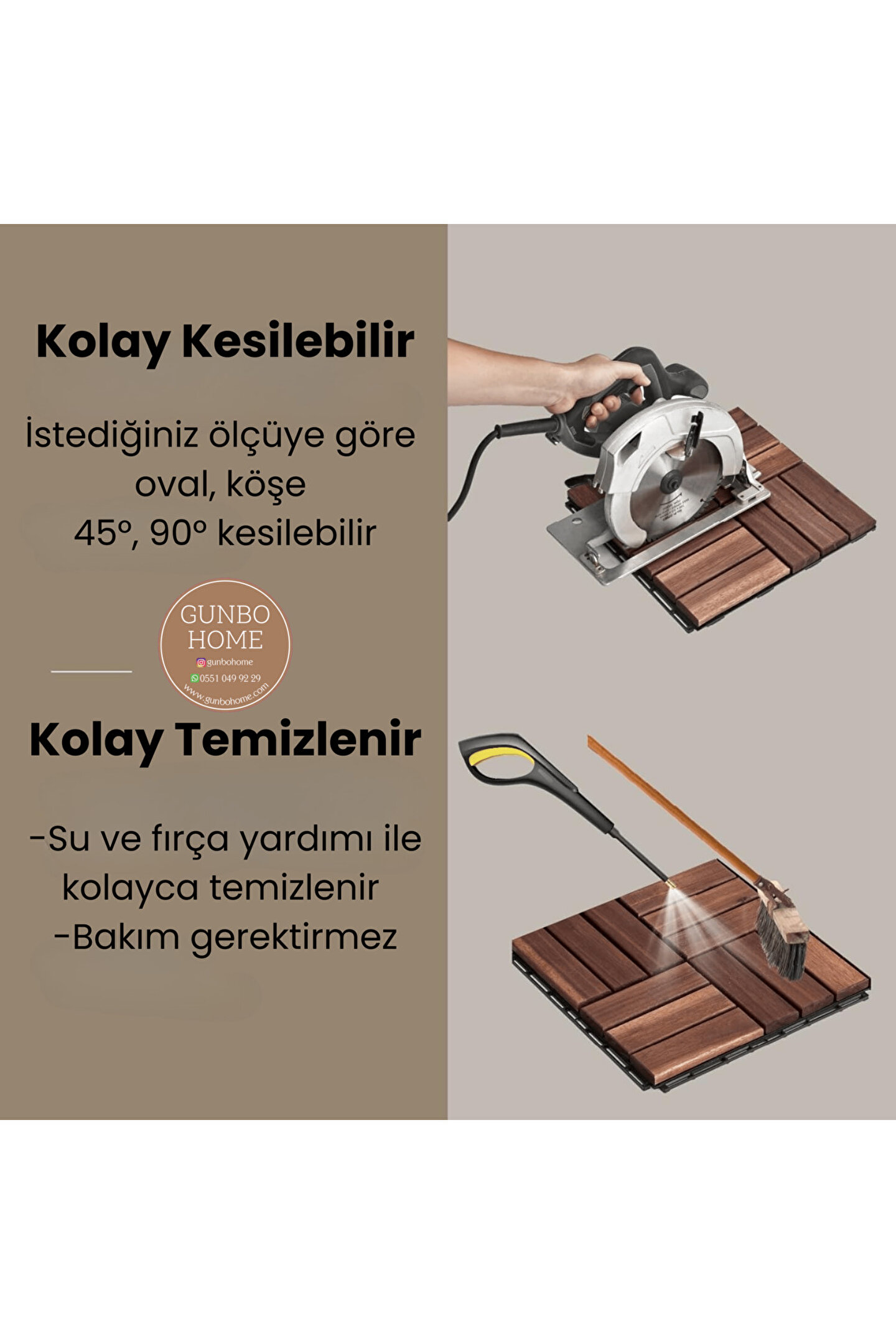 Ürün istediğiniz ölçüye göre kesilebilir.; ; 1 paket Fiyatıdır Ebat 30x30 BİR PAKET KARO 0.81 M2 ALAN KAPLAMAKTADIR ; Her Pakette 9 adet 30CMX30CM LİK KARO VARDIR1 adet karonun modelinde 12 dilim vardır.; ; ; ; Yerden 1.8 cm yükseklik TEAK ağacıdır.; ; Dökdörgen Düz Click İn Geçme sistemi vardır.; ; ; Bakım için sadece teak yağı kullanılmalıdır.; ; ; Nasıl Hesaplanır ? : Örnek olarak 1.2 mt ye 2 metre bir alanımız olsun 1.2 X 2 = 2.4 M2 toplam alanımız var 2.4 /0.81 = 2.96 (Fire Payını hesaba katıp yukarı yuvarlayıp 3 Koli Karo almamız gerekli , sizde bu örnekteki gibi hesaplama yapabilirsiniz , takıldığını bir husus olursa tekrar soru sormaktan çekinmeyiniz ; ; Sudan Etkilenmez Banyoda Kullanılabilir.; ; ; Karavan ve teknelerde Kullanımına uygundur ; ; Banyo ve Dış alanda kullanıma uygundur ; ; Doğal teak ağacı kullanılarak üretilmiş, uzun ömürlü ve dayanıklı bir yüzey sunar.; - ; ; 30x30 cm boyutlarındaki bu karolar, bahçe, banyo veya balkon gibi alanlarınızda estetik bir görünüm sağlar.; - ; ; Naturel renk seçeneğiyle mekanınıza sıcak ve doğal bir dokunuş katar.; - ; ; Kolay montaj imkanı sayesinde pratik kullanım sunar; ekstra alet gerektirmez.; - Akasya ağacından üretilmiş, doğal ve dayanıklı bir yapıya sahip.; - 30x30 cm boyutlarındaki karolarla kolayca monte edilebilir ve mekanınıza şık bir görünüm kazandırır.; - İthal olan bu yer karoları, kalite standartlarına uygun olarak tasarlanmıştır.; - Yılda bir kez tik yağı ile bakımı yapılması önerilir; böylece uzun ömürlü kullanım sağlanır.; - Kullanım sırasında nemli bir bezle silerek temiz tutulabilir Ayrıca Yıkanabilir - Duş Banyo Hamam Sauna gibi alanlarda kullanılabilir Sudan etkilenmez .; - Kahverengi rengiyle sıcak ve doğal bir atmosfer yaratır.; - Gunbo Home tarafından ithal edilmiş olup, yetkili temsilcisi ve ifa hizmet sağlayıcısı da aynı firma tarafından gerçekleştirilmiştir.; - Gunbo Home Asya fabrikasında üretilen bu ürünler, yerel işçilik ve üretim teknikleriyle desteklenmektedir.; Nötr Karbon üretime geçmek amacıyla hızla dönüşüyoruz.