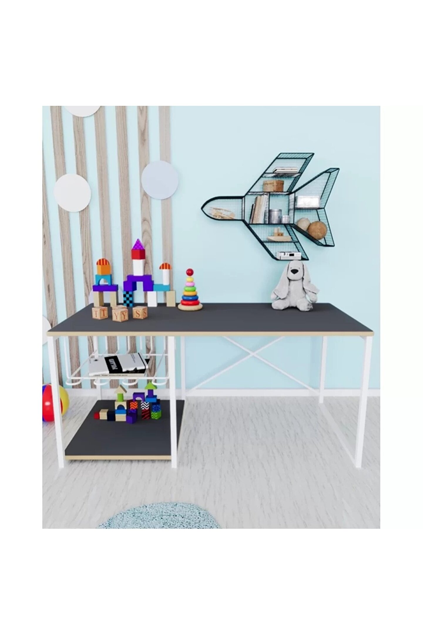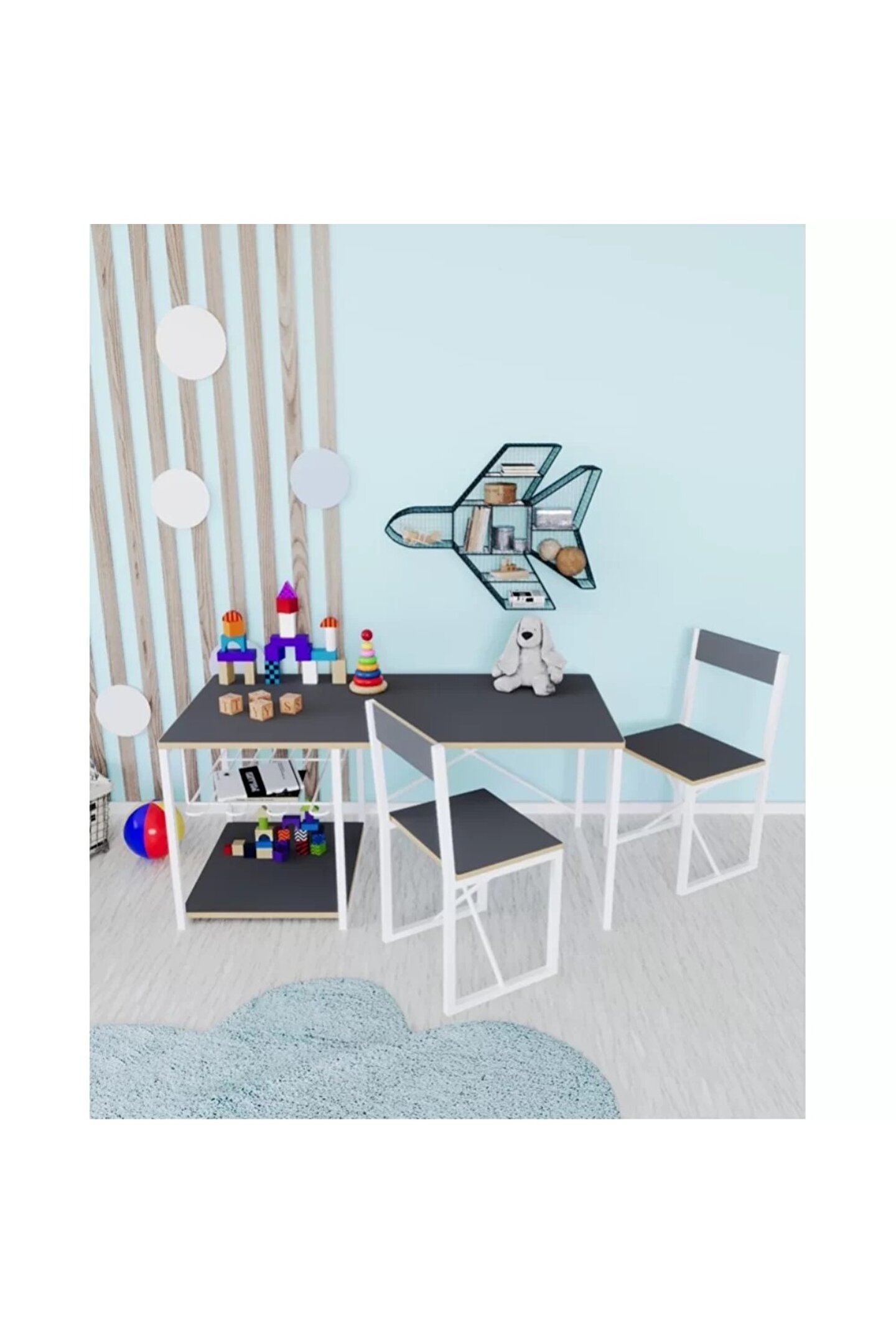 Çocuklar için tasarlanan bu çocuk çalışma masası ve 2 sandalyeli oyun etkinlik aktivite masası, konfor ve ergonomiyi ön planda tutarak, minik kullanıcılarının rahat etmesini sağlıyor. Çocuk çalışma masası altındaki tel raf ise, düzenli bir saklama alanı olarak kullanılıyor, böylece çocuklar çizim kağıtları ve kırtasiye malzemelerini kolayca düzenleyebiliyorlar.