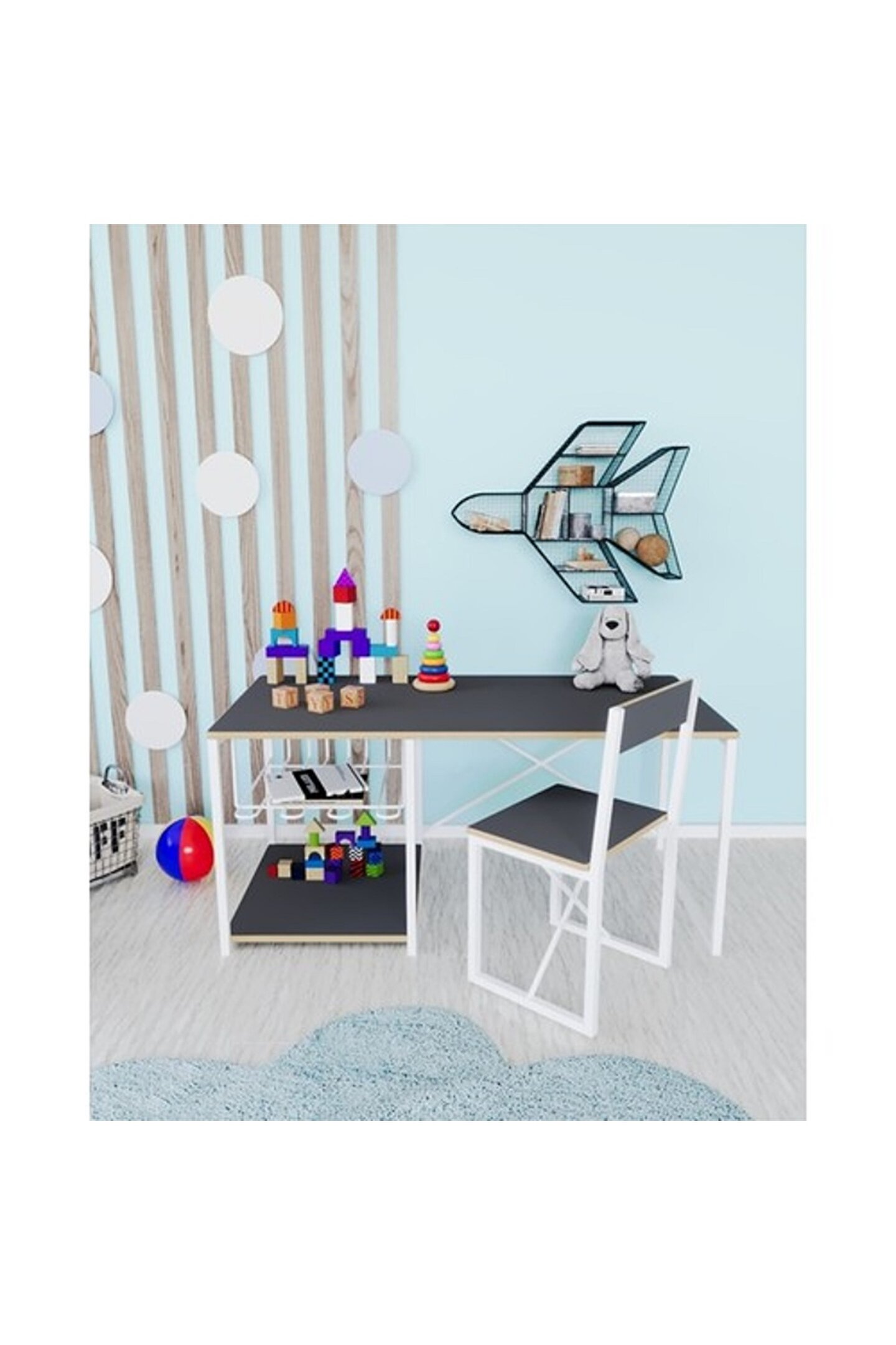 ve sandalyesi metal profil ayaklar, masanın kararlılığını artırırken, modern ve minimalist tasarımı, çocuk odalarına çağdaş bir hava katıyor.