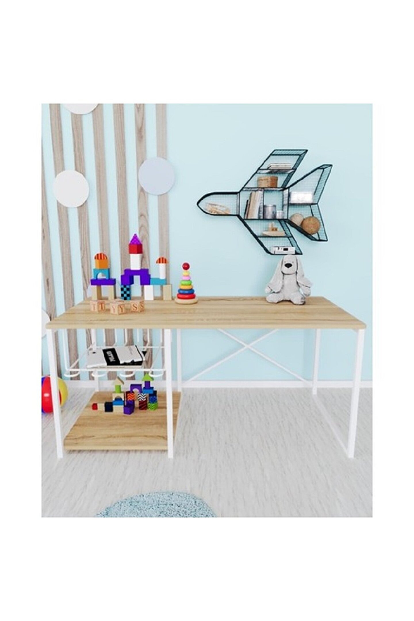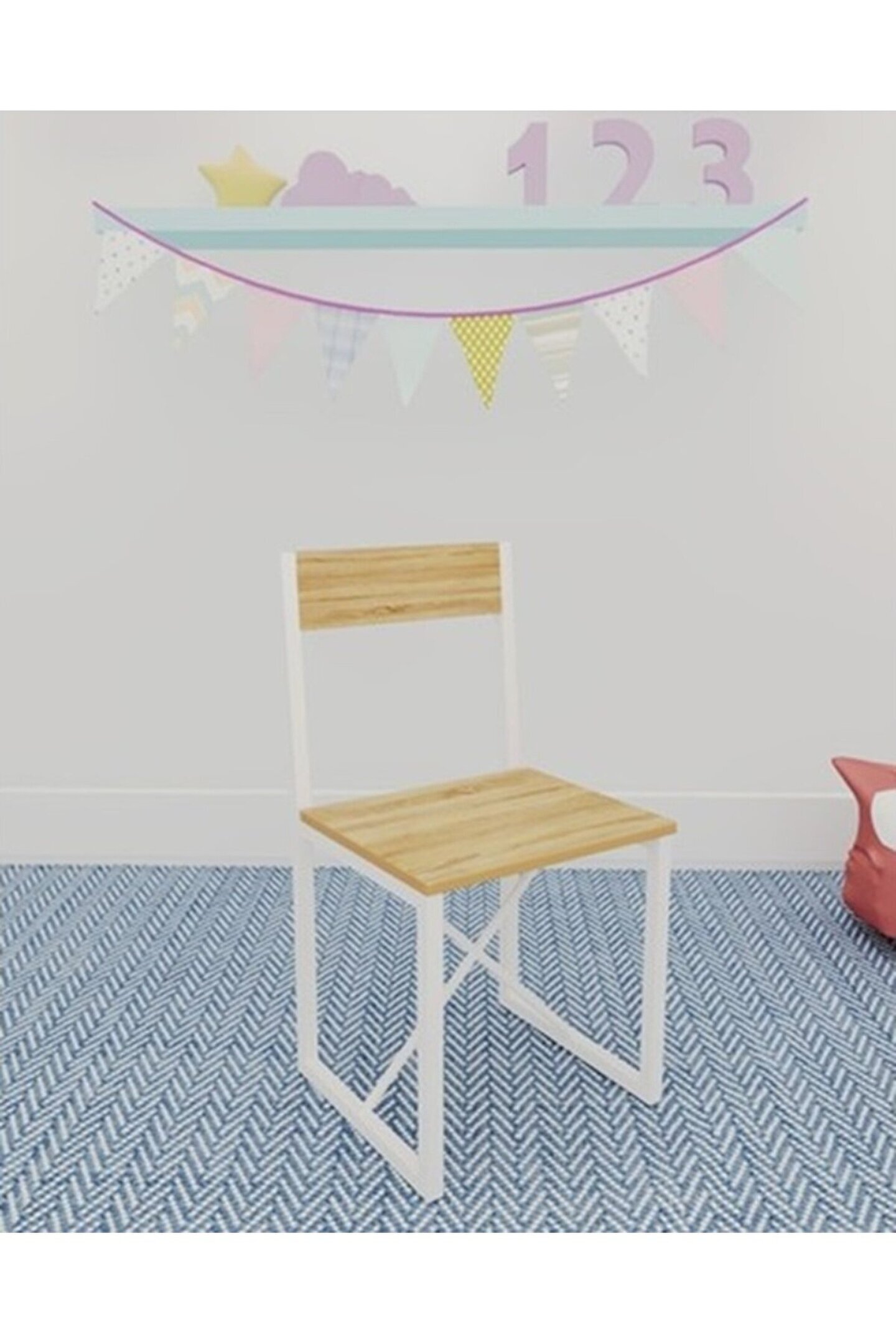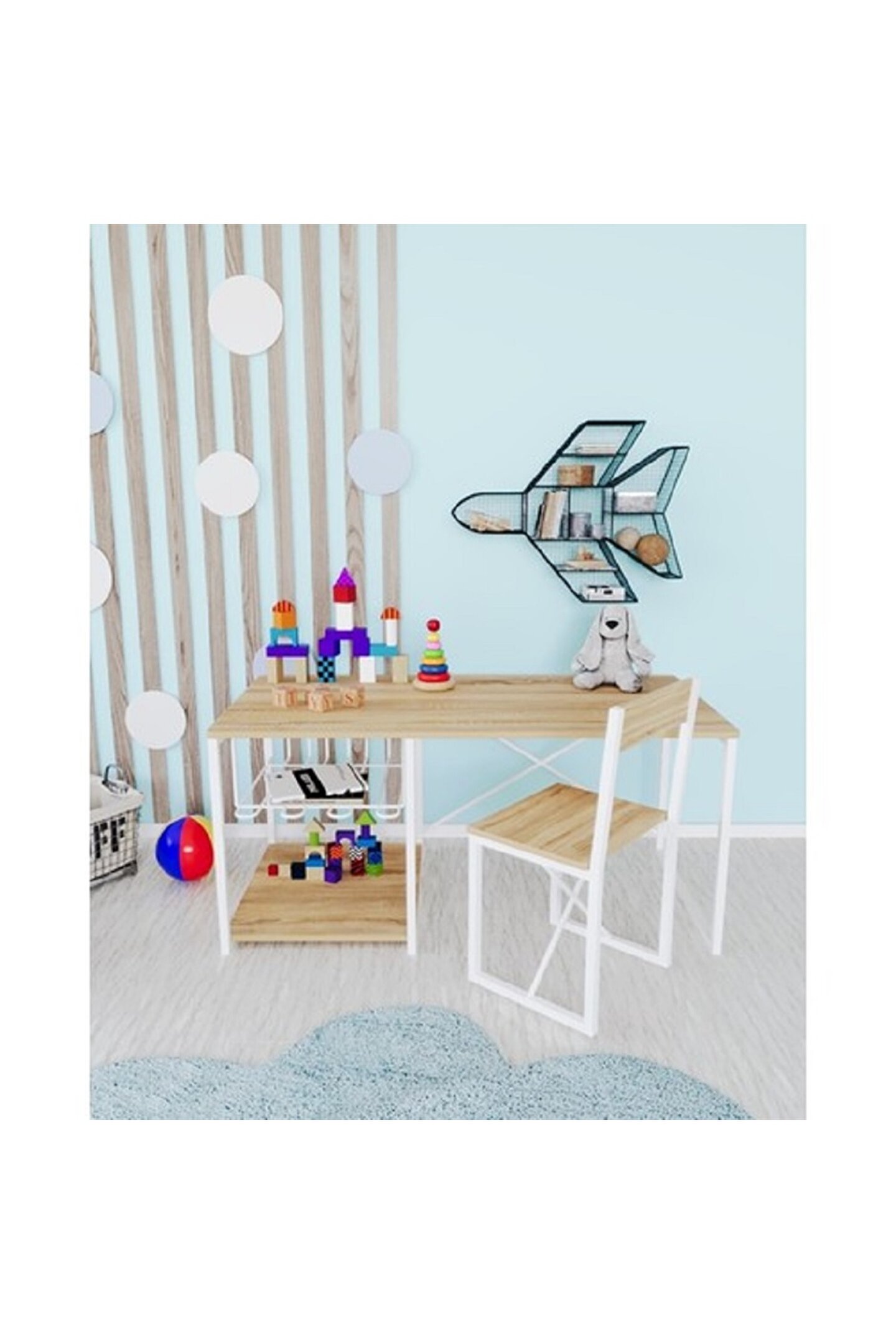 ve sandalyesi metal profil ayaklar, masanın kararlılığını artırırken, modern ve minimalist tasarımı, çocuk odalarına çağdaş bir hava katıyor.