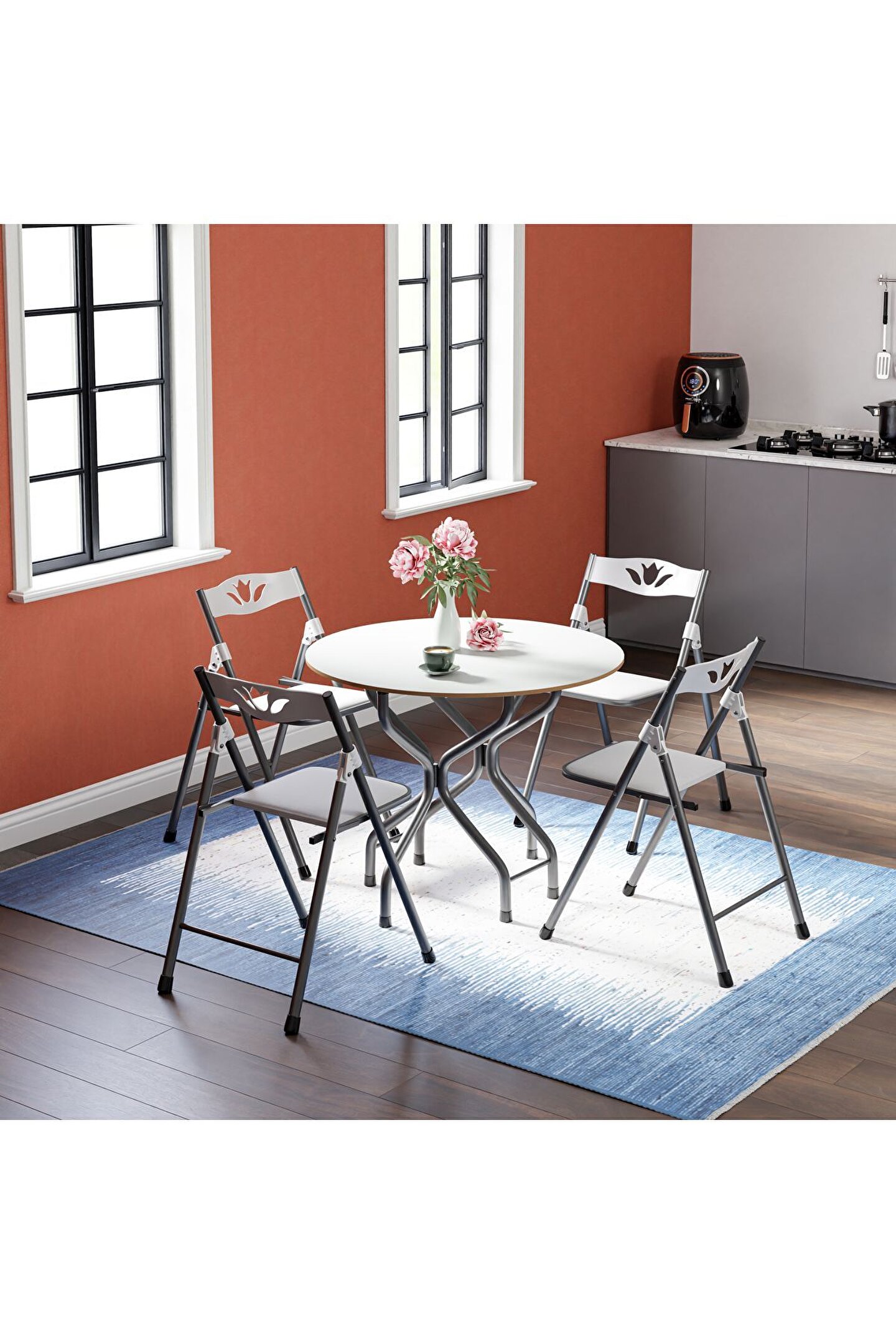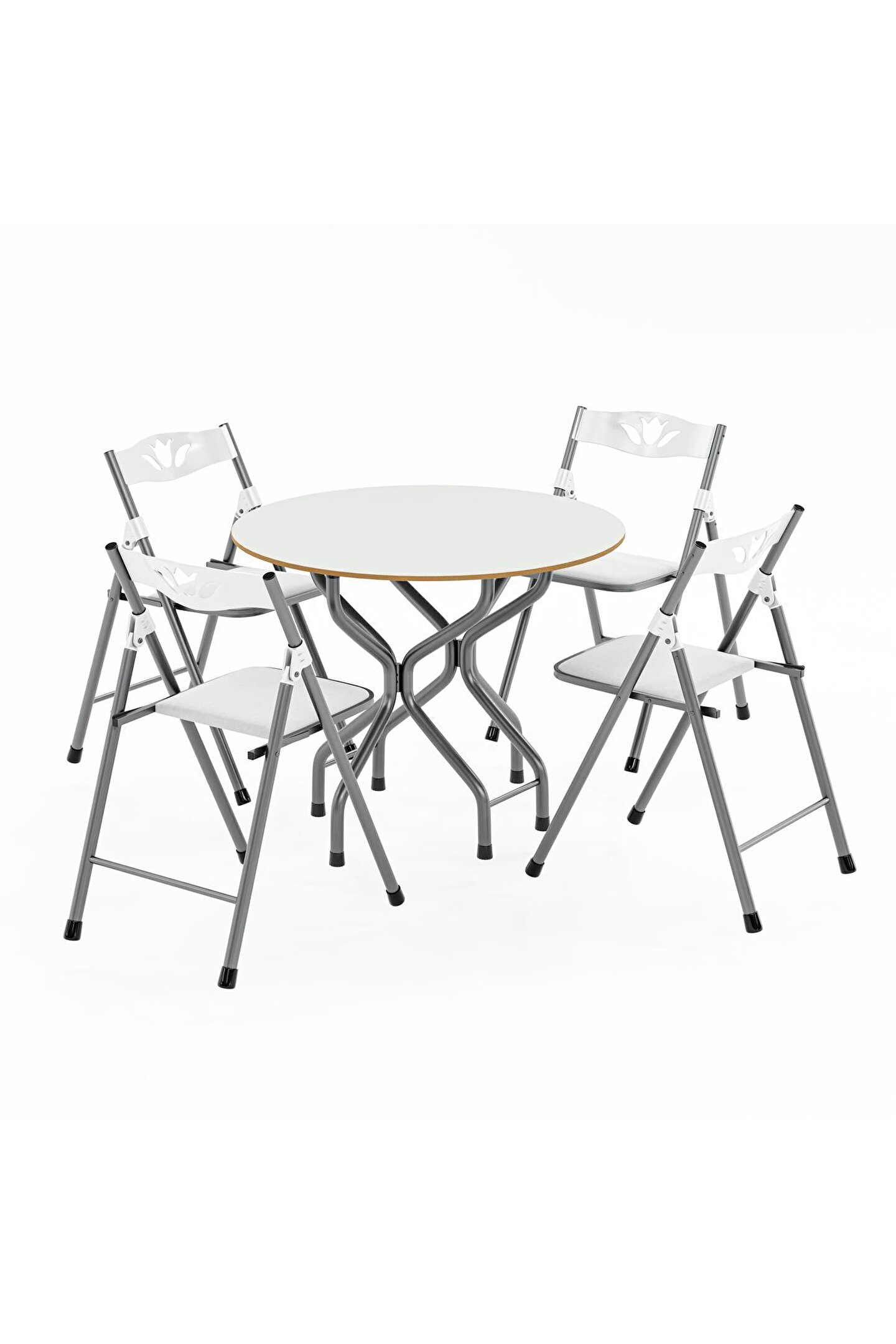 Birinci Kalite %100 Türk Malı;Highglos MDF ;Malzeme ;1 Adet 90x90 Masa ;4 Adet Sandalye ;Masa Yan Kanatları Katlanır Özelliktedir. ;Dar Alanlarda Masanın Bir Kanadı Katlayarakda Kullanabilirsiniz.; isterseniz 2 kanadınıda katlayabilirsiniz. ;Ayrıca tüm sandalyelerde katlanabilir özelliğe sahip olup kullandıktan sonra katlayarak masanın ortasındaki boşluğa yerleştirebilirsiniz. ;Sandalyeler, Mutfak Balkon Salon Gibi iç Mekanlarda Kullanılmak İçin Tasarlanmış Olup Şık Görünümü Sayesinde Bulunduğu Ortama Ayrı Bir Güzellik Katacaktır. ;Sandalyelerin Sırt ve Mafsalları Plastik Ozellikte Olup Estetiktir. ;Sandalyelerin Oturum yerleri Suni deriden imal edilmiştir ;Yenilenmiş Gövde Demir Aksamı En Az 1 ml. Kalınlıktadır. ;Gövde Gri renkli Fırın Boya ile Boyanmıştır. ;Ürünün Açık Ölçüleri: 90x90 cm genişlik, 70 cm yükseklik.;Ürünün Kapalı Ölçüleri: 39 cm Genişlik, 90 cm Uzunluk, 70 cm Yükseklik. Ürün Demonte Olarak Gönderim Yapılacaktır.