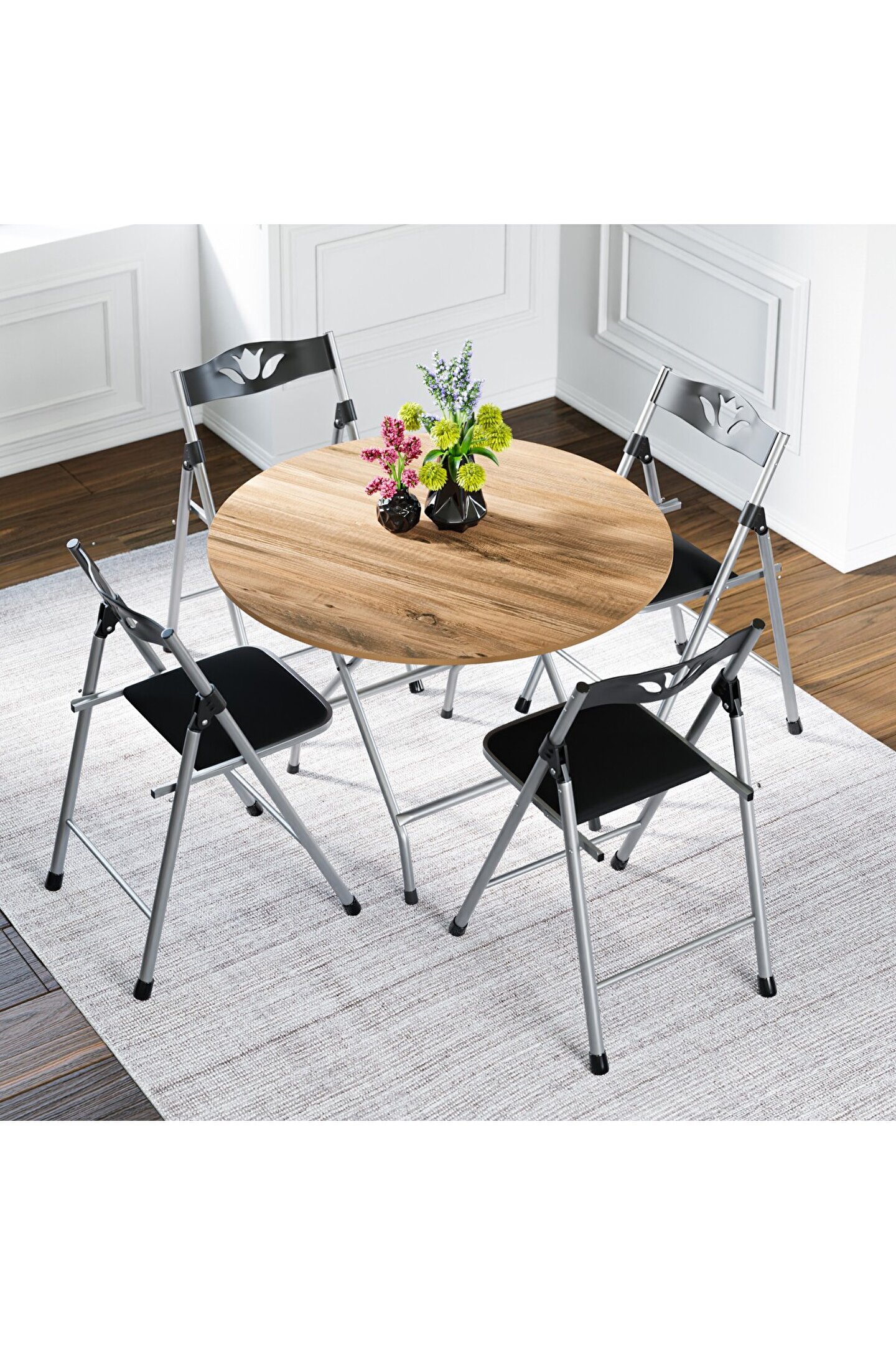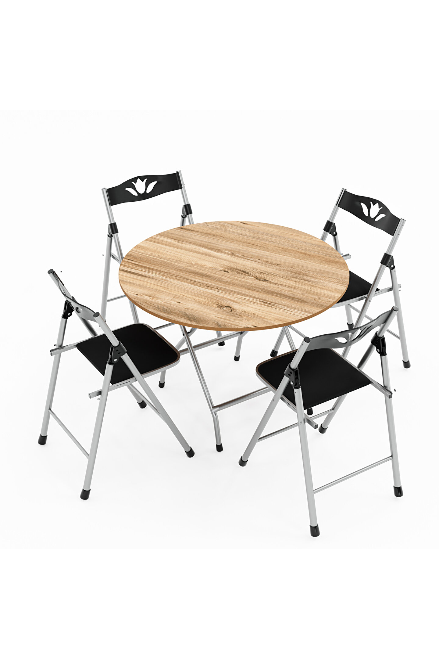 Katlanır Masa Yuvarlak Kırma Mutfak Masası, modern ve işlevsel bir mobilyadır. Bu set, özellikle küçük mutfaklar, yemek odaları veya çok amaçlı alanlar için tasarlanmıştır. 70 çap boyutlarındaki masa, ideal bir yemek yüzeyi sunarken, katlanabilir sandalyeler alanı en verimli şekilde kullanmanıza olanak tanır. Setin tasarımında, Atlantik Çam'ın doğal dokusu ve MDF, görsel bir zenginlik ve modern bir dokunuş ekler. Masa ve sandalyeler, elektrostatik boyalı metal ayaklar sayesinde ekstra sağlamlık kazanır. Bu yapı, günlük kullanıma uygun dayanıklılık sunarken, şık bir görünümle mekanınızı güzelleştirir. Katlanabilir masa ve sandalyeler, küçük yaşam alanlarında büyük bir avantaj sağlar. Setin kolay katlanabilir olması, sınırlı depolama alanlarında bile rahatlıkla saklanabilmesine imkan verir. Bu özellik, özellikle apartman dairesi gibi yerlerde yaşayanlar için idealdir, kullanılmadığı zamanlarda masa ve sandalyeleri kolayca kaldırıp alan açabilirsiniz. Set, fonksiyonelliği ve şıklığı bir arada sunarak, her türlü iç mekan dekorasyonuna uyum sağlayacak şekilde tasarlanmıştır.