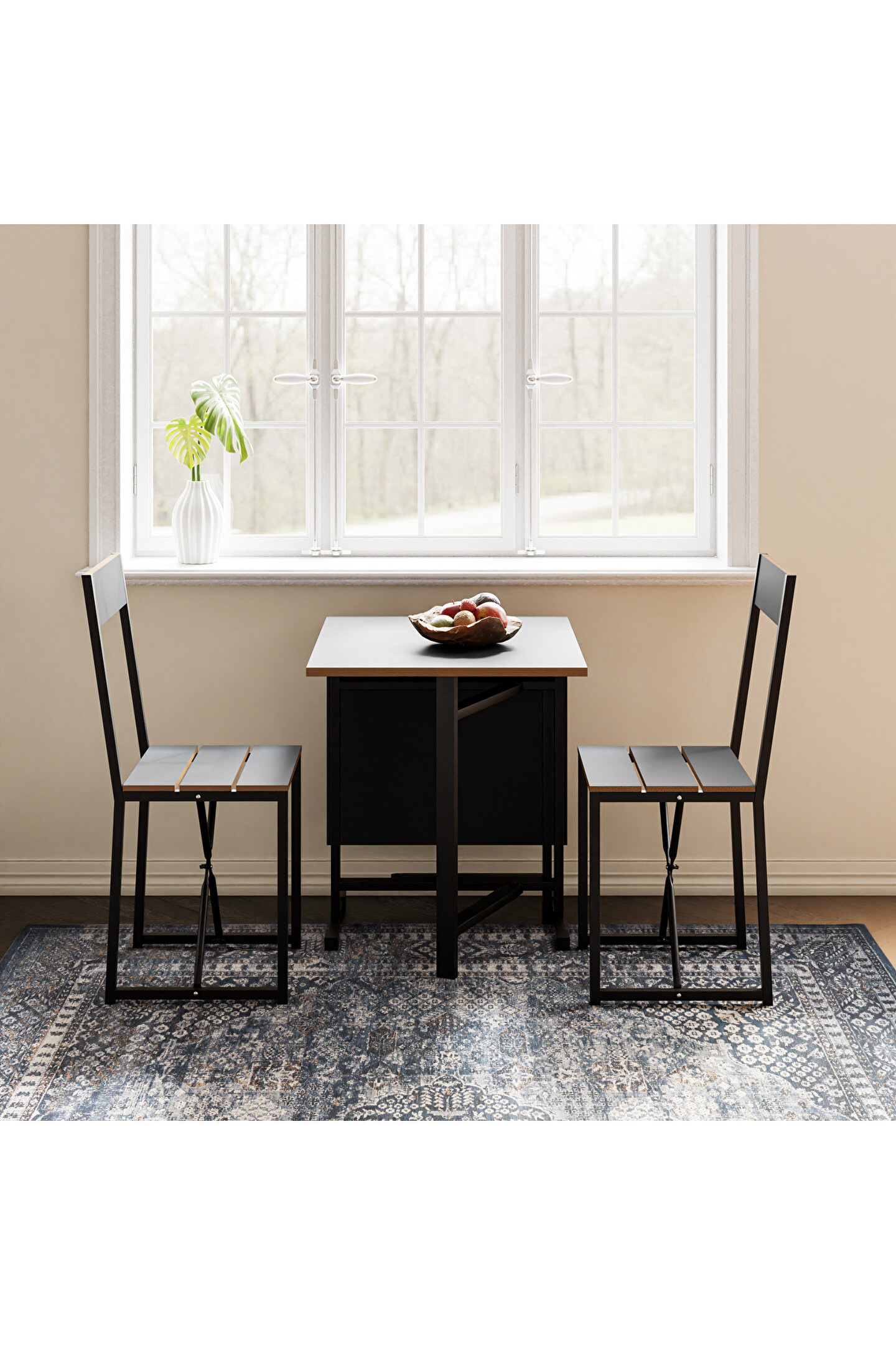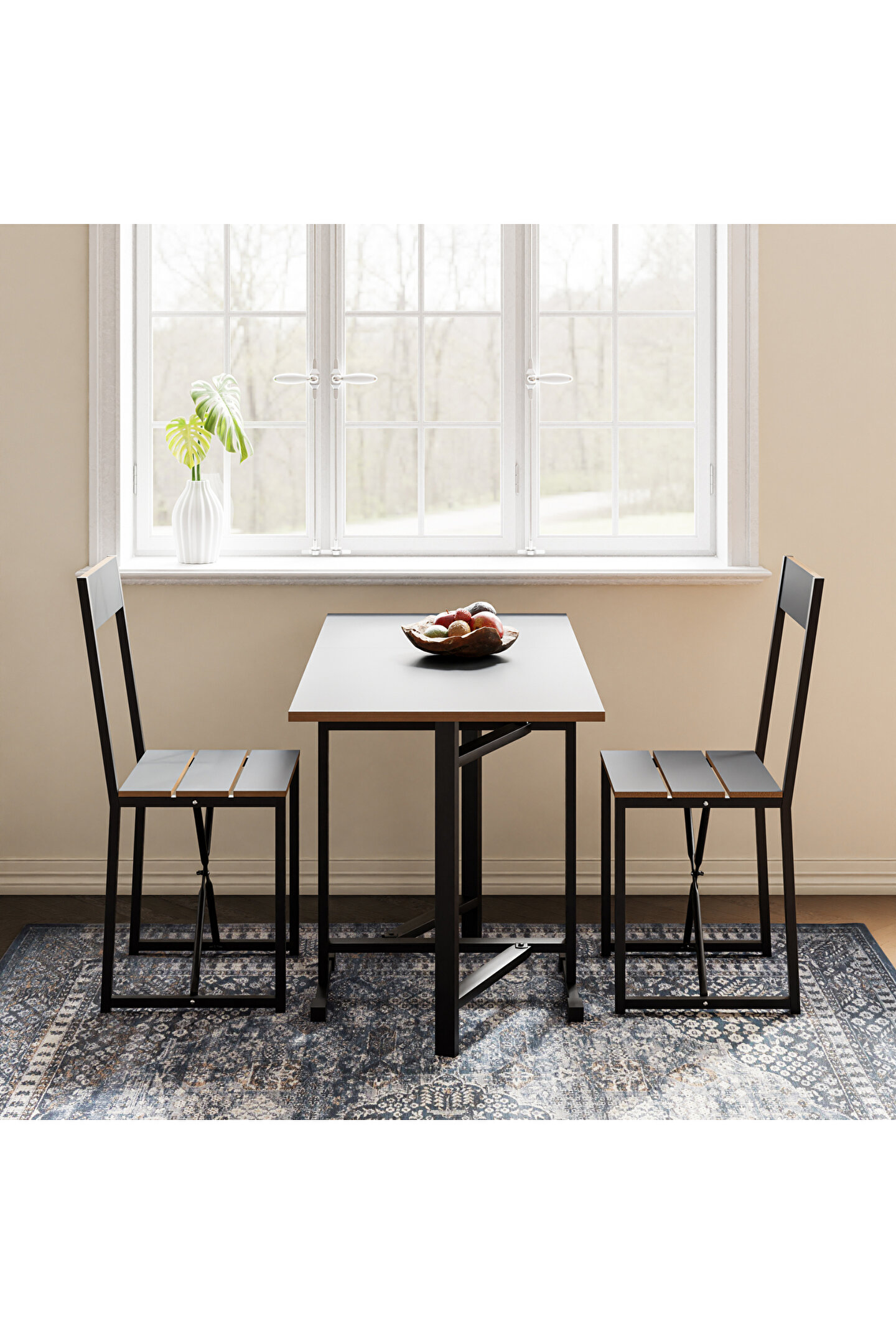 Setin tasarımı, modern ve minimalist çizgileri bir araya getirir, bu sayede hem işlevsel hem de estetik bir görünüm sunar. Katlanabilir yapı, masa ve sandalyelerin kolayca saklanabilmesine imkan tanır, bu da özellikle misafir ağırlama gibi durumlar için ekstra alan yaratılmasını sağlar. Ürün, günlük kullanım için de uygundur, zira montajı ve kullanımı oldukça pratiktir.