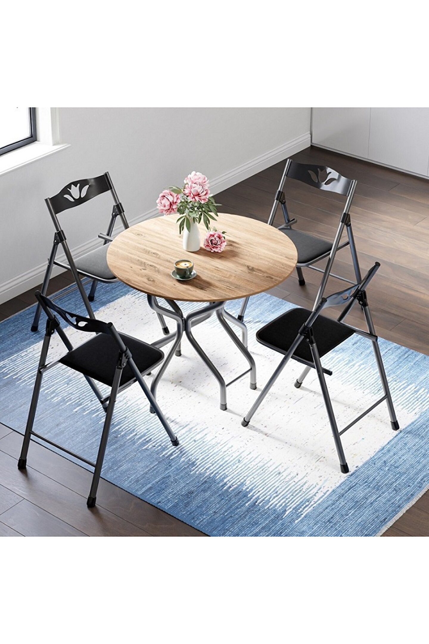 Evlerin herhangi bir alanında ve aynı zamanda iş yerlerinde de kullanılabilen Mutfak Masa Sandalye Takımı Bahçe Yemek Masa Seti Yuvarlak, dört adet sandalye ve bir adet yuvarlak masadan meydana gelen bir settir. Siyah renk tonlarında üretilen