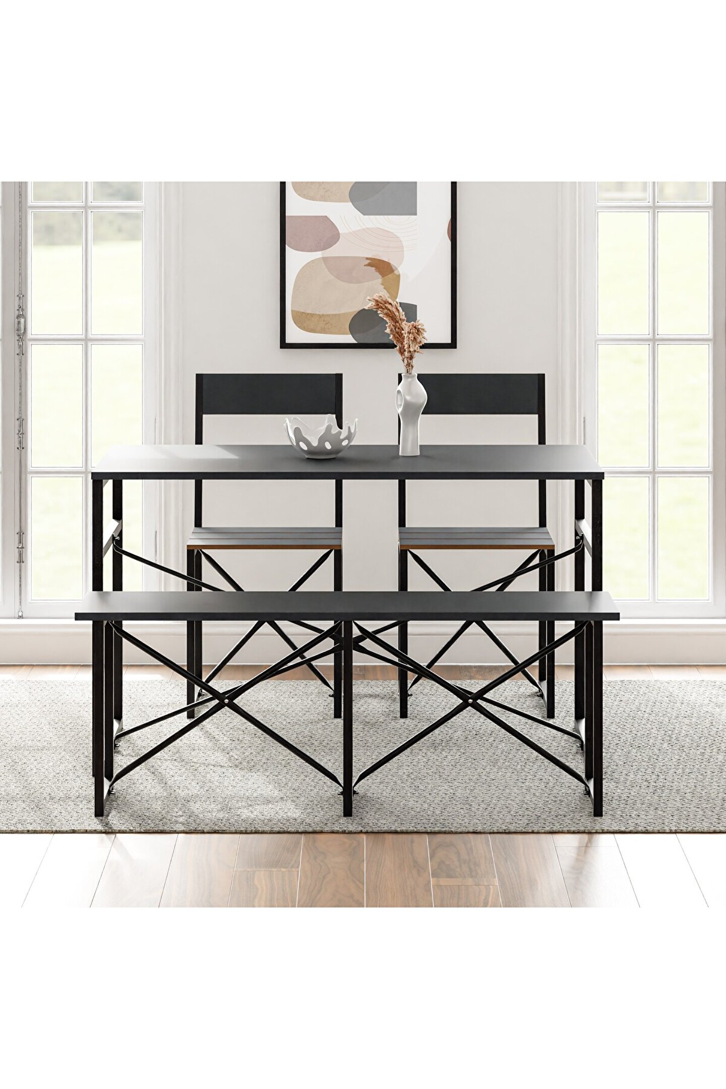 Set, fonksiyonel beklentileri estetik ile buluşturan dinamik bir yapıya sahiptir. 120 cm x 60 cm ölçülerindeki geniş masa tablası, yemeklerinizi, çalışmalarınızı veya toplantılarınızı rahatça gerçekleştirebileceğiniz bir alana sahiptir. 70 cm'lik ideal yüksekliği, ergonomik bir oturma ve kullanım deneyimi sağlar. Ayrıca, bench ve sandalyelerin uyumlu tasarımı, göze hitap ettiği kadar konfor da sunar.