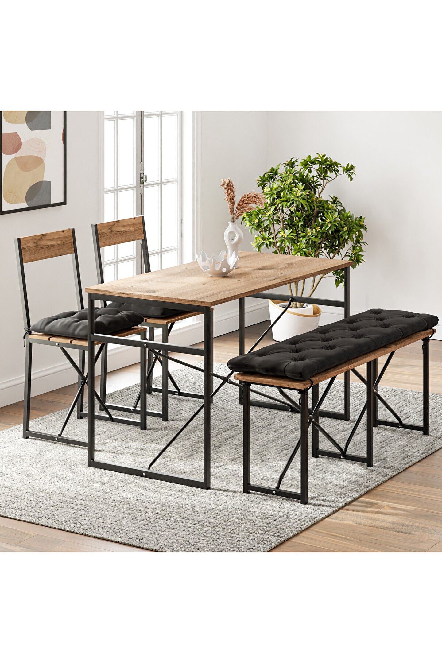 Mutfak Masası Bench Bank, hem estetik hem de kullanım açısından zengin özelliklere sahip bir mobilya setidir. Bu setin modern ve sade görünümü, herhangi bir yaşam alanına çağdaş bir hava katarken, sağlam yapısı ve kaliteli malzemeleri uzun ömürlü bir kullanım sunar. Ahşap ve metalin uyum içinde buluştuğu tasarımı, günümüzün minimalist dekorasyon anlayışına mükemmel bir şekilde uyum sağlar.