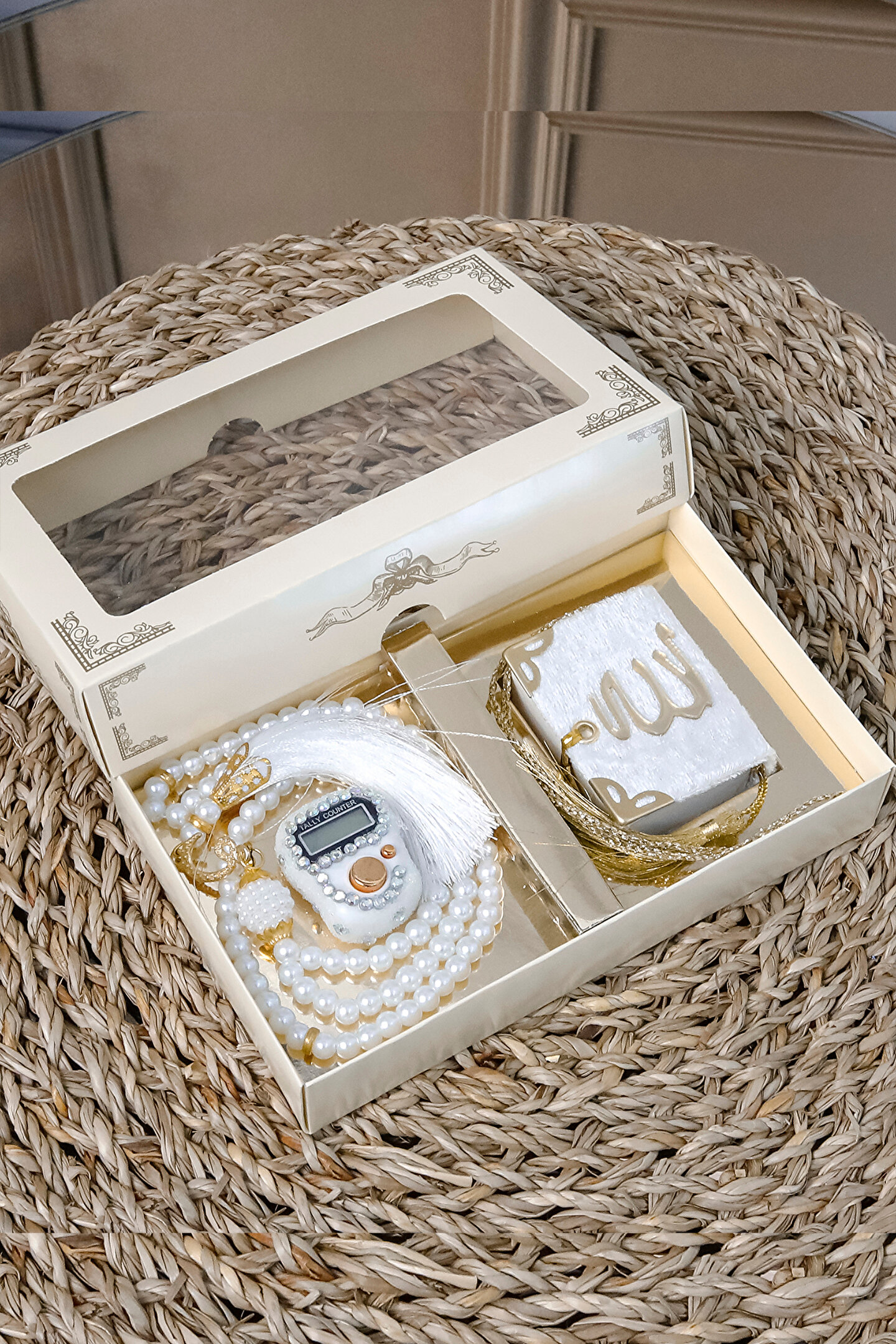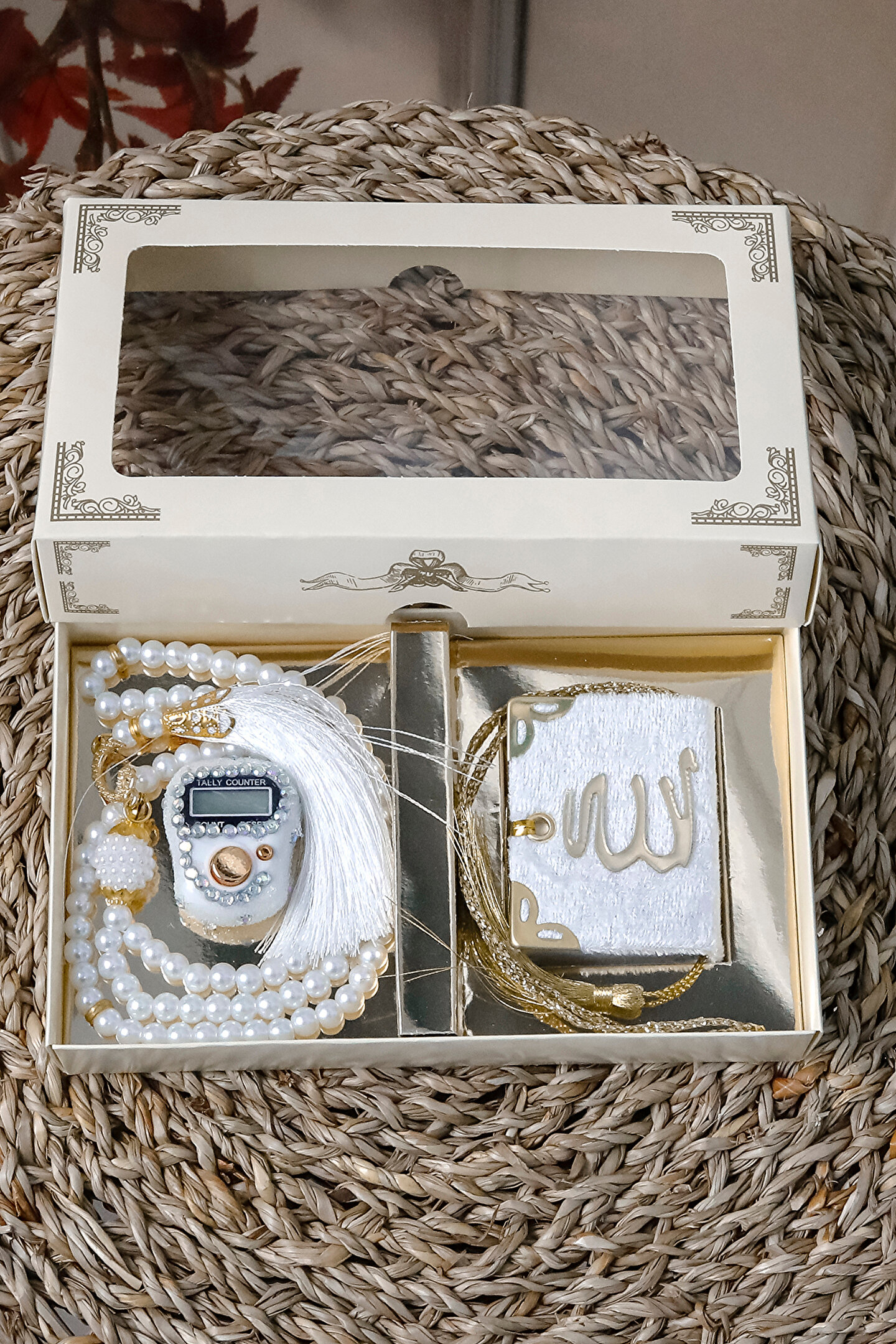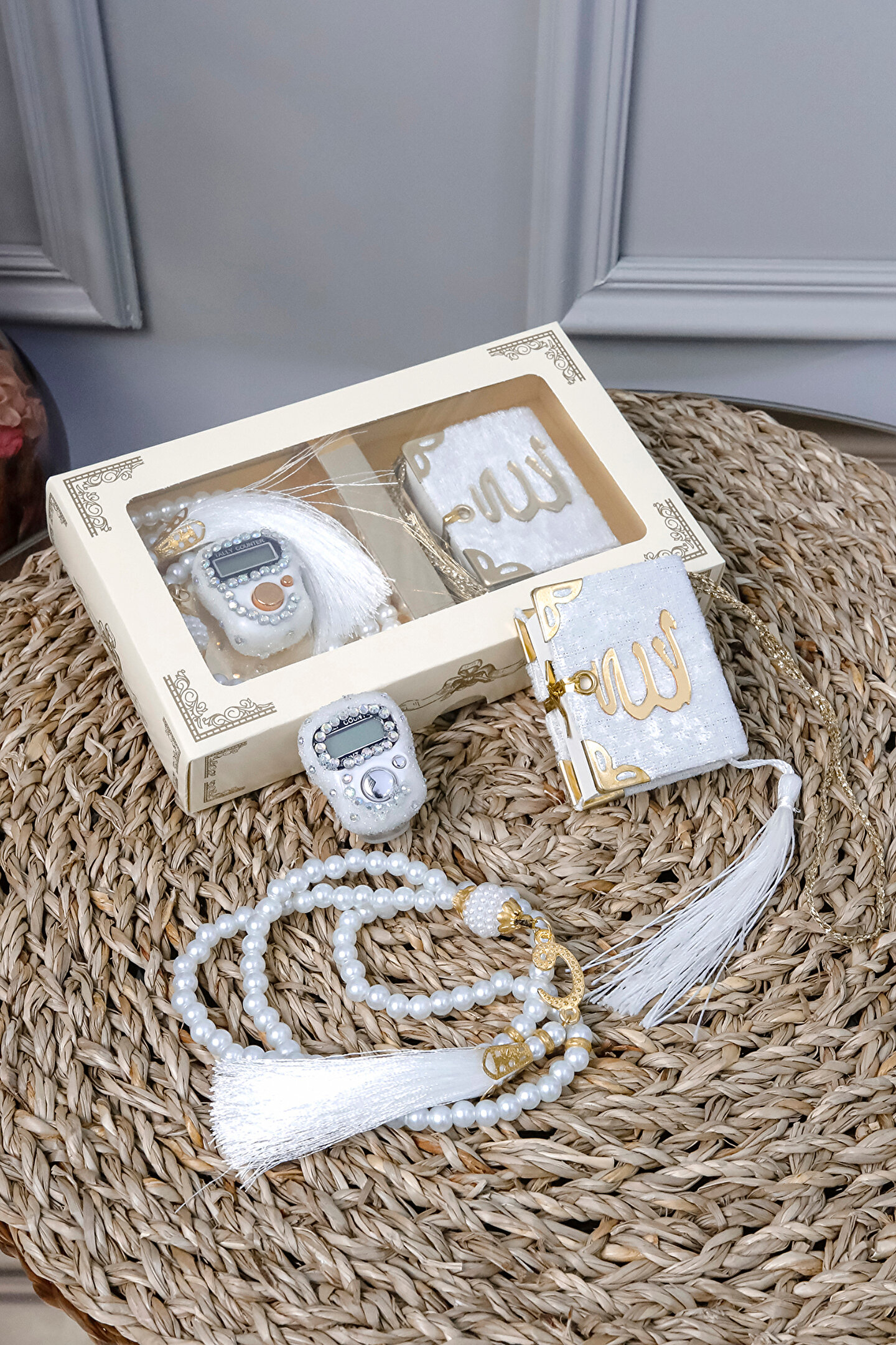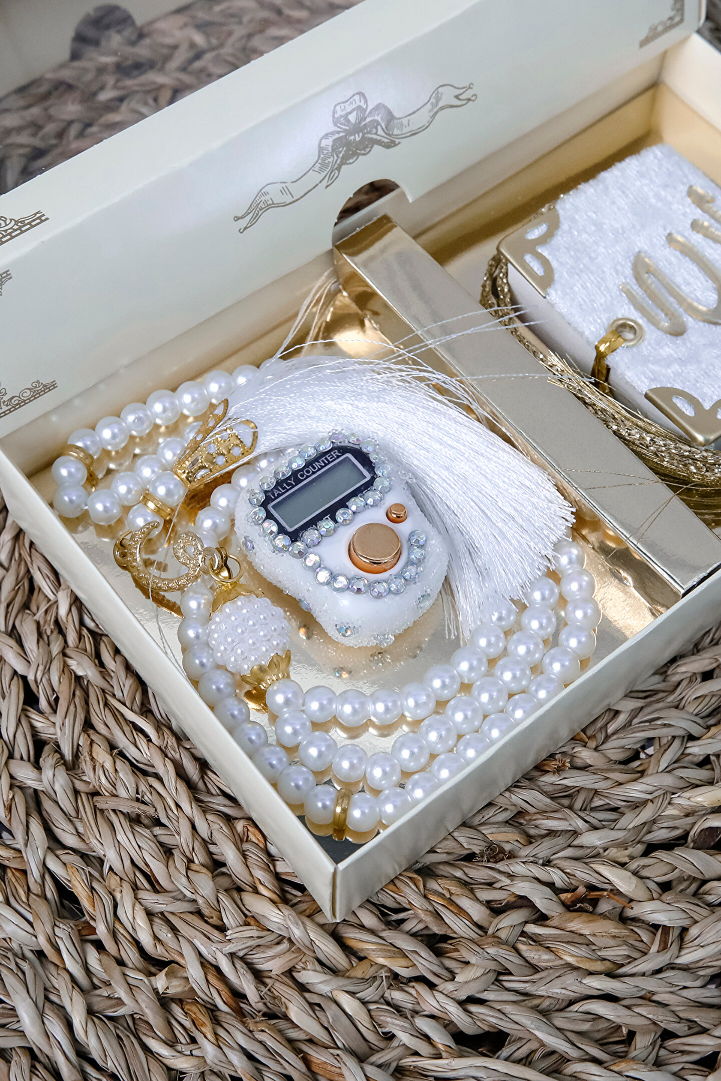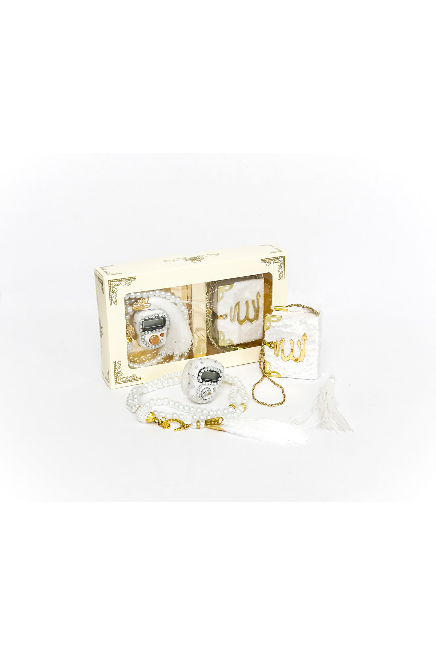 Taşlı Zikirmatik Tesbihmatik Kadife Kaplı Mini Kuran 99lu İnci Tesbih Seti Söz Nişan Mevlid Hac Umre Davet Hediyesi Her siparişte 10 adet gönderilecektir. ; Ürün Özellikleri :1 Adet Püsküllü 99lu İnci Tesbih 1 Adet Kadife Kaplı Gold Korumalıklı Allah cc Lafızlı Mini Kuranı Kerim1 Adet Swaroski Taşlı Elektronik Yüzük ZikirmatikSüslü Asetat Kutu Özellikleri: 16,5 x 10 x 3 CM KUTU108 GRAM Taşlı Zikirmatik Özellikleri :Swaroski Taşlı Elektronik Yüzük Zikirmatik (Numaratör)5 Hanelidir99999'a Kadar SayarParmağa Yüzük Gibi Takılarak Zikir Çekilebilir.LCD EkranlıHafızalıdır, Bıraktığınız Sayıdan Zikrinize Devam EdebilirsinizTeknolojik Tesbih ile Avucunuzun İçinde Tesbih ÇekinTavaf Yaparken, Yürürken, Otobüste, Arabada Kullanabilirsiniz. ; 99'lu Kristal Taşlı Tesbih Özellikleri :99'luPüsküllüKristal Taşlı Kadife Kaplı Mini Kuranı Kerim Özellikleri : Kadife KaplıGold Köşe KorumalıAllah cc Lafızlı5 x 5 cm;