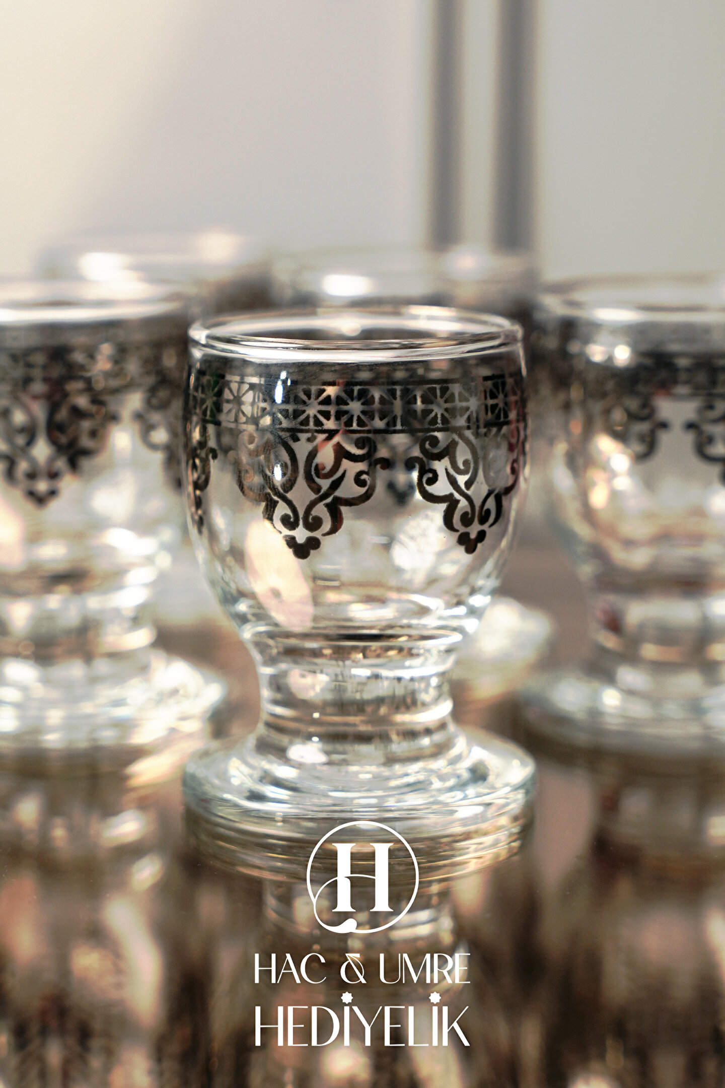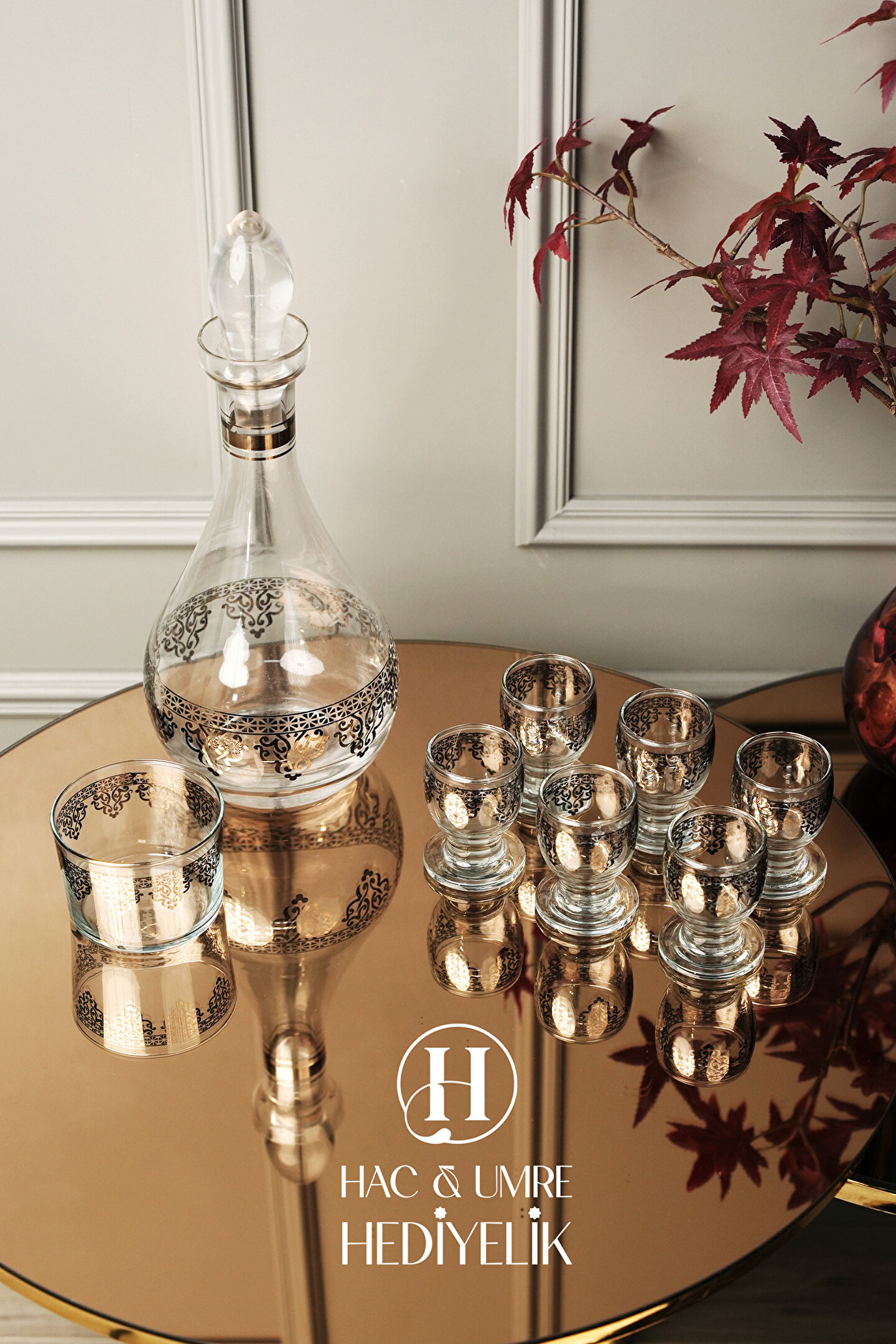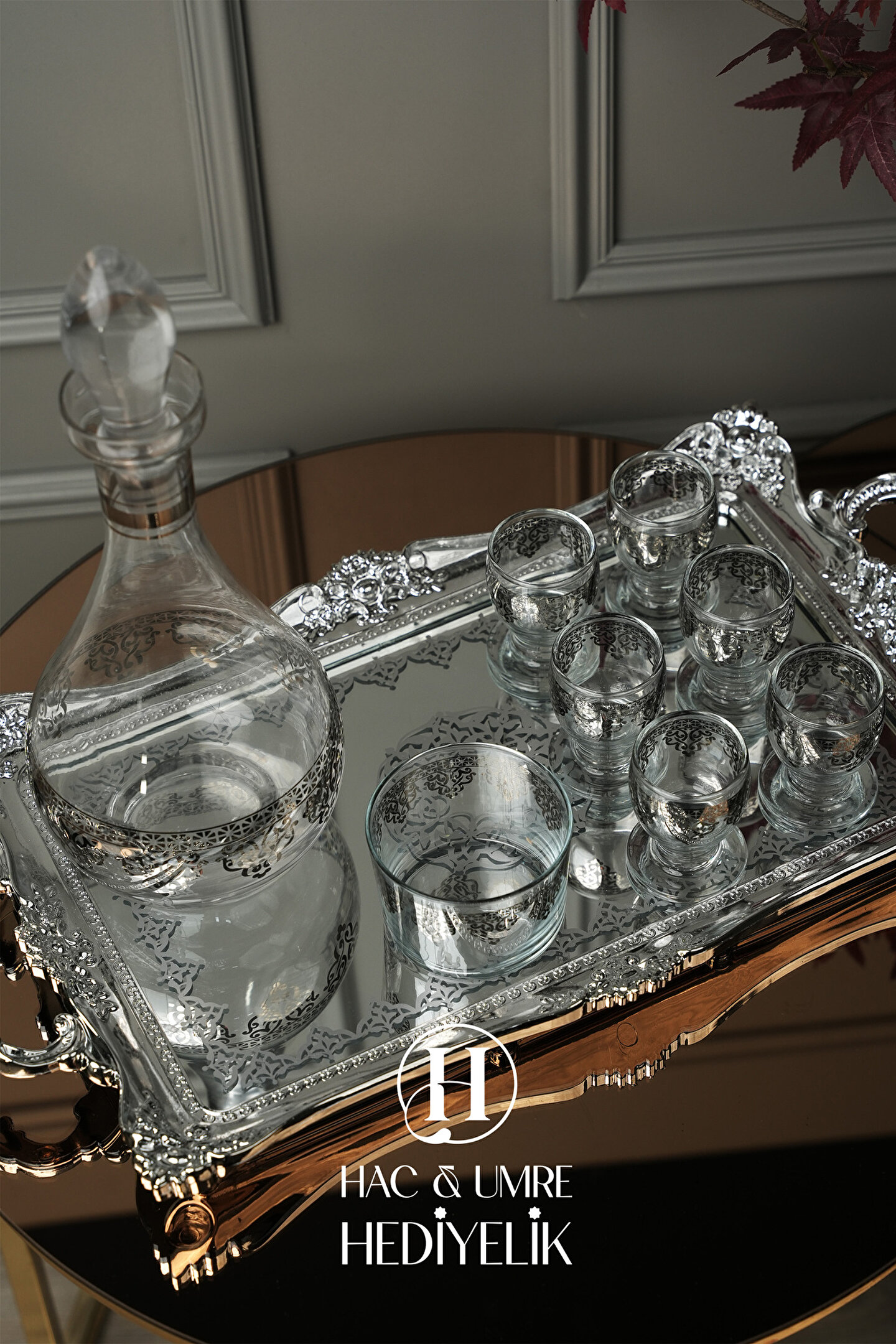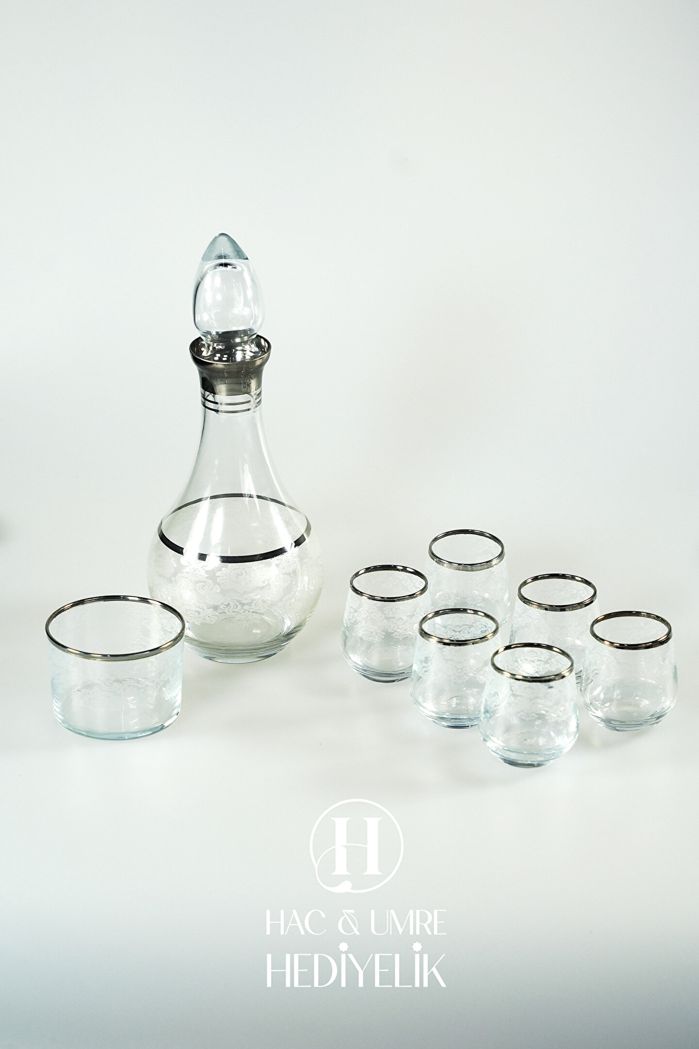 Hac Umre Hediyelik Cam Sunum Takımı 8 Parça | Gümüş Dekoratif Karaf Seti | Lüks İkram Takımı | Zemzem Sunum Seti