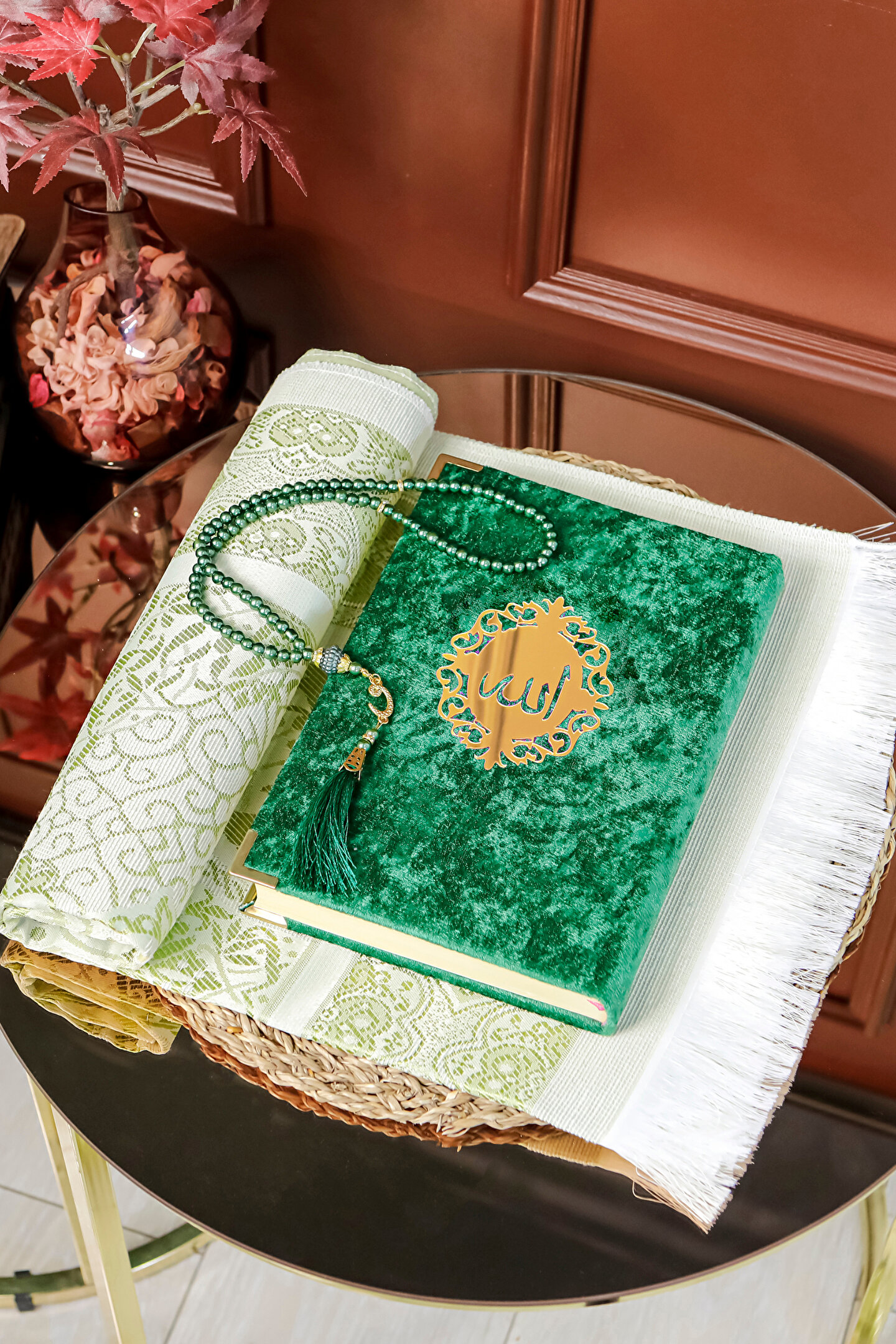 Ahşap Hediyelik Kuran Kutusu - Lüks Kuran Okuma Sehpası - Rahleli Kuran Seti ? Dekoratif Kuran Kutusu Setimiz, Hafız Osman Hattı Kadife Kaplı Kur'an-ı Kerim, Seccade ve 99'lu İnci Tesbihden oluşan eşsiz seti içeriyor. Kuranınızı dekoratif kabında saklayan kutu; mekanizması sayesinde dilendiğinde okuma standı/rahleye dönüşebiliyor. Ürün Özellikleri: Ahşap Rahle Mekanizmalı Kutu: 37x28x8,5 cm Orta Boy Kuranı Kerim, 99'lu Vav Harfli İnci Tesbih Goblen Simli Seccade: 100x65 cm