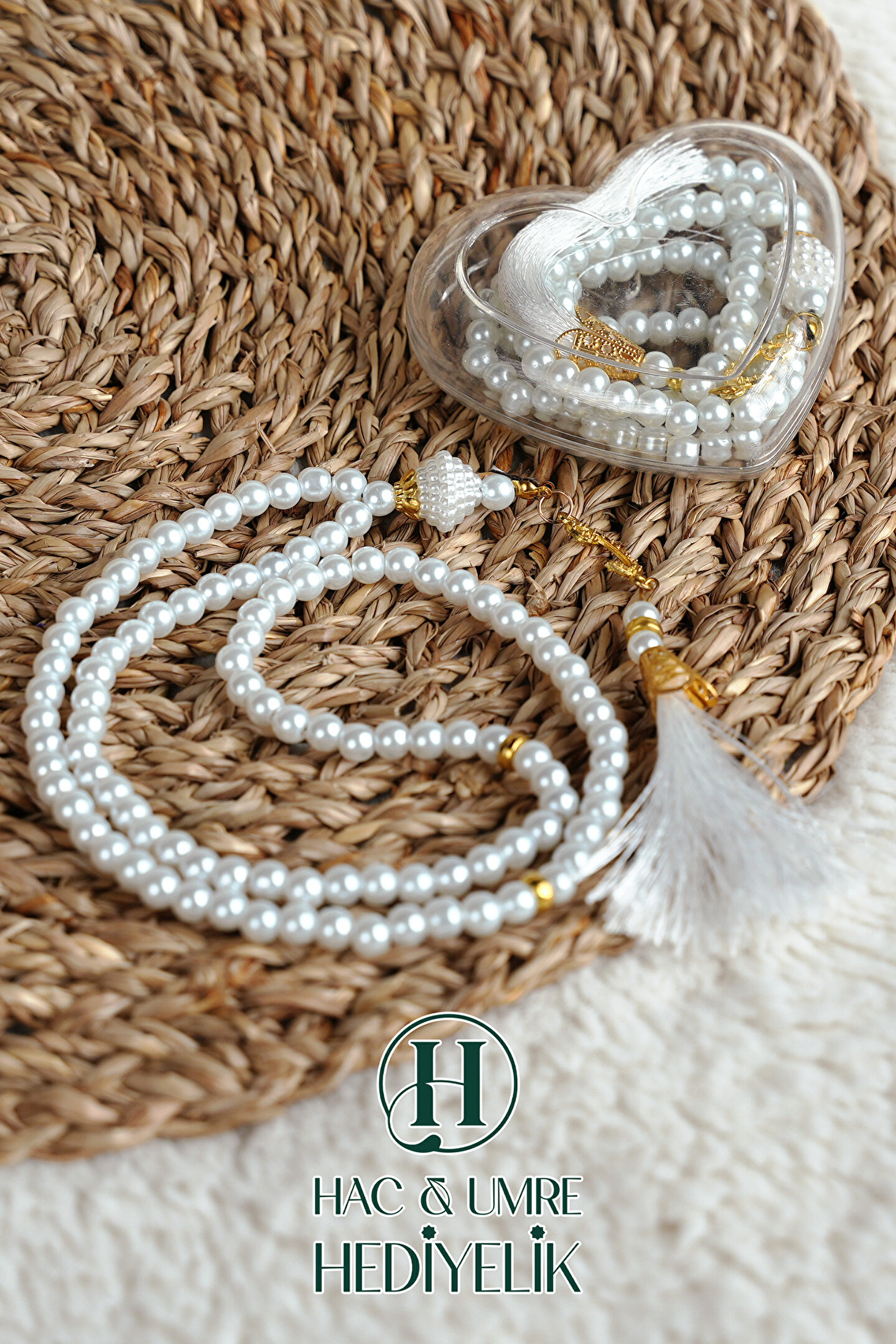 Hac Umre Hediyelik Hediyelik Tesbih | 99lu İnci Tesbih Vav İmameli Püsküllü Kalp Kutulu | Hac Umre Gün Davet Hediyesi