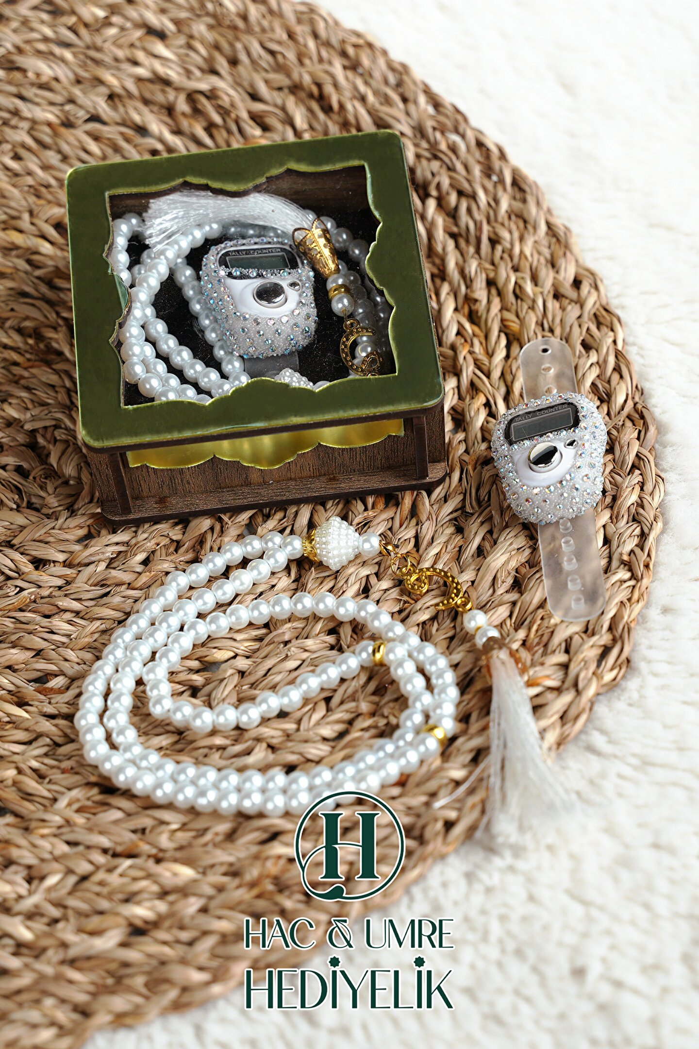 Hac Umre Hediyelik Hediyelik Tesbih Seti | Ahşap Kutulu Elektronik Tesbih ve 99lu İnci Tespih | Özel Gün Hediyesi