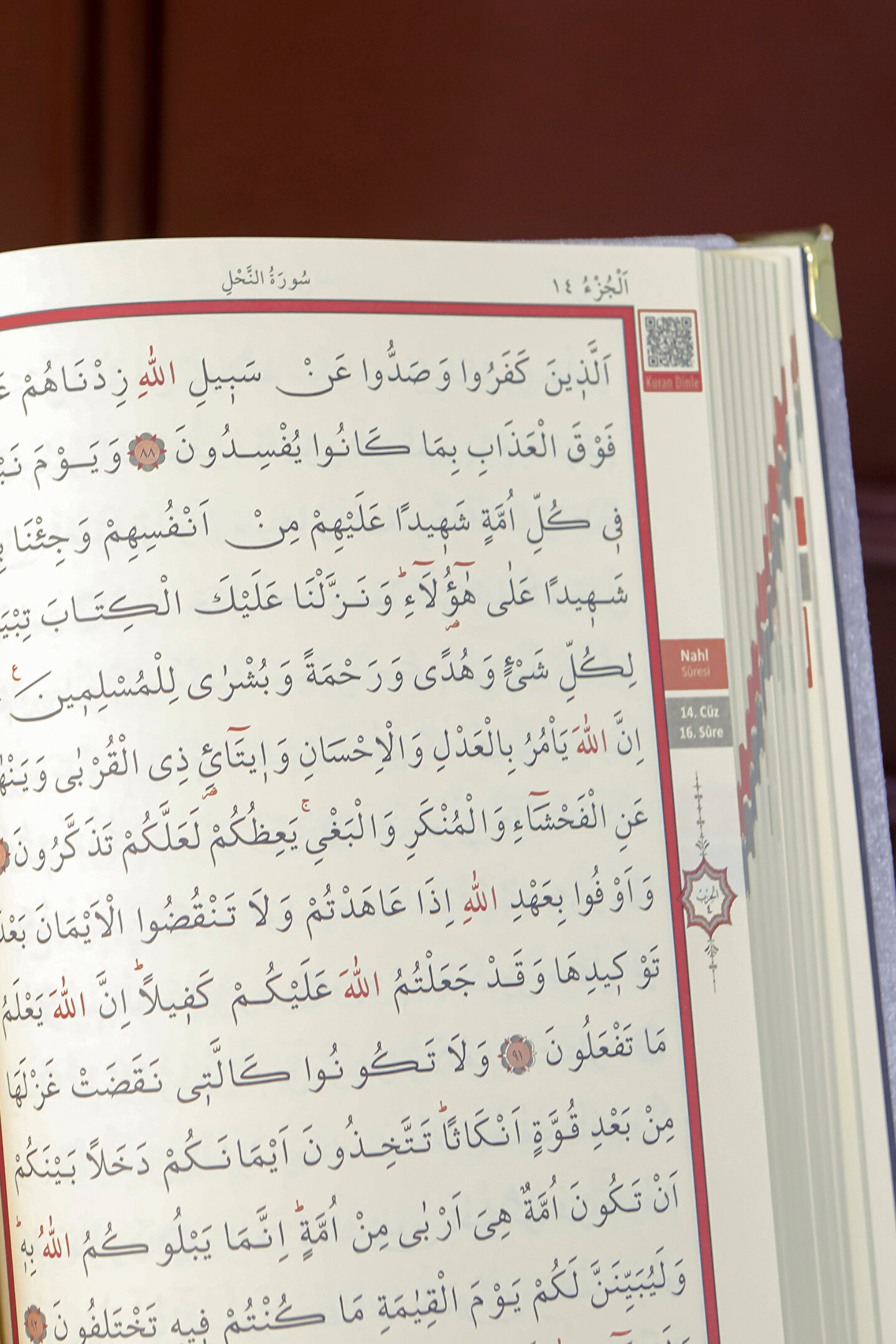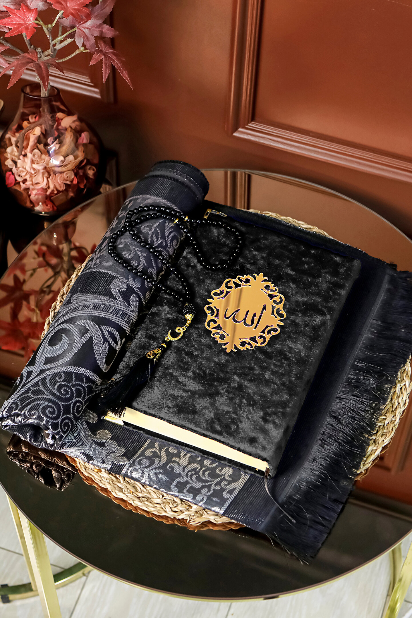 Ahşap Hediyelik Kuran Kutusu - Lüks Kuran Okuma Sehpası - Rahleli Kuran Seti ? Dekoratif Kuran Kutusu Setimiz, Hafız Osman Hattı Kadife Kaplı Kur'an-ı Kerim, Seccade ve 99'lu İnci Tesbihden oluşan eşsiz seti içeriyor. Kuranınızı dekoratif kabında saklayan kutu; mekanizması sayesinde dilendiğinde okuma standı/rahleye dönüşebiliyor. Ürün Özellikleri: Ahşap Rahle Mekanizmalı Kutu: 37x28x8,5 cm Orta Boy Kuranı Kerim, 99'lu Vav Harfli İnci Tesbih Goblen Simli Seccade: 100x65 cm